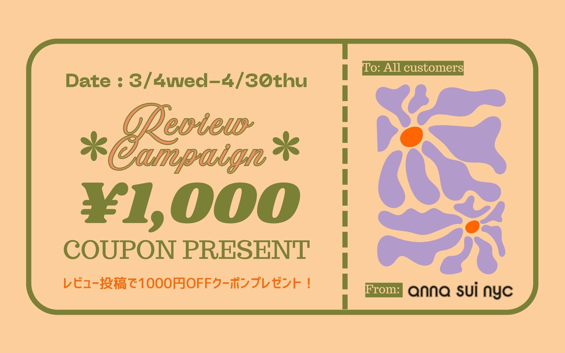 ただいまメールマガジンにご登録いただくと、500ポイントプレゼント!ANNA SUI NYCの最新情報やお得なキャンペーンを配信します。