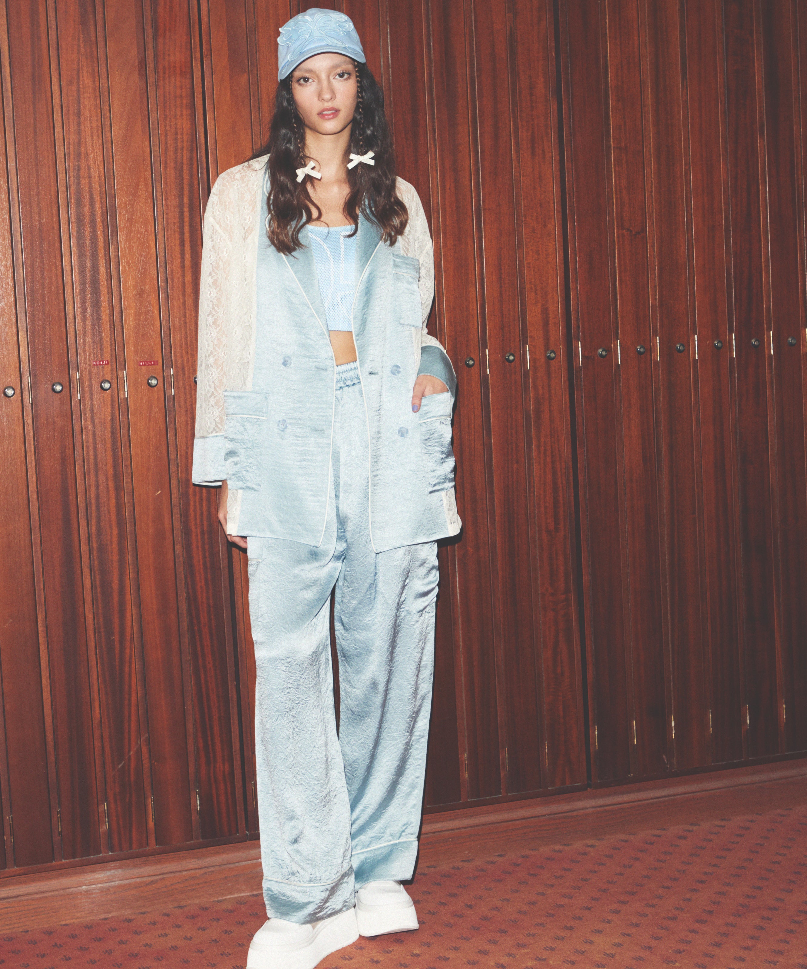 パジャマライクなリラックスシルエットに、ダブルブレストの仕立てをのせた絶妙バランス。袖と身頃には、繊細なレースをあしらい、ジャケットデザインでも軽やかに羽織れます。リラックス感の中に、女性らしいニュアンスがふわりと香る、新しい“軽アウター”。