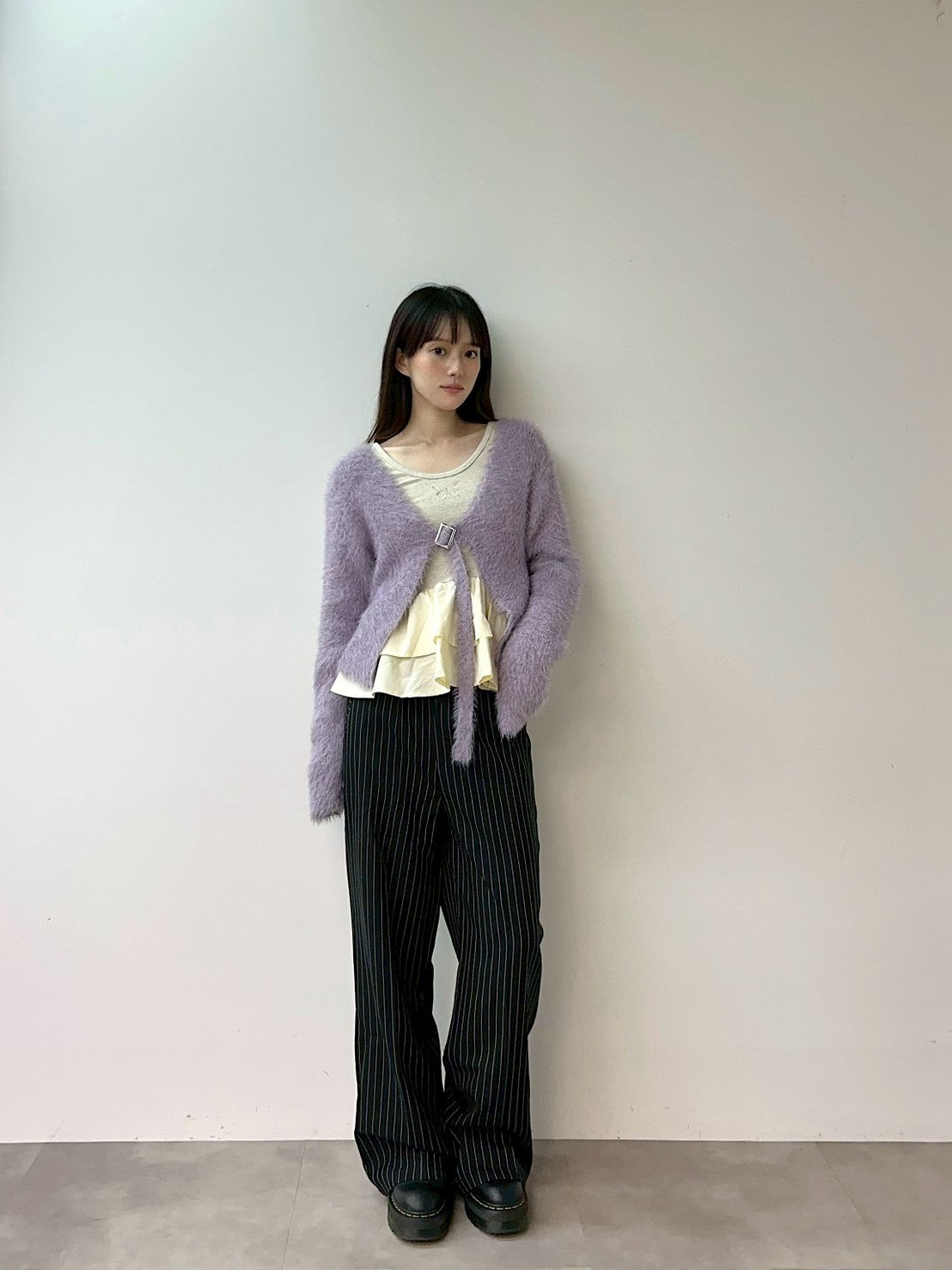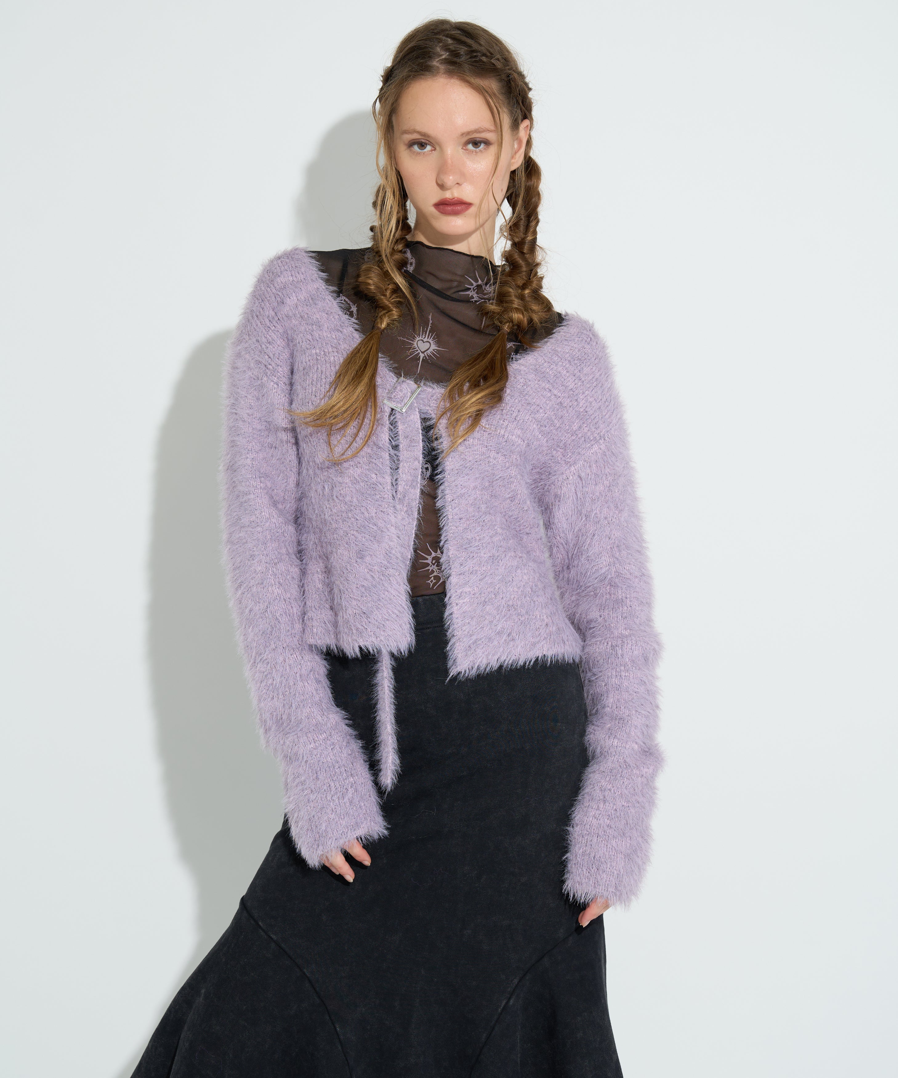 シャギー糸で仕立てた、優しいニュアンスが魅力のクロップドカーディガン。フロントのベルトディテールがさりげないアクセントとなり、羽織るだけでスタイリングが引き締まります。さらに、前後2WAY仕様で着用できるのも嬉しいポイント。カーディガンとしてはもちろん、プルオーバー風に着こなすことで印象を変え、幅広いスタイリングに対応します。