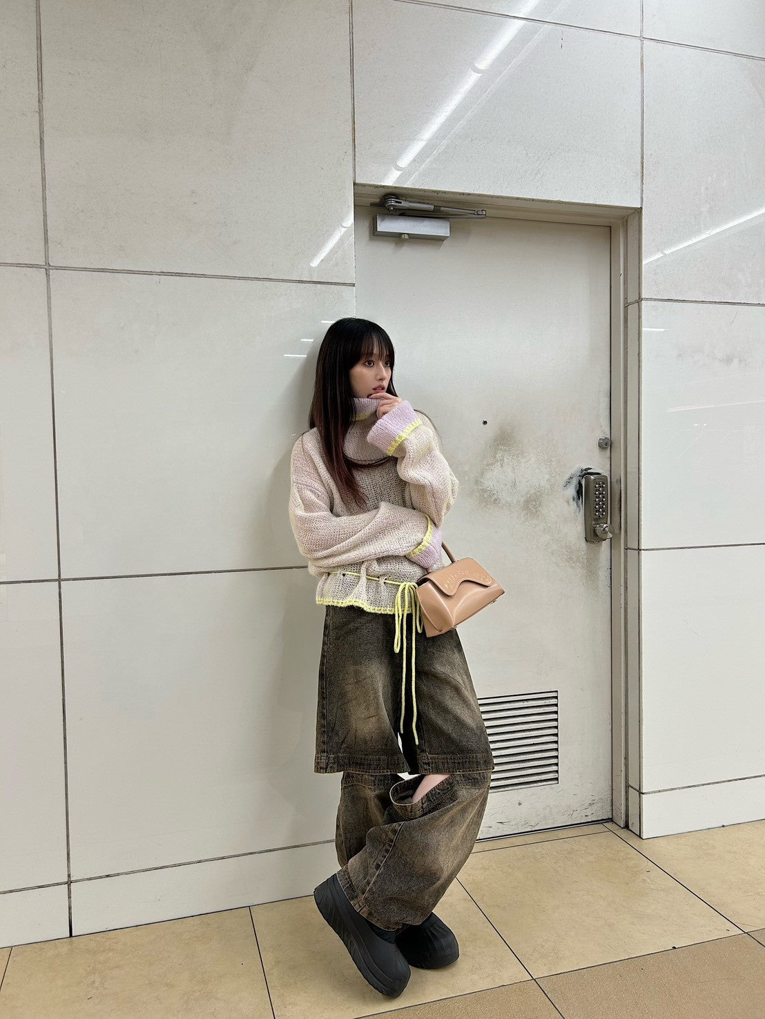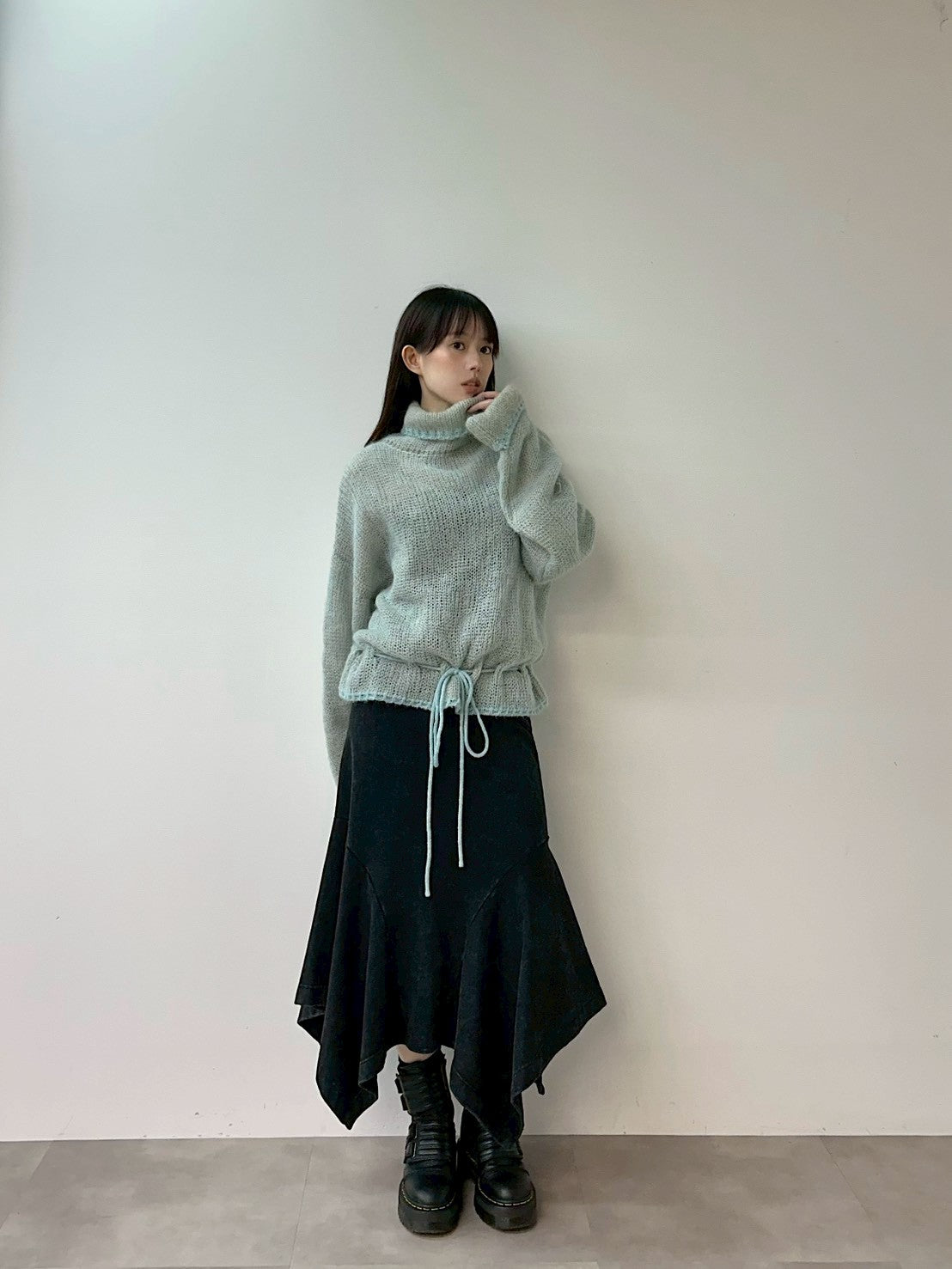 やわらかな雰囲気が魅力のタートルニット。表糸と裏糸を配色にすることで生まれる繊細な色合いが、淡く優しいニュアンスを引き立てます。衿端や袖口にあしらった配色ラインもさりげないアクセントとなり、シンプルながらも存在感のあるデザインに。さらに、裾にはリボンディテールをプラスし、スタイリングにフェミニンなムードを添えています。リボンを絞ってシルエットに変化をつけるなど、アレンジも楽しめる一枚。