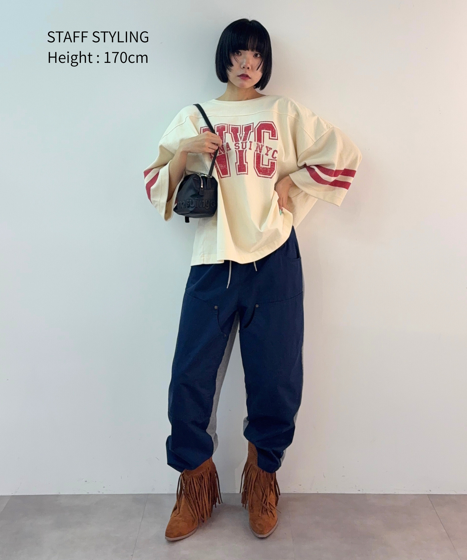 袖の配色ラインがアクセントになり、一枚でさらりと着ても手抜き感のないスタイリングが完成します。