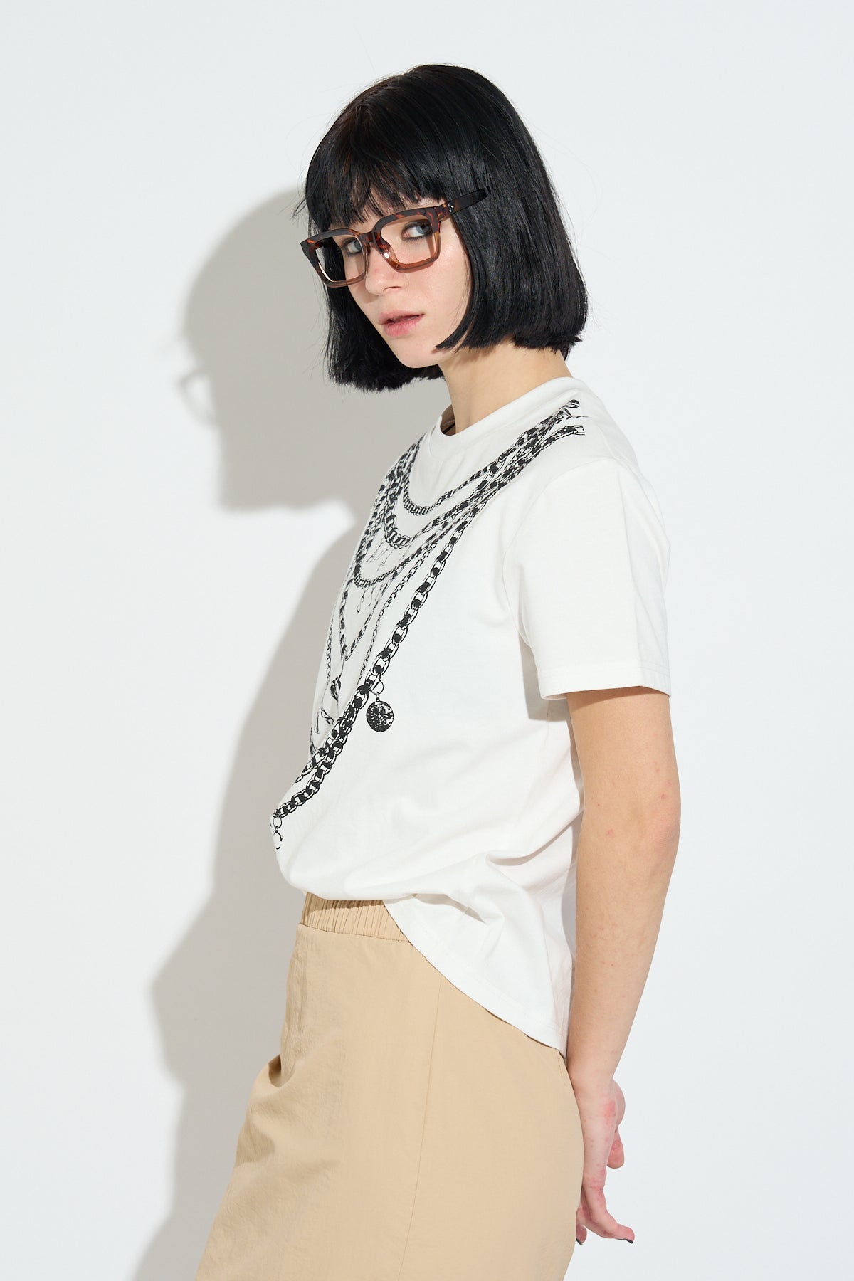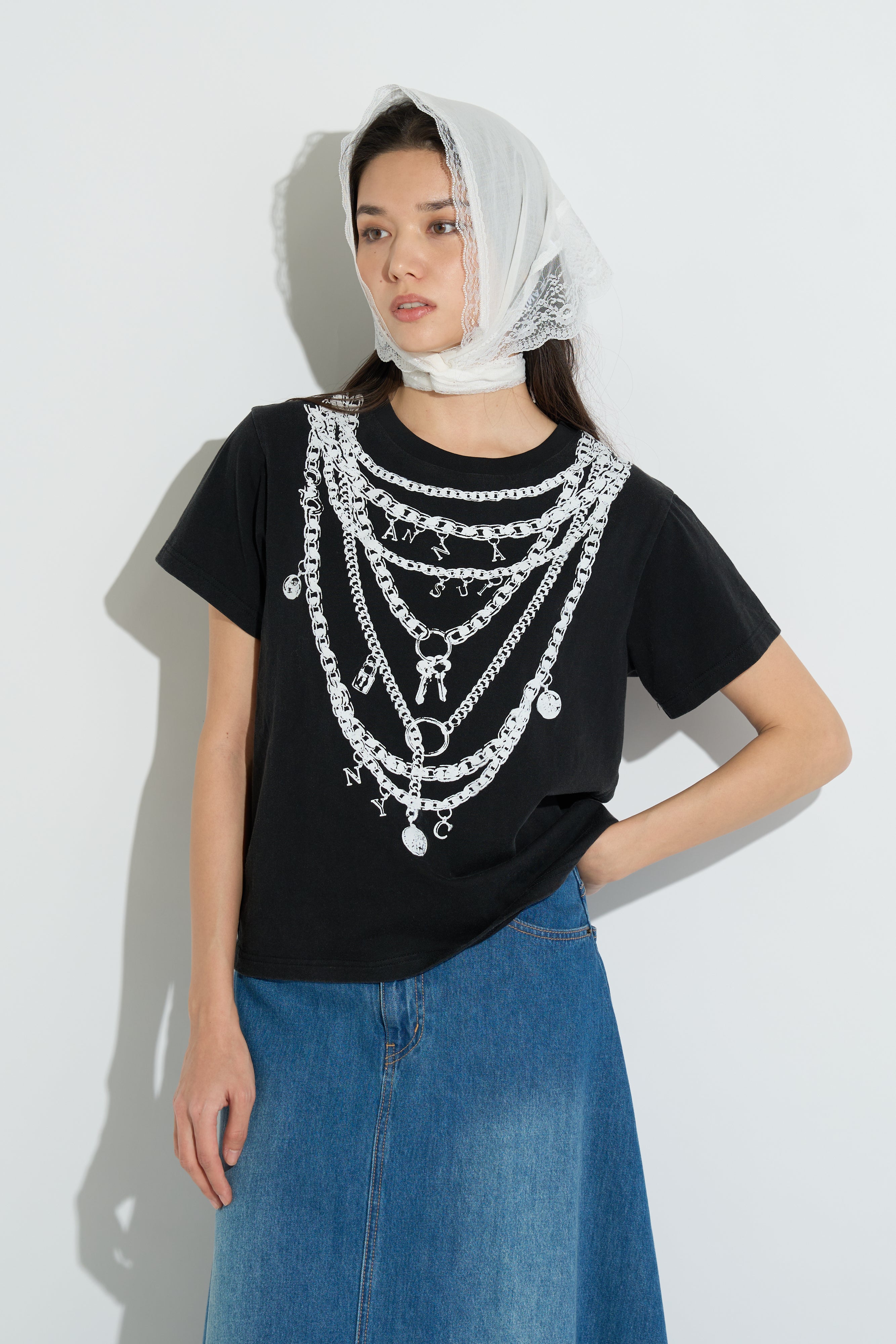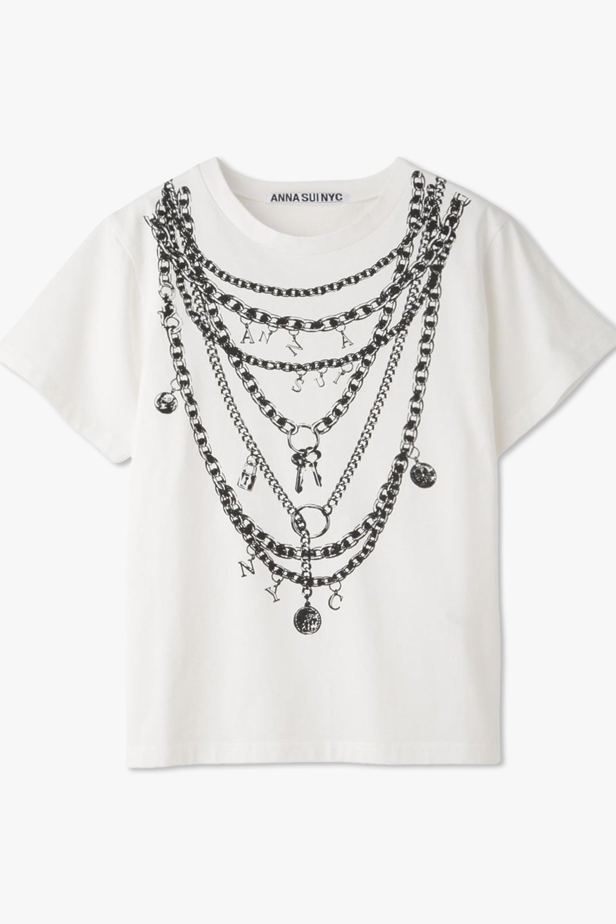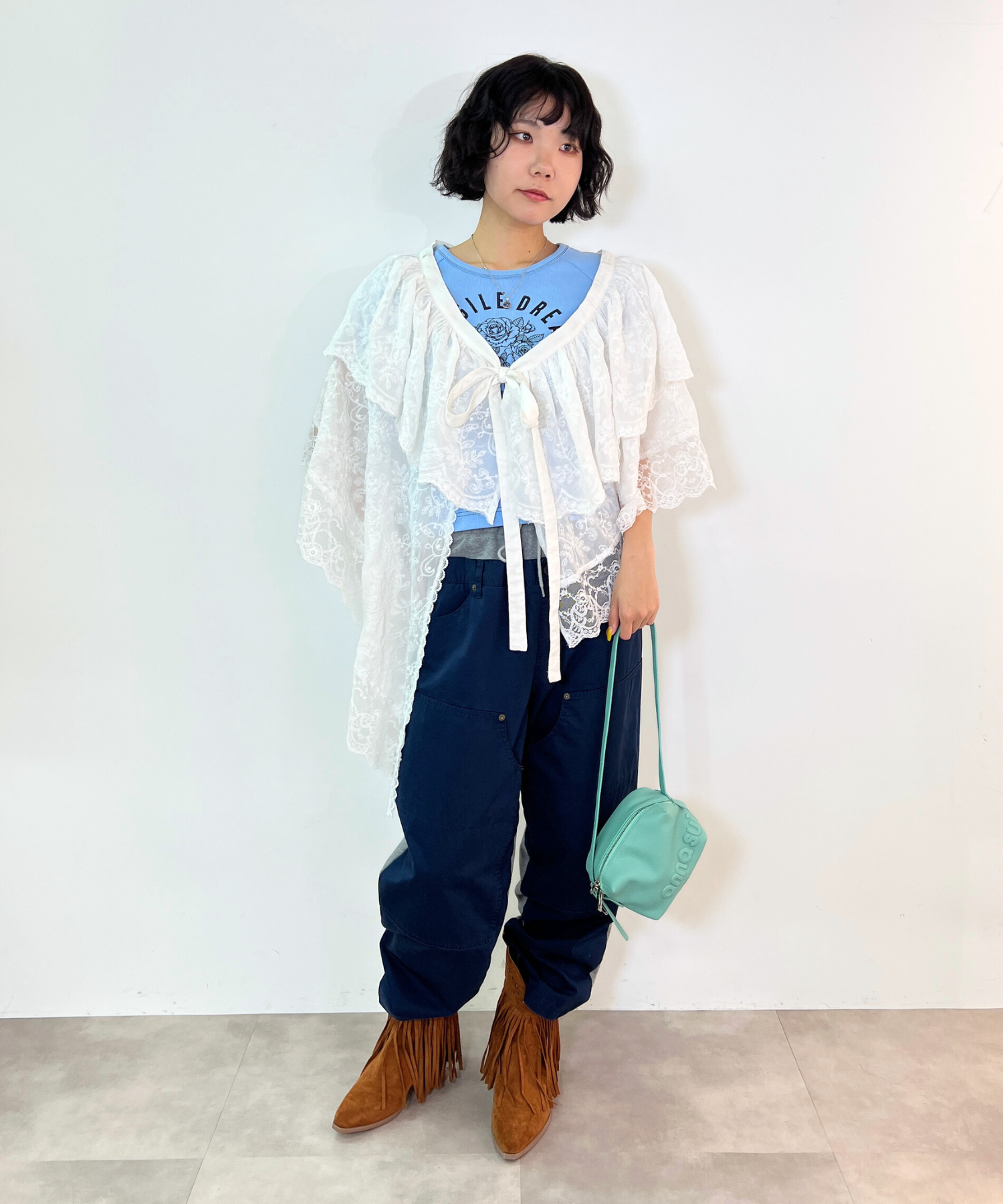 カジュアルなTシャツスタイルに一点足すだけで、華やかさを一気にプラス。
