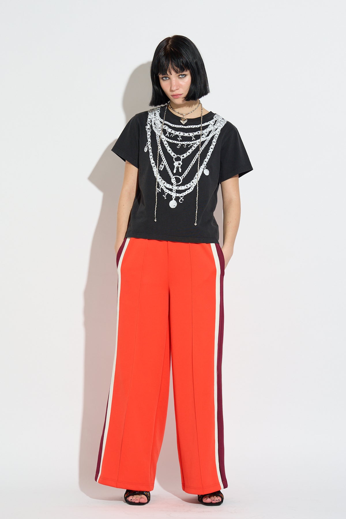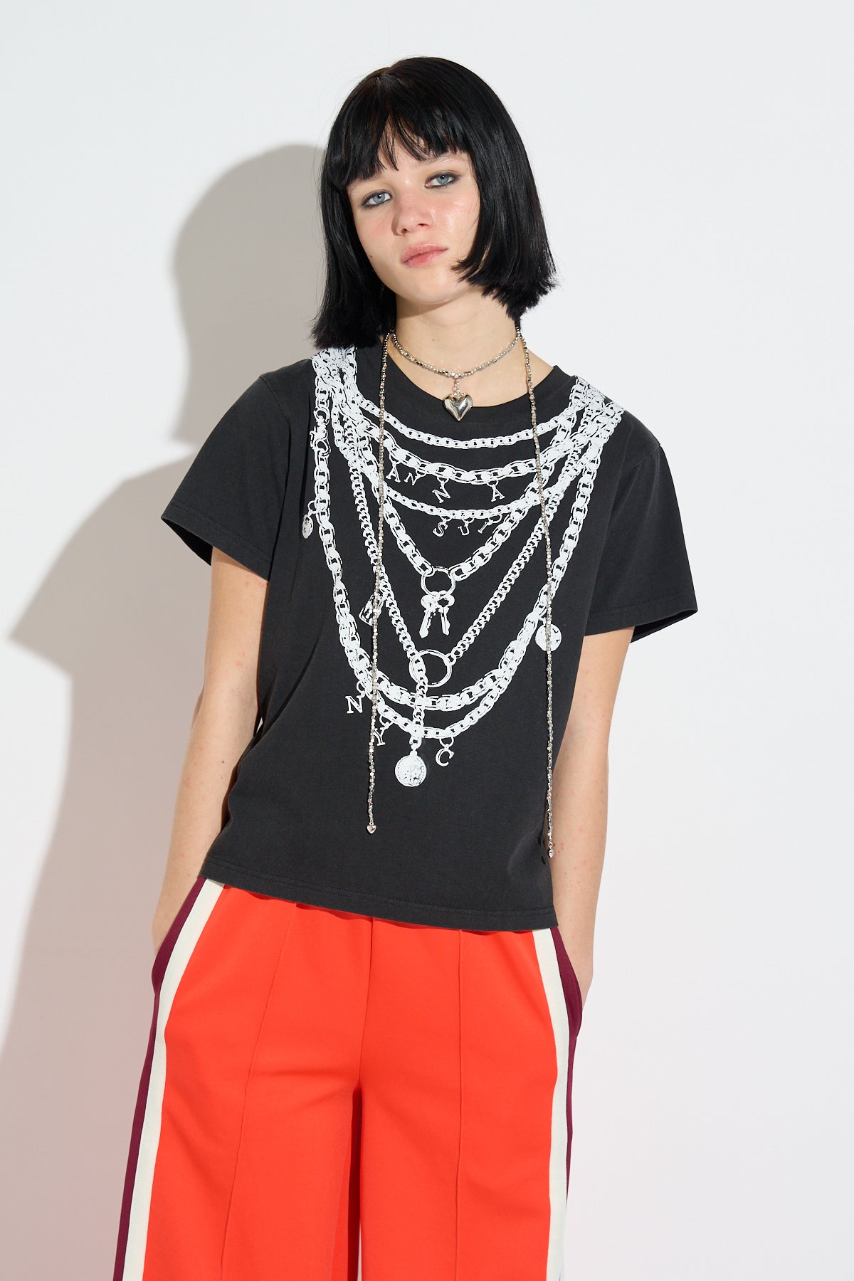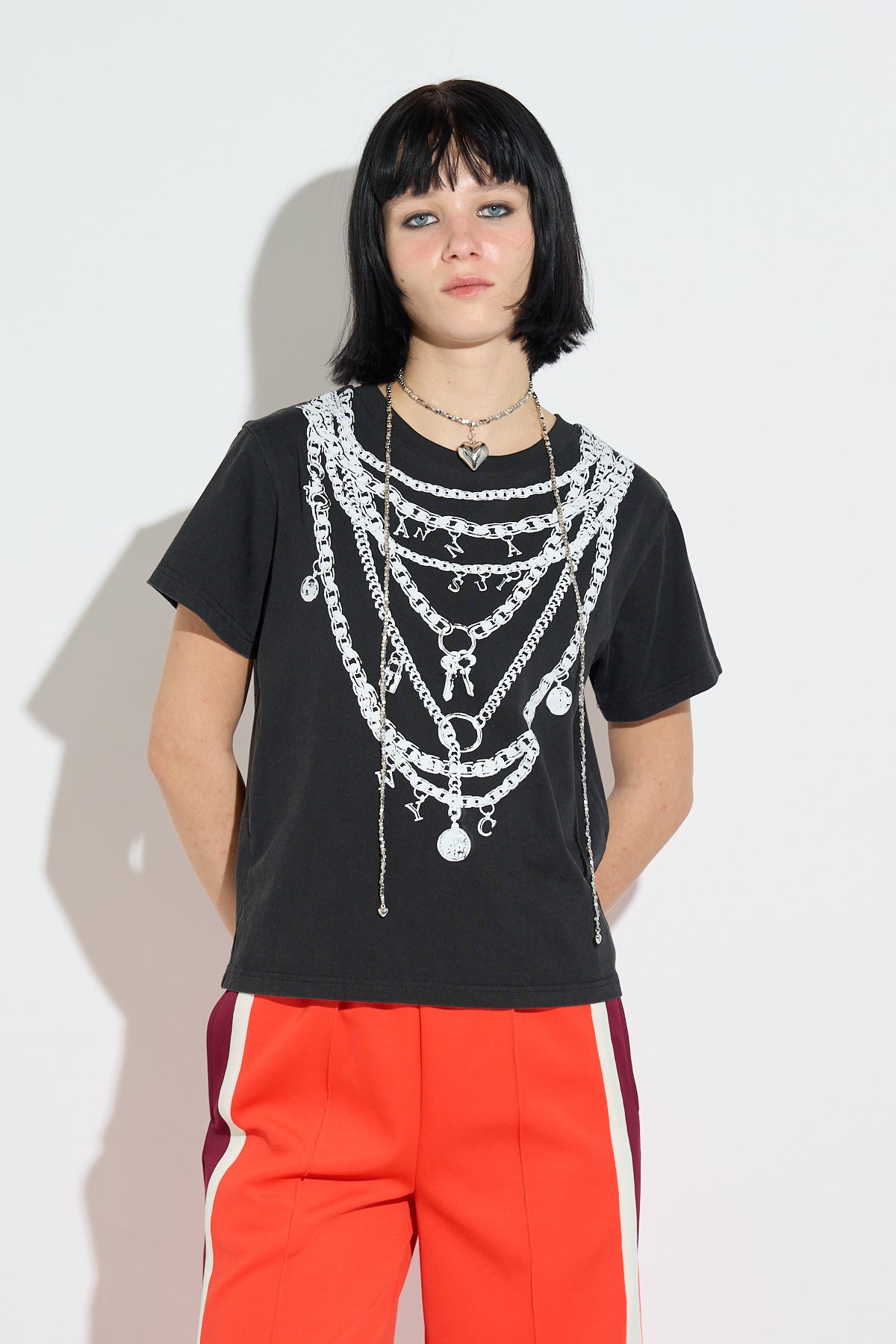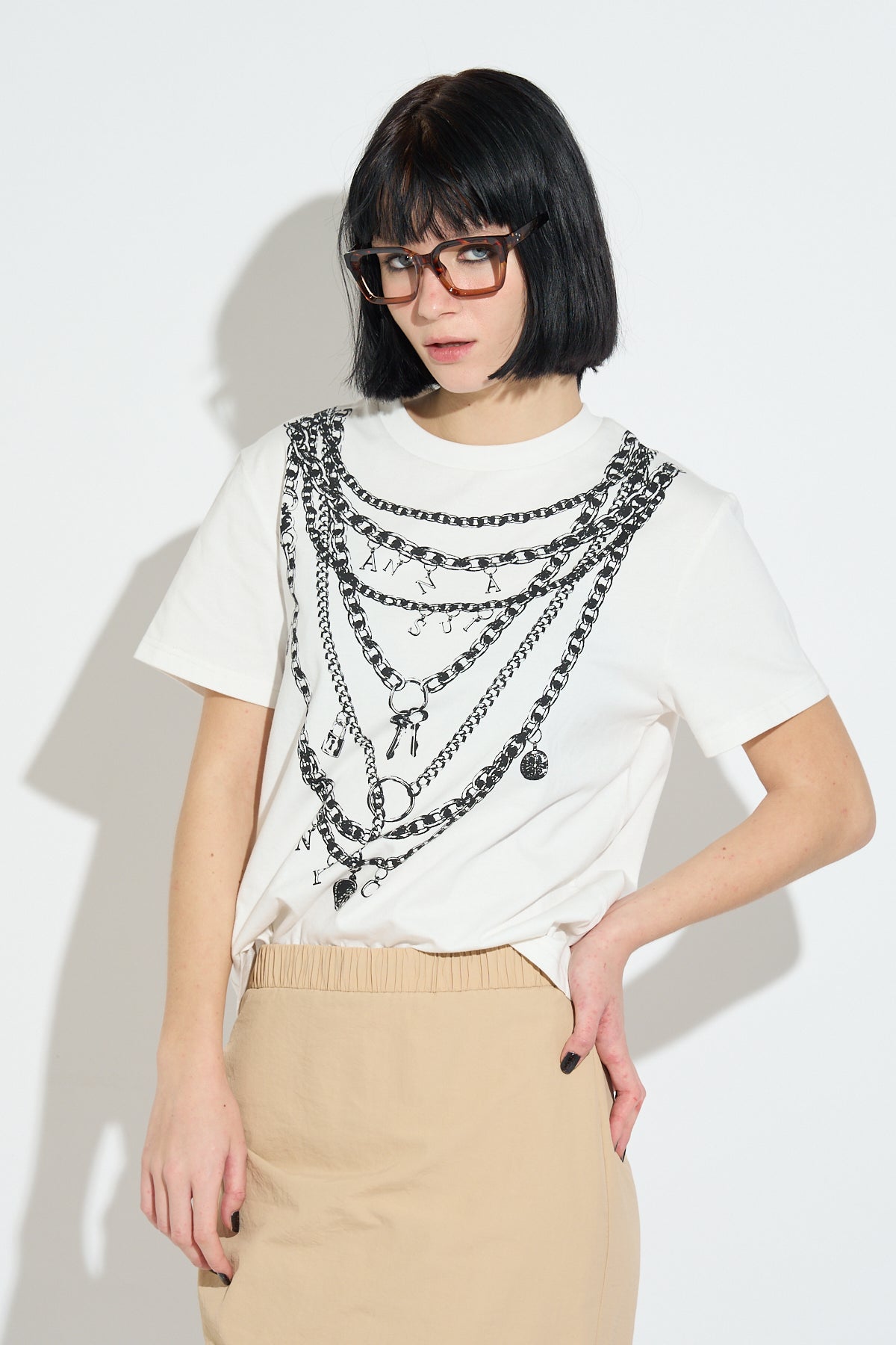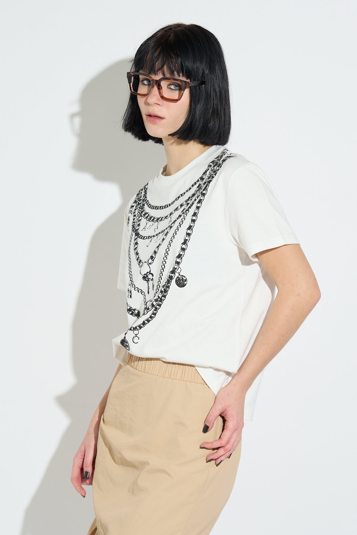カジュアルなTシャツスタイルに一点足すだけで、華やかさを一気にプラス。