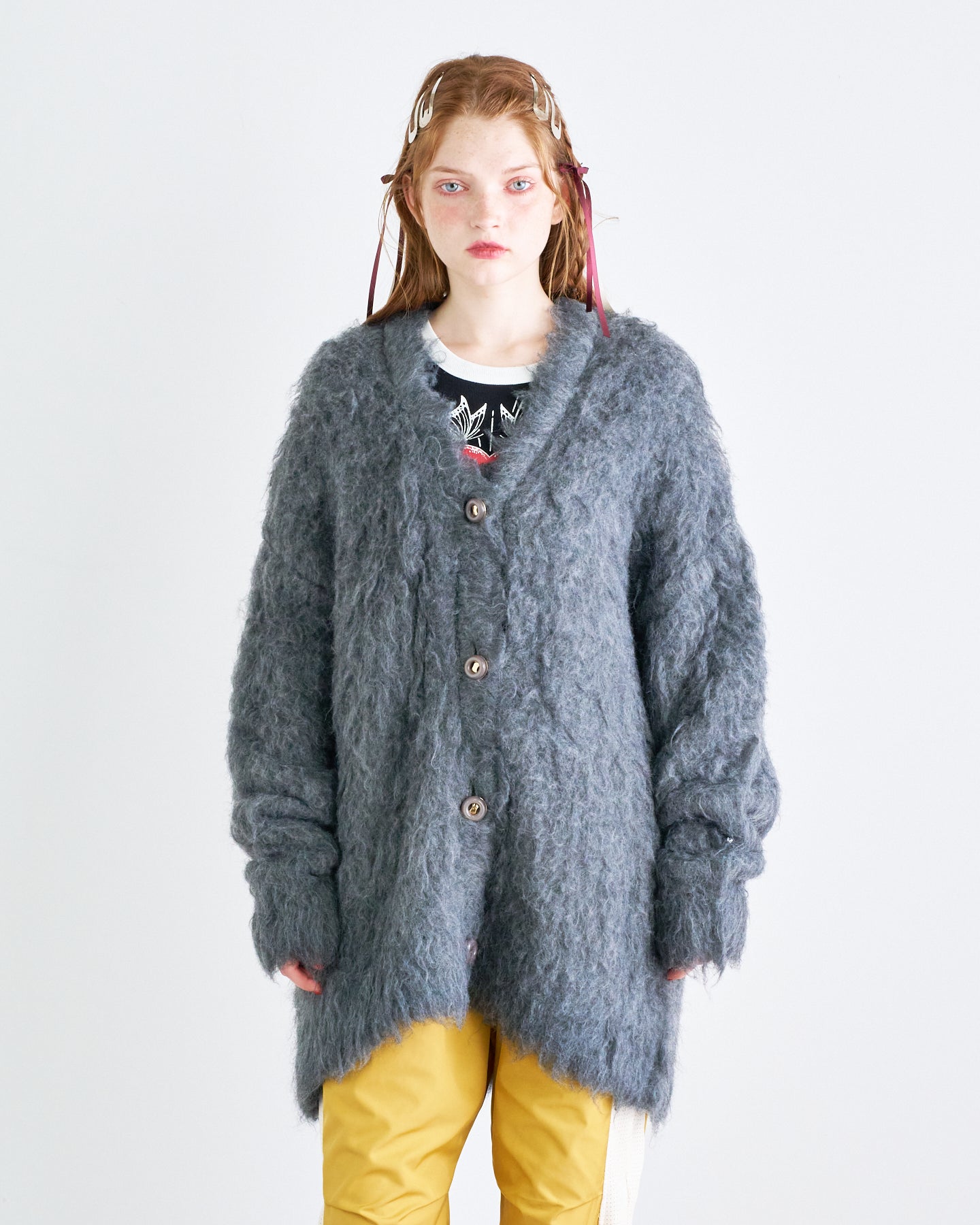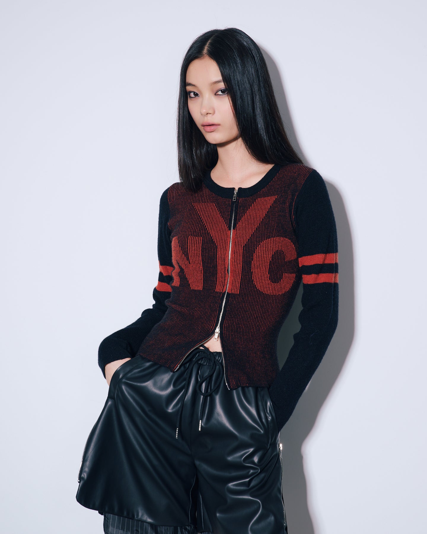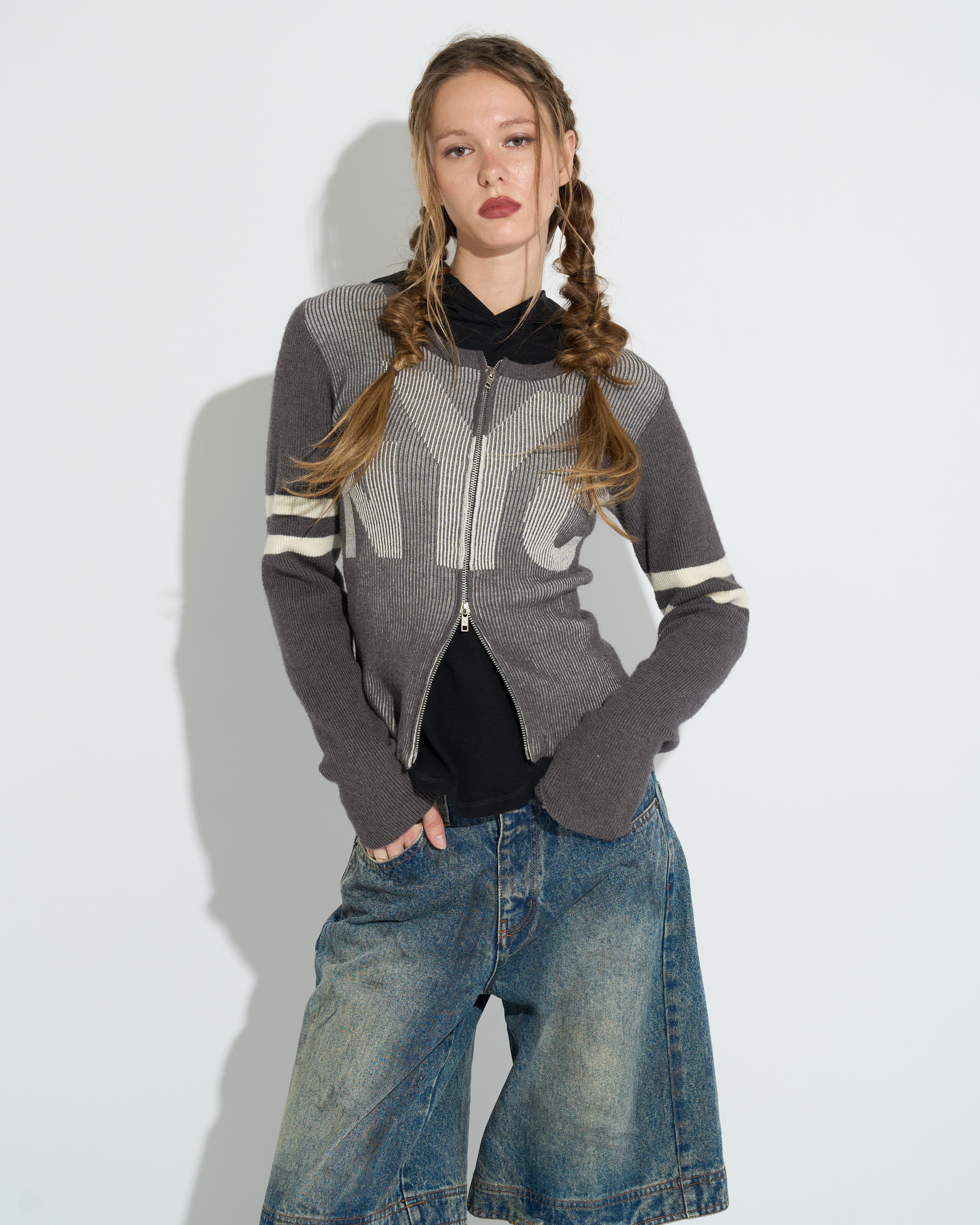 カーディガンのファスナーはダブルジップで、スタイリングに合わせて開けたり閉めたり、自由自在に開きのバランスを調節していただけます。