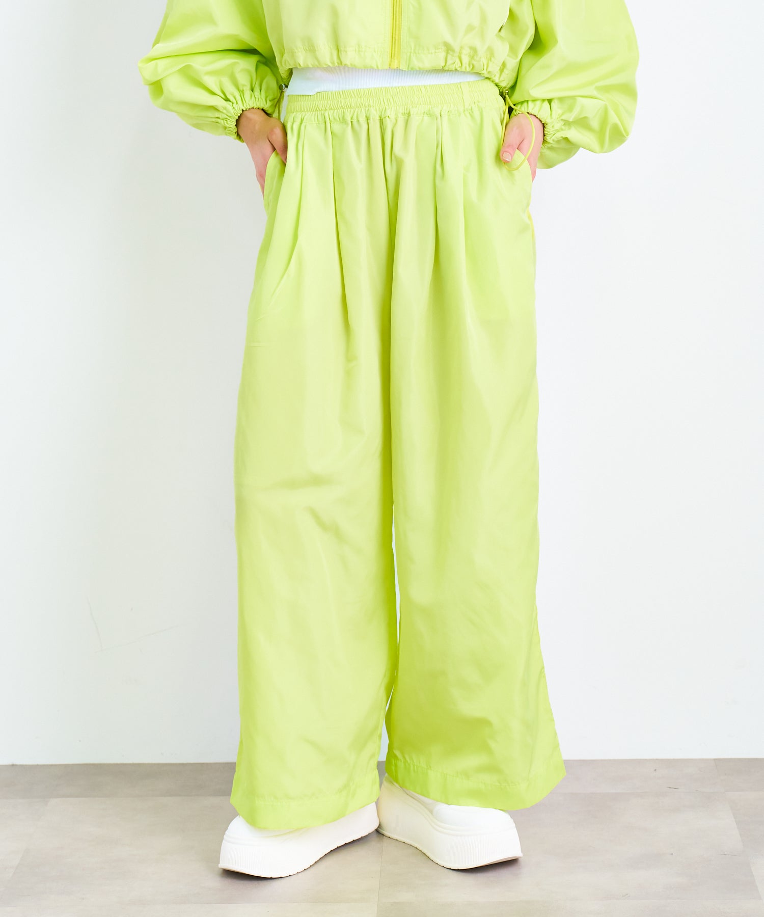 軽やかで動きやすいワイドシルエットが魅力のパンツ。サイドにはアクセントとなるテープラインをあしらい、スポーティなエッセンスをプラス。同素材の“バルーンショートブルゾン”を合わせるとより完成度の高いスタイリングを楽しんでいただけます◎