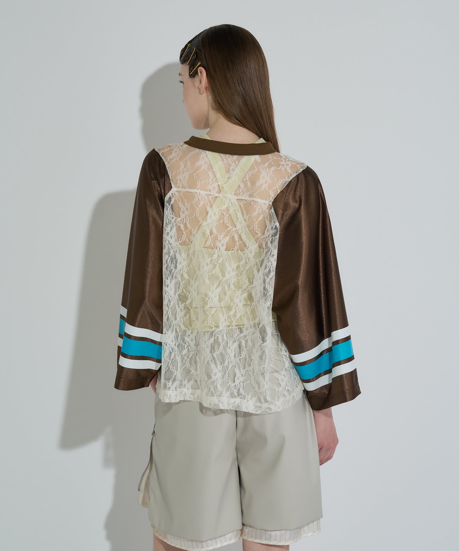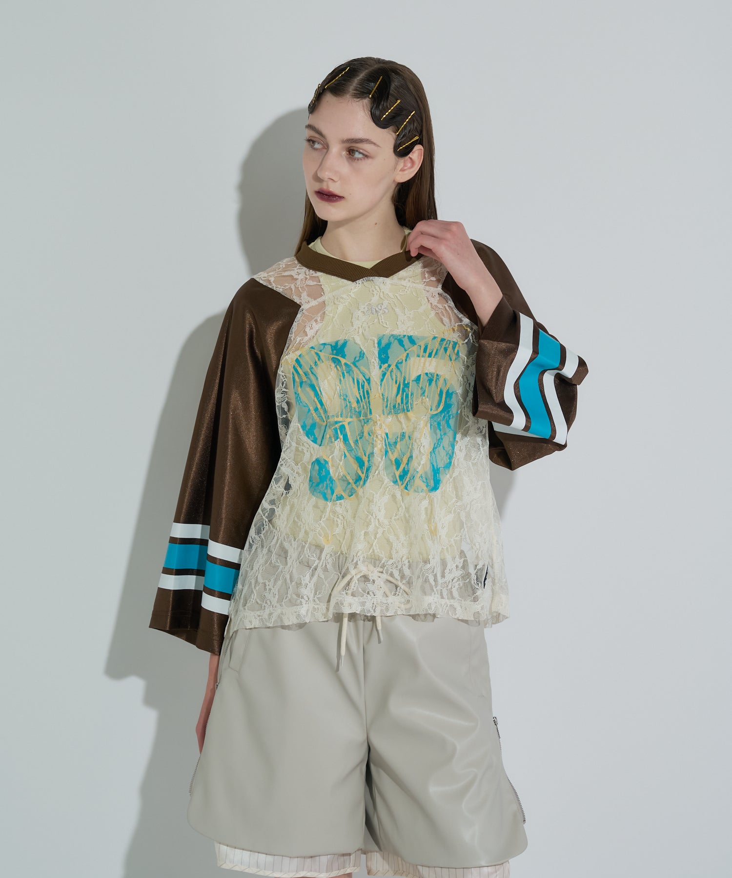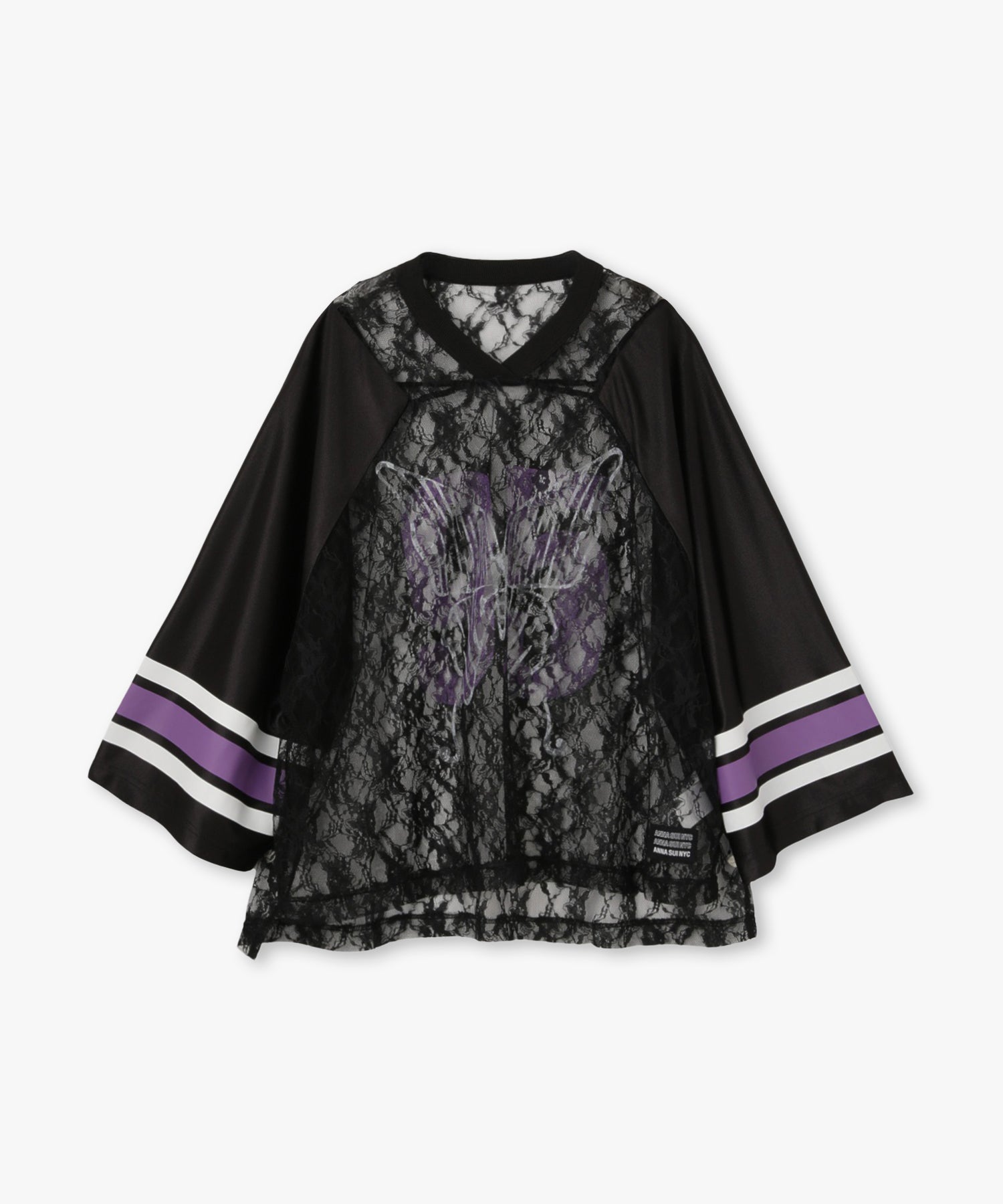 ANNA SUI NYC定番のゲームシャツにレースを合わせた、スポーティとセンシュアルなムードが共存する一着。透け感のあるレースの上に、大胆に配置されたナンバリングと蝶のモチーフプリントはストリート映え間違いなし。光沢感のあるユニフォーム風の素材やラインプリントなどのスポーティーなディティールと、繊細なレースのコントラストが新鮮なバランスを演出します。インナー次第で印象が変わるので、レイヤードでの着こなしも楽しめるアイテム。カラーはブラック・ブラウン・シルバーの3色展開。それぞれ異なる世界観を持つ、色違いで揃えたくなるラインナップです。