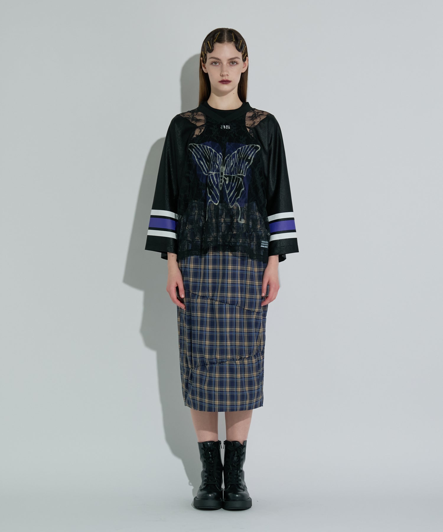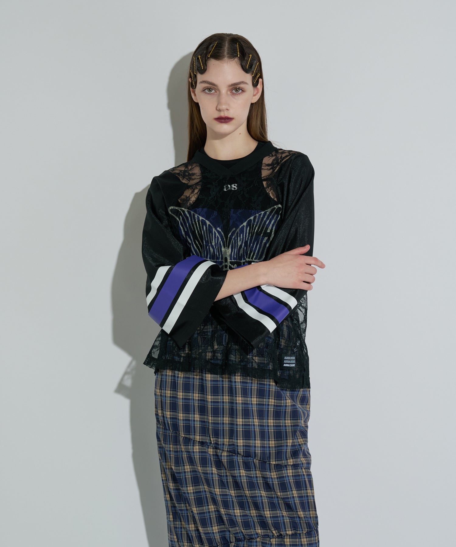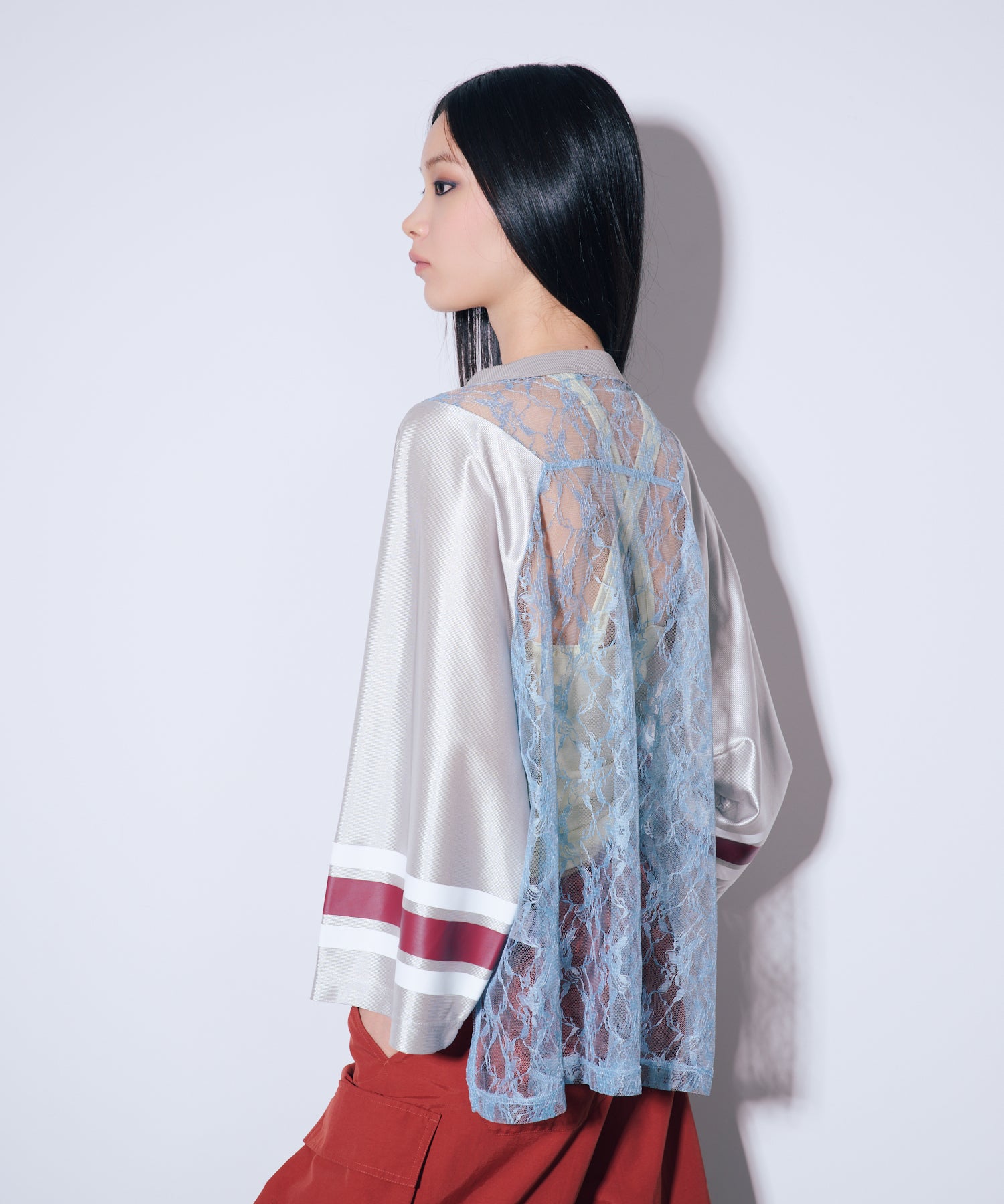 ANNA SUI NYC定番のゲームシャツにレースを合わせた、スポーティとセンシュアルなムードが共存する一着。透け感のあるレースの上に、大胆に配置されたナンバリングと蝶のモチーフプリントはストリート映え間違いなし。光沢感のあるユニフォーム風の素材やラインプリントなどのスポーティーなディティールと、繊細なレースのコントラストが新鮮なバランスを演出します。インナー次第で印象が変わるので、レイヤードでの着こなしも楽しめるアイテム。カラーはブラック・ブラウン・シルバーの3色展開。それぞれ異なる世界観を持つ、色違いで揃えたくなるラインナップです。