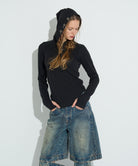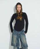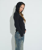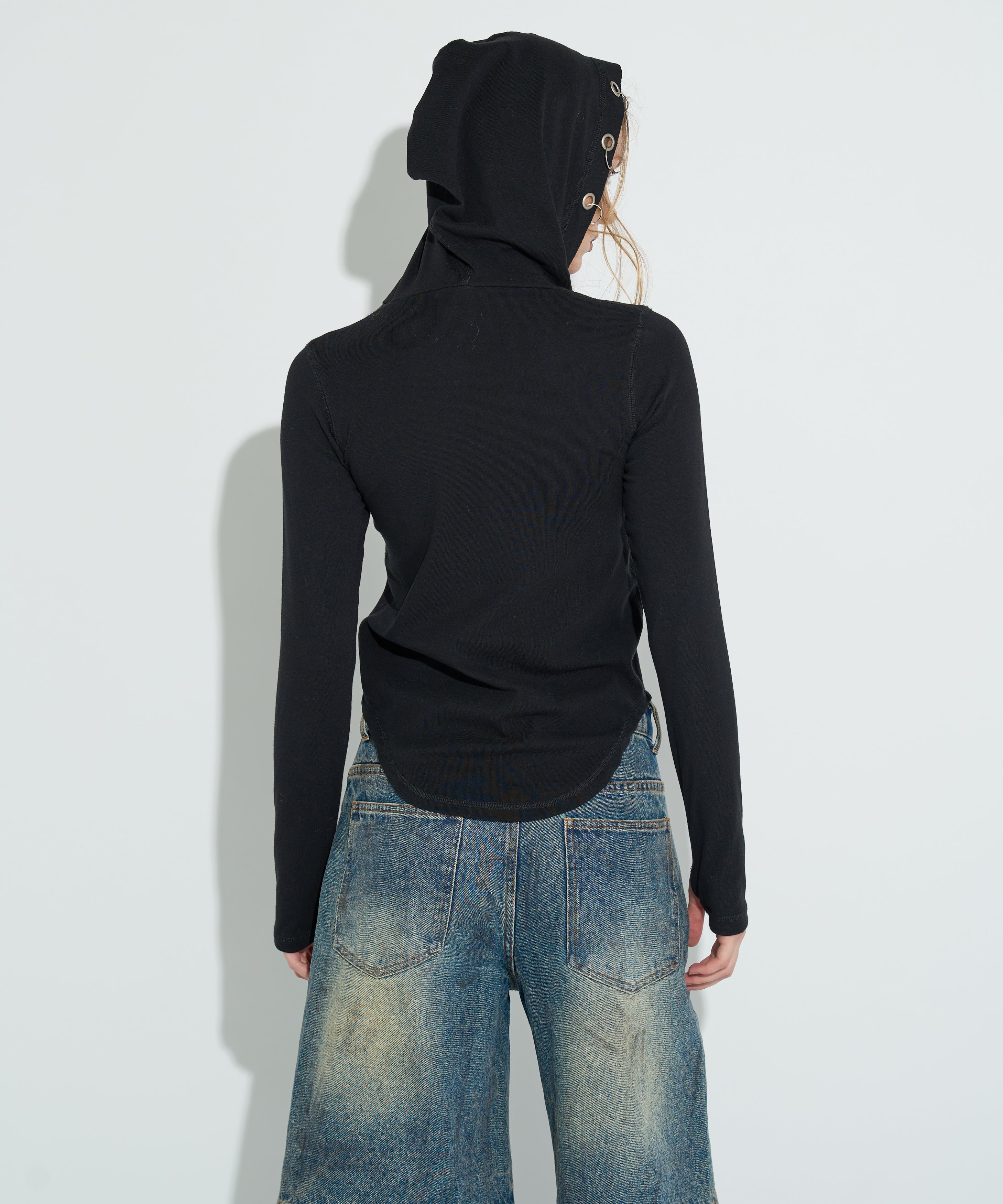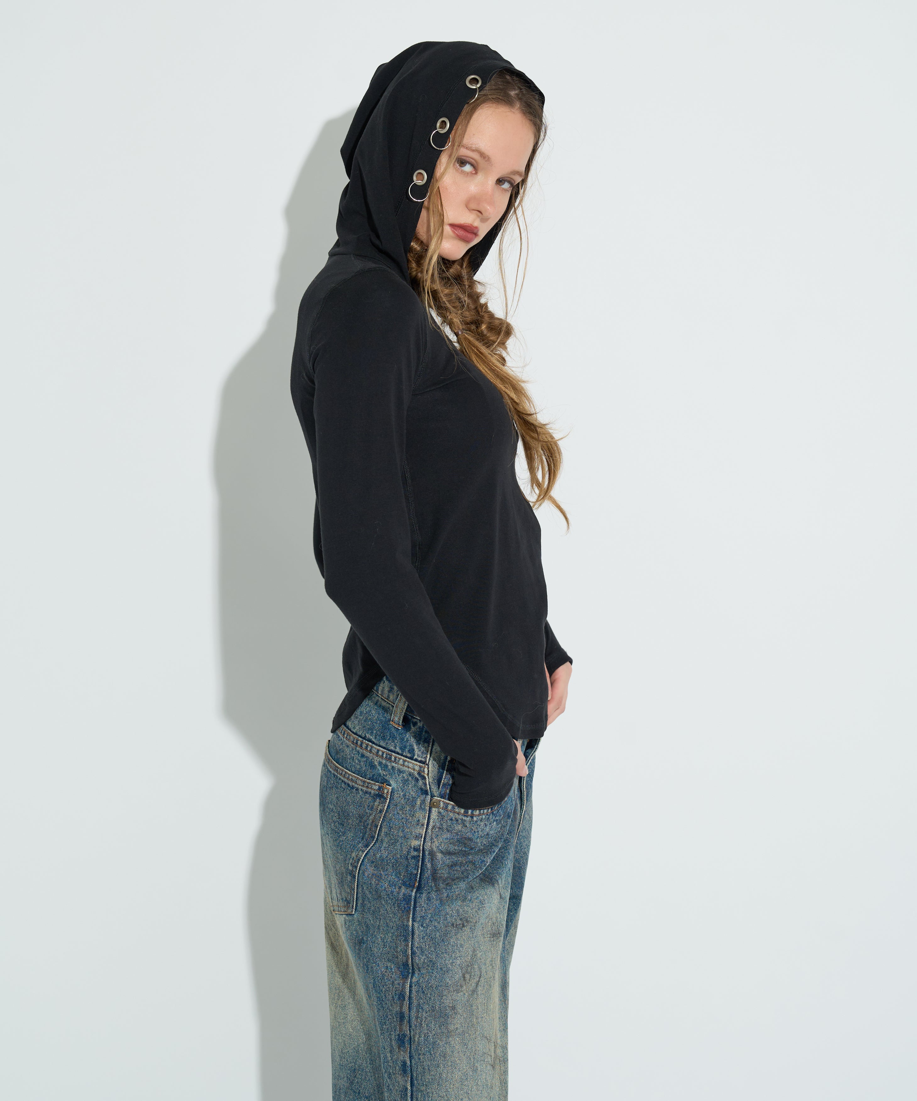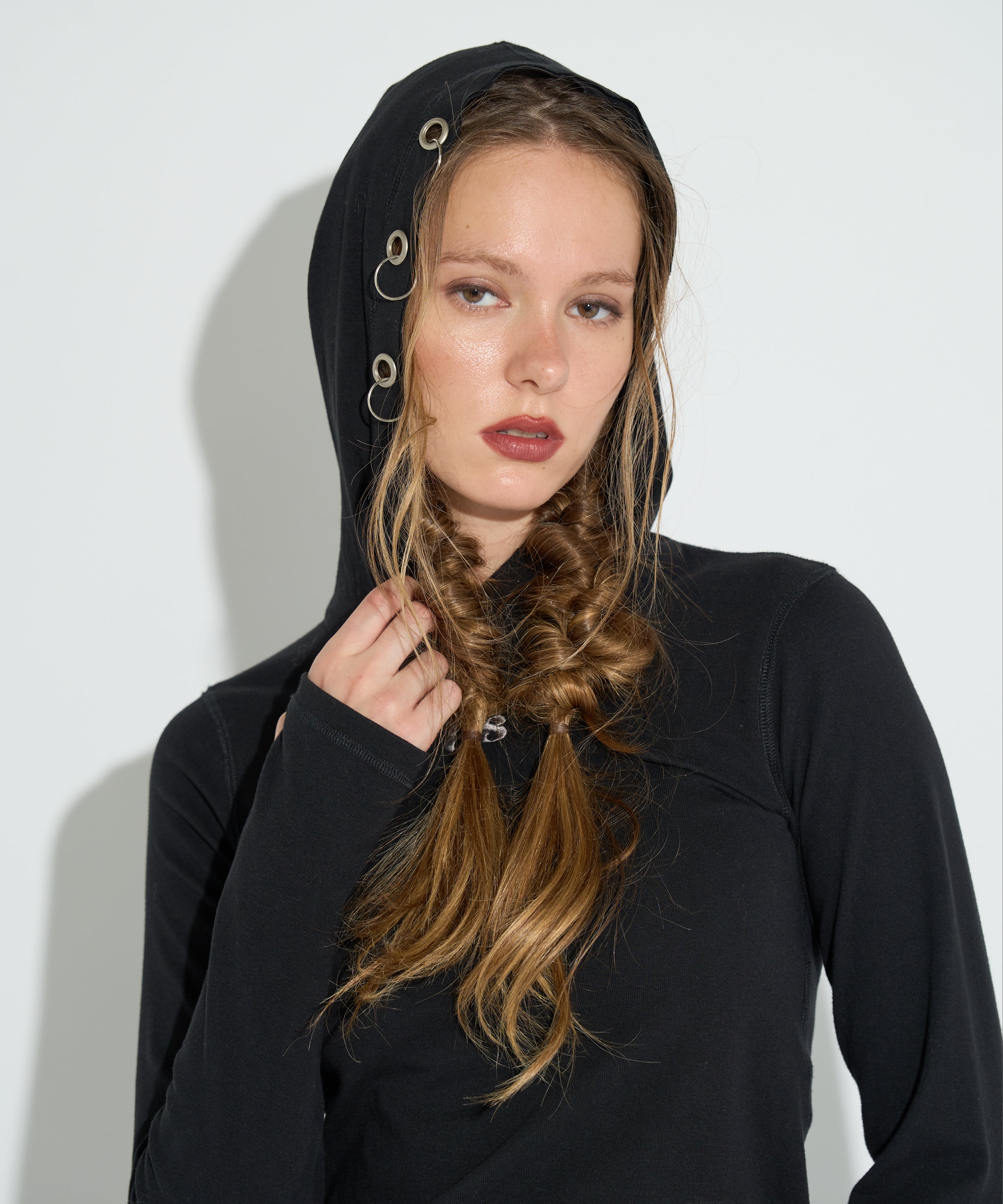 コンパクトなサイズ感がスタイリッシュな、フード付きロングスリーブTシャツ。 フード部分にはピアスのようなパーツをあしらい、エッジを我慢したストリートライクなディテールをプラス。 フード口は一時の切りっぱなし仕様にすることで、ラフで抜け感のある雰囲気を表現しています。 腰周りのシルエットをすっきりと演出してくれる裾のラウンドカットは、レイヤカラーは、シックなBLUE、淡く柔らかいWHITE、モードなBLACKの3色展開。 単体ではもちろん、ベストやキャミワンピースとのレイヤードにも使いやすく、ストリートとフェミニンのバランス感が楽しめるアイテムです。