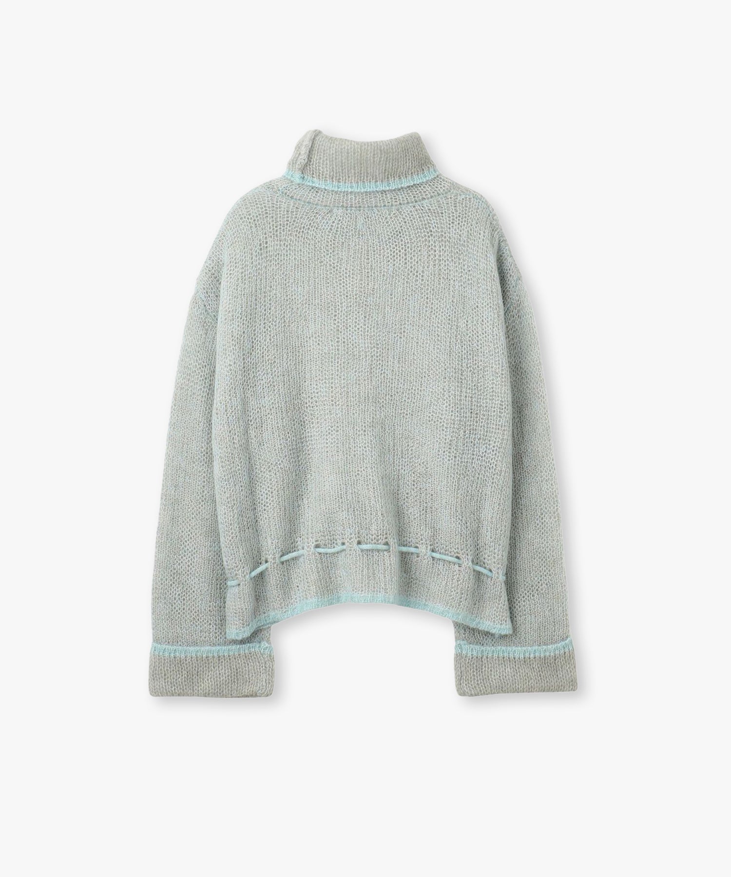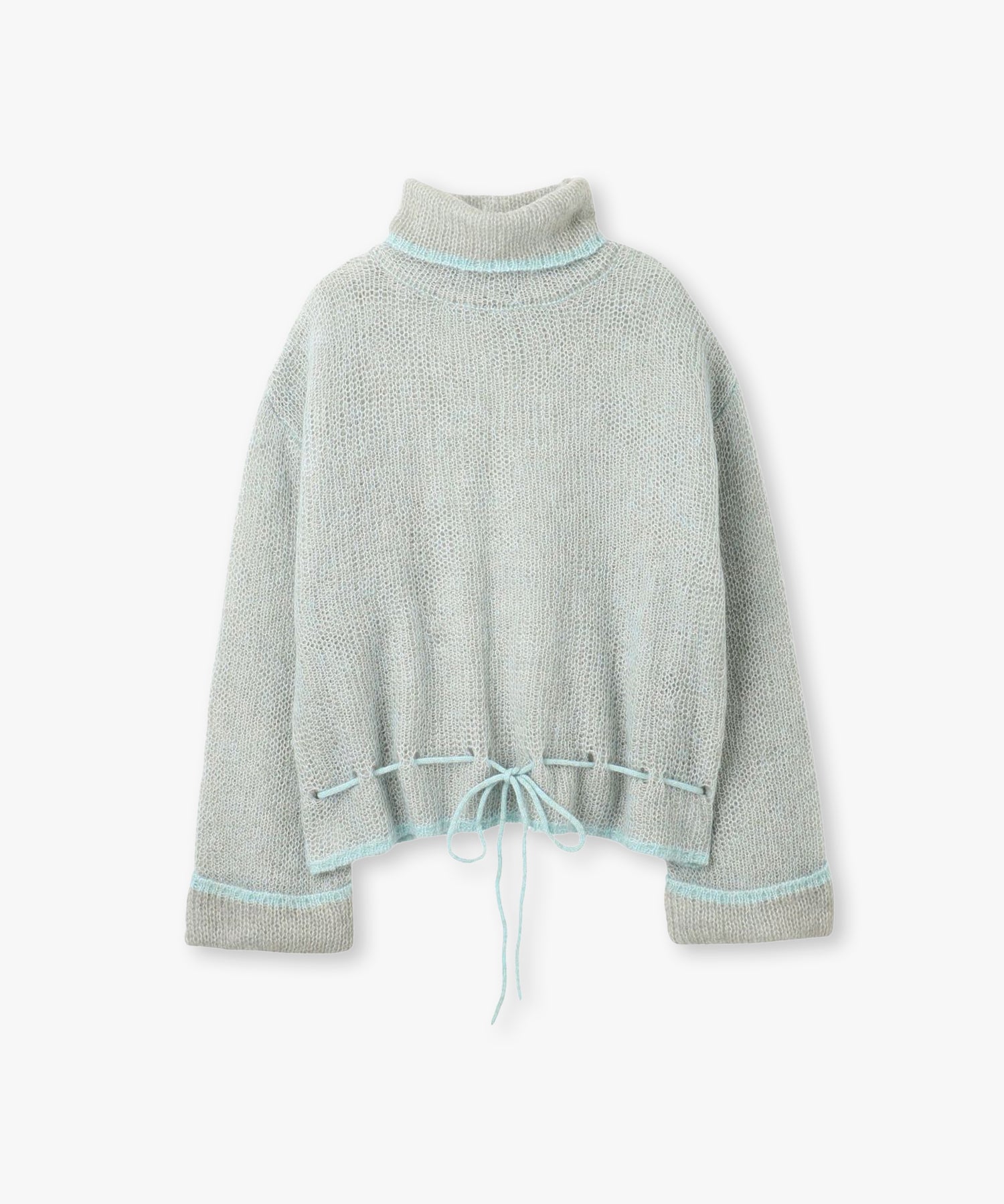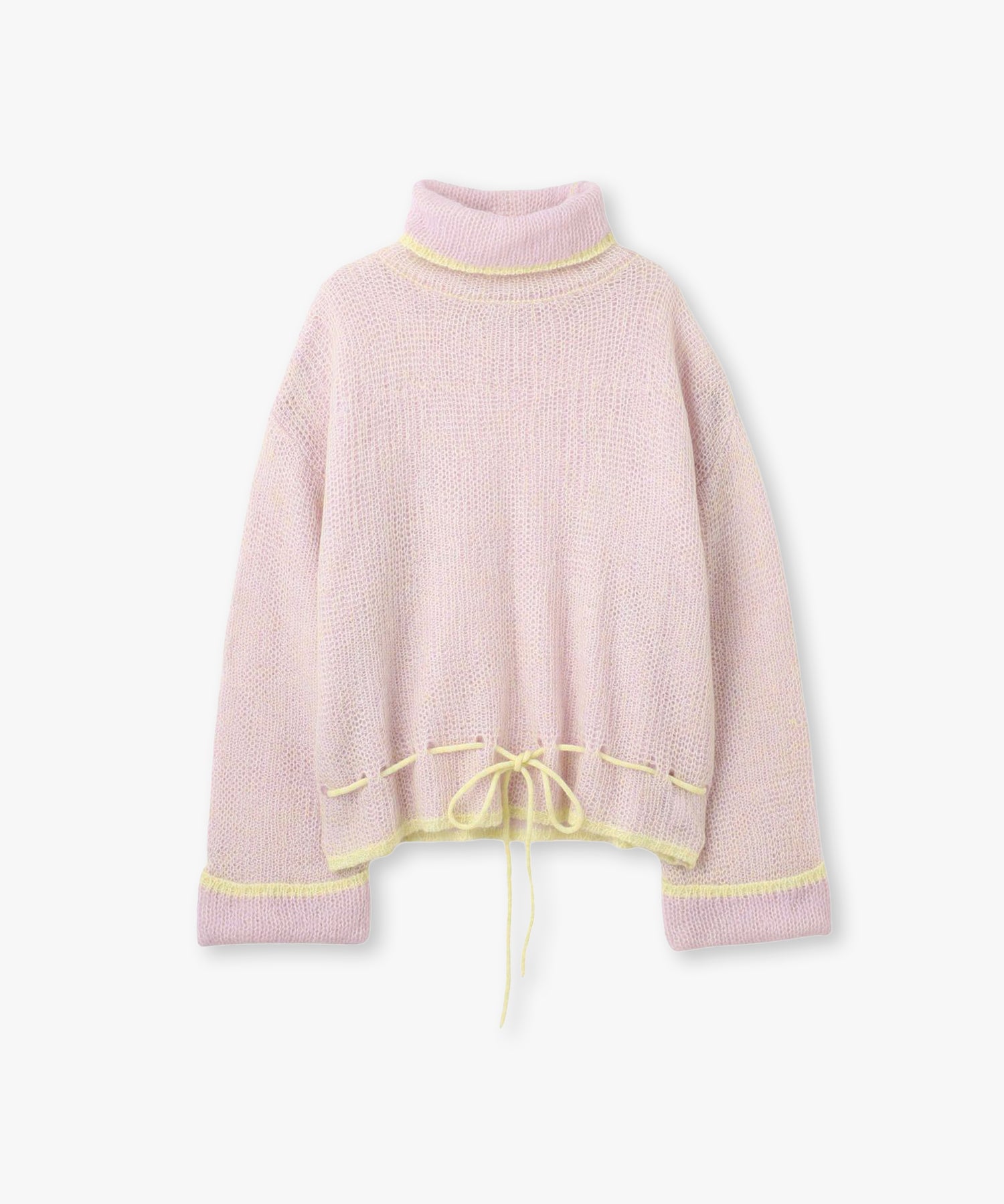 やわらかな雰囲気が魅力のタートルニット。表糸と裏糸を配色にすることで生まれる繊細な色合いが、淡く優しいニュアンスを引き立てます。衿端や袖口にあしらった配色ラインもさりげないアクセントとなり、シンプルながらも存在感のあるデザインに。さらに、裾にはリボンディテールをプラスし、スタイリングにフェミニンなムードを添えています。リボンを絞ってシルエットに変化をつけるなど、アレンジも楽しめる一枚。程よいゆったりシルエットに、柔らかく肌ざわりの良い糸で、リラックスした着心地ながらも一枚で旬なスタイリングが完成。カラーはMINTとPINKの2色展開で、どちらも透明感のある淡いトーンで、シーズンムードを柔らかく彩ります。