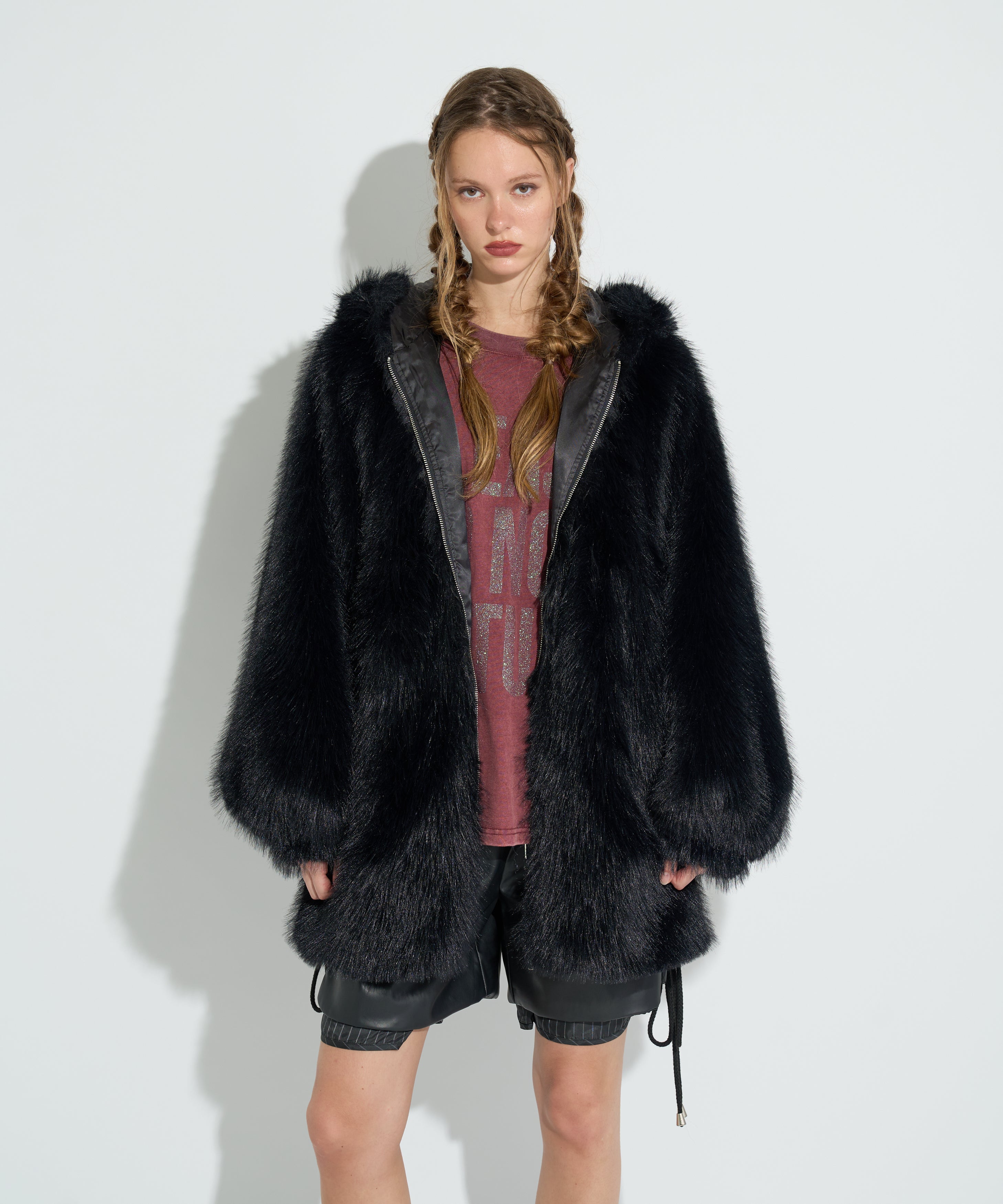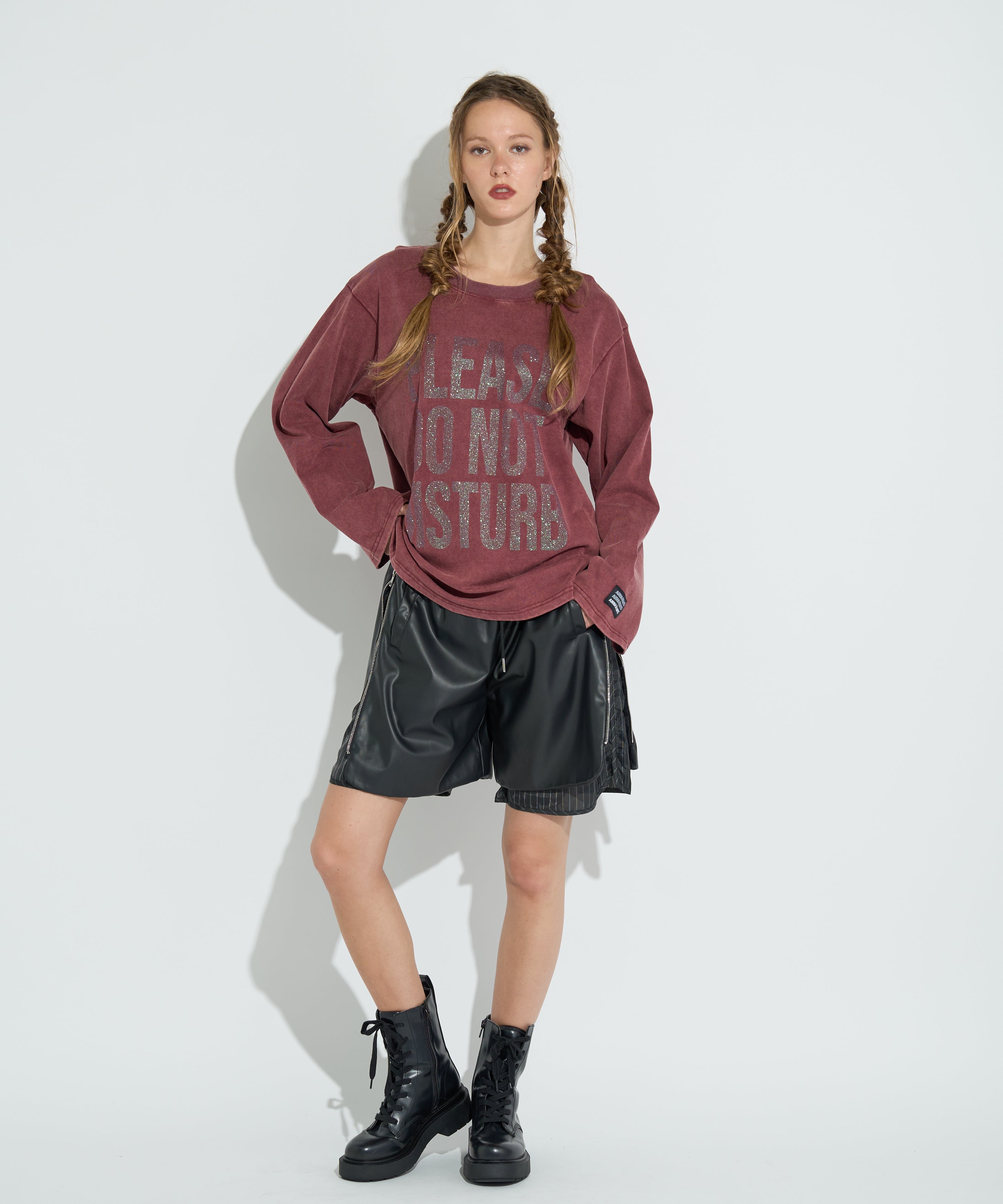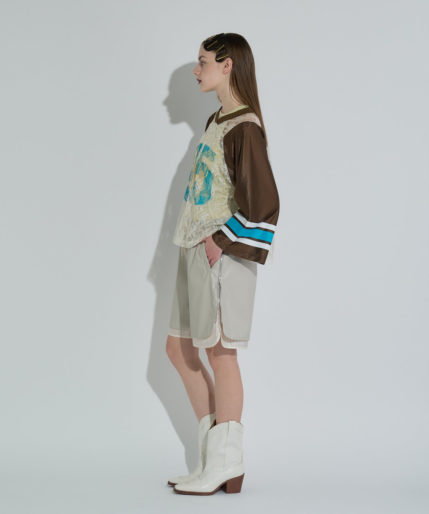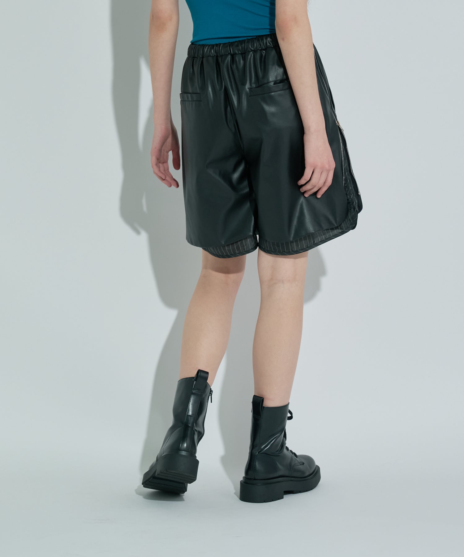 レイヤード風の遊び心のあるデザインが印象的なハーフパンツ。両サイドのファスナーを開けることで、内側に仕込まれたストライプ柄の生地が覗き、スタイリングに抜け感をプラスしてくれます。ハーフパンツというカジュアルなアイテムながらも、程よい光沢感のあるフェイクレザーで、モードにもカジュアルにも振れる一枚に。ウエストはストレスフリーな総ゴム仕様で、ヒップ周りには程よいゆとりを持たせて今っぽいバランスに仕上げています。シンプルなトップスと合わせるだけでスタイリングが完成する、主役アイテムです。