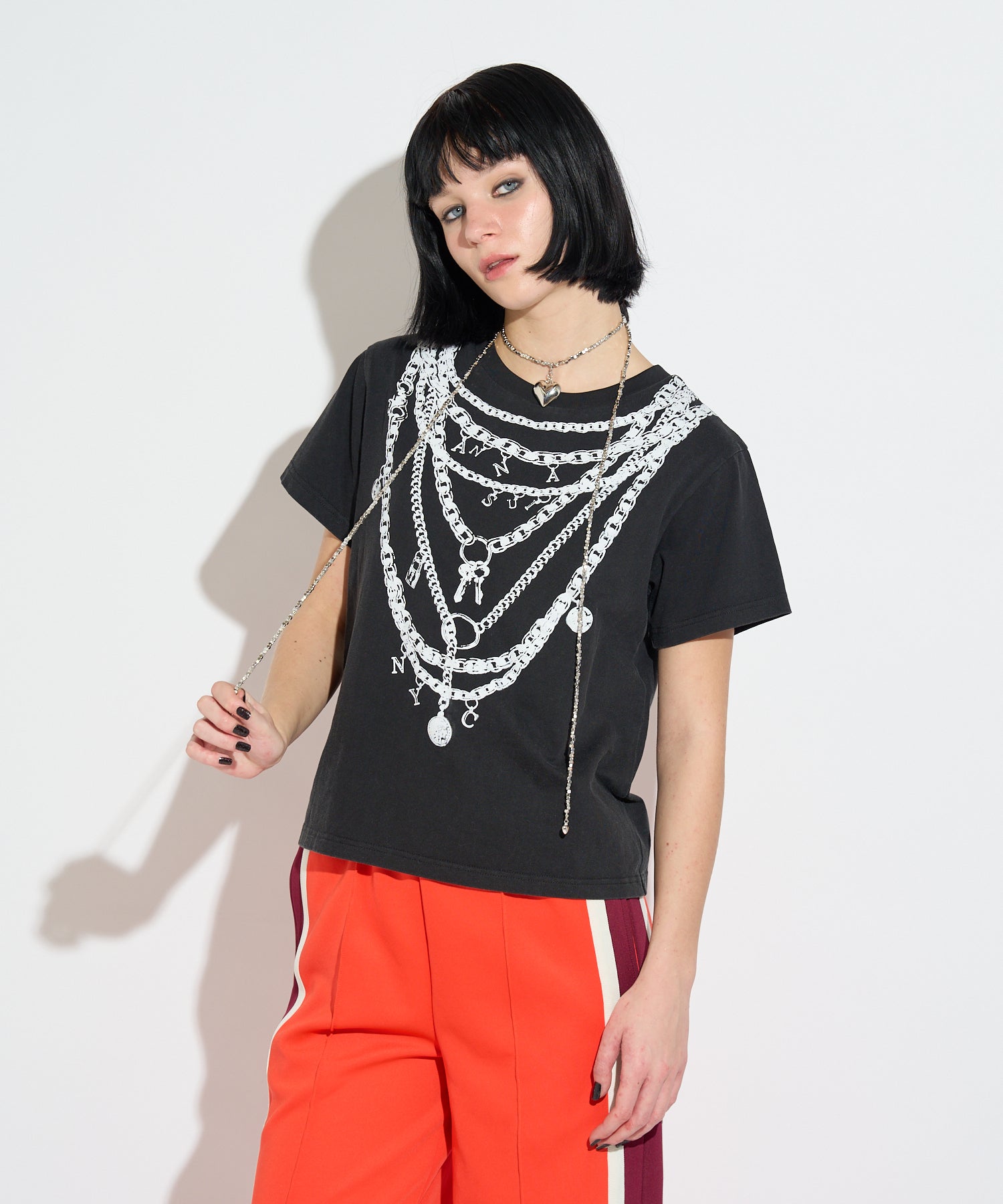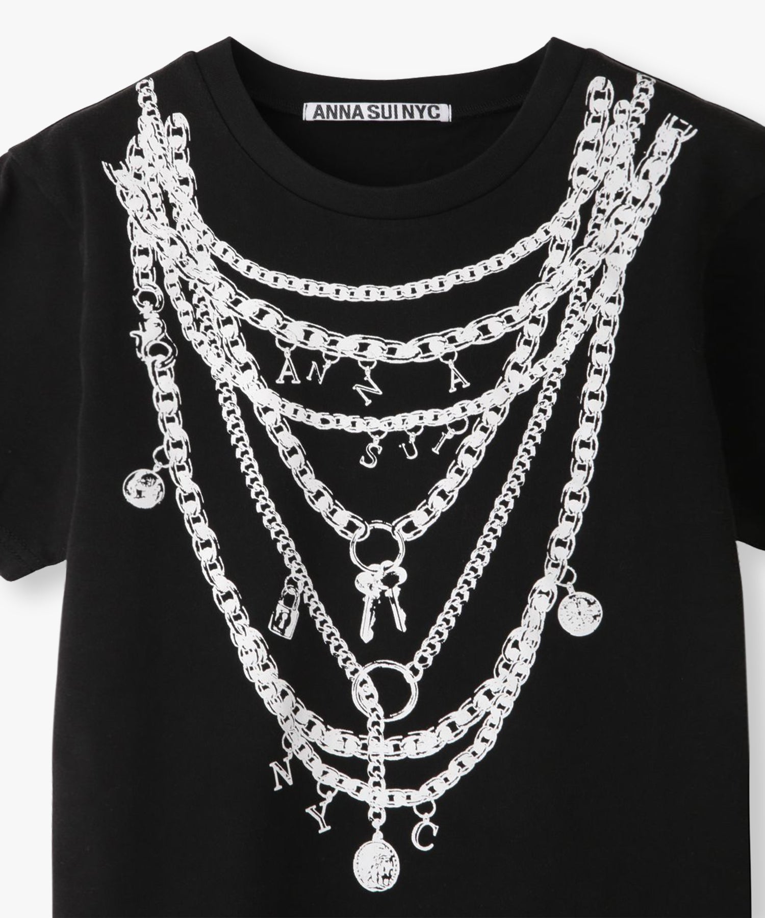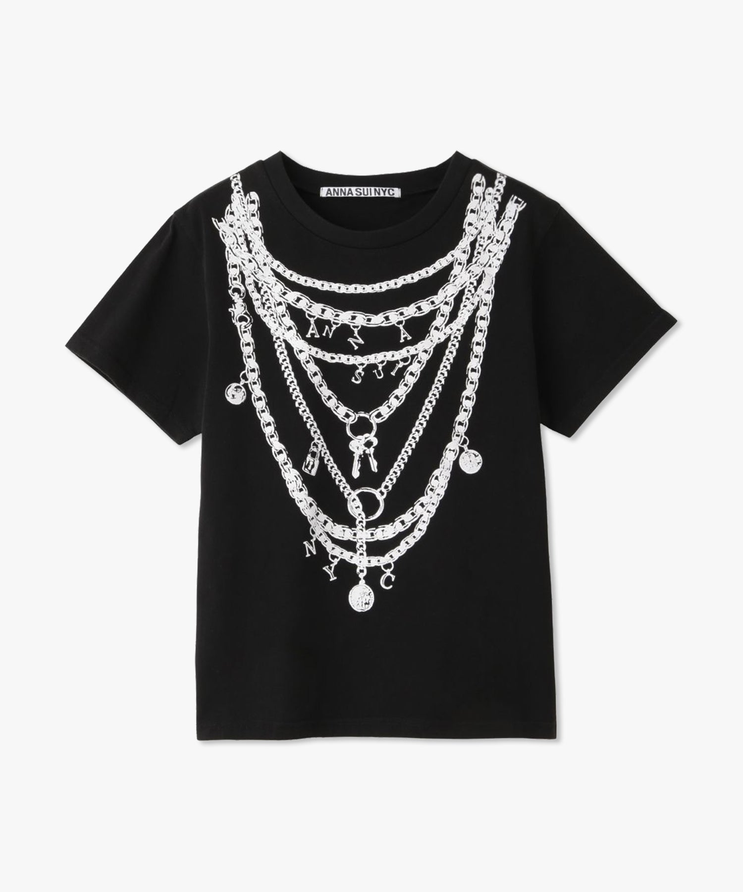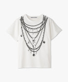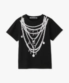 重ね付けしたようなチェーンネックレスを大胆にプリントしたデザインTシャツ。