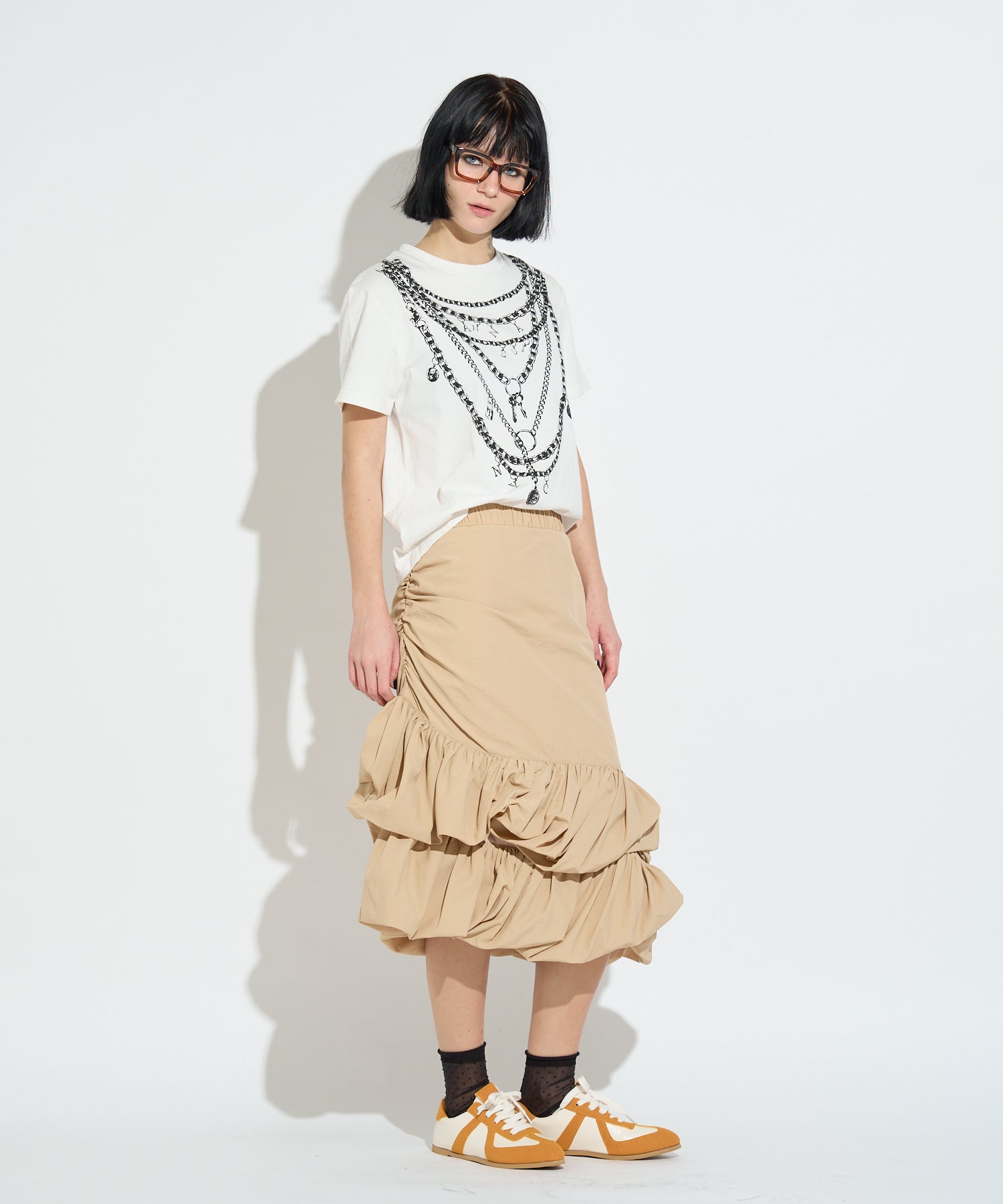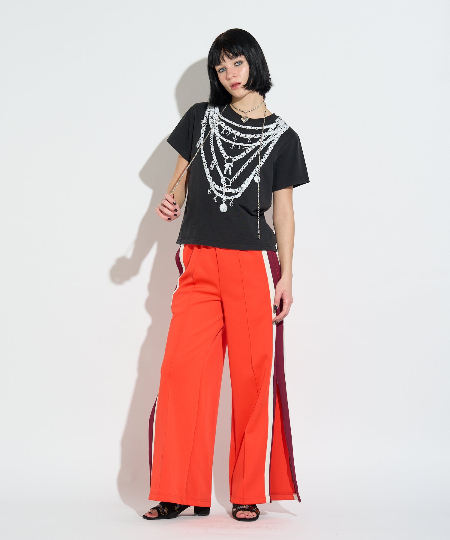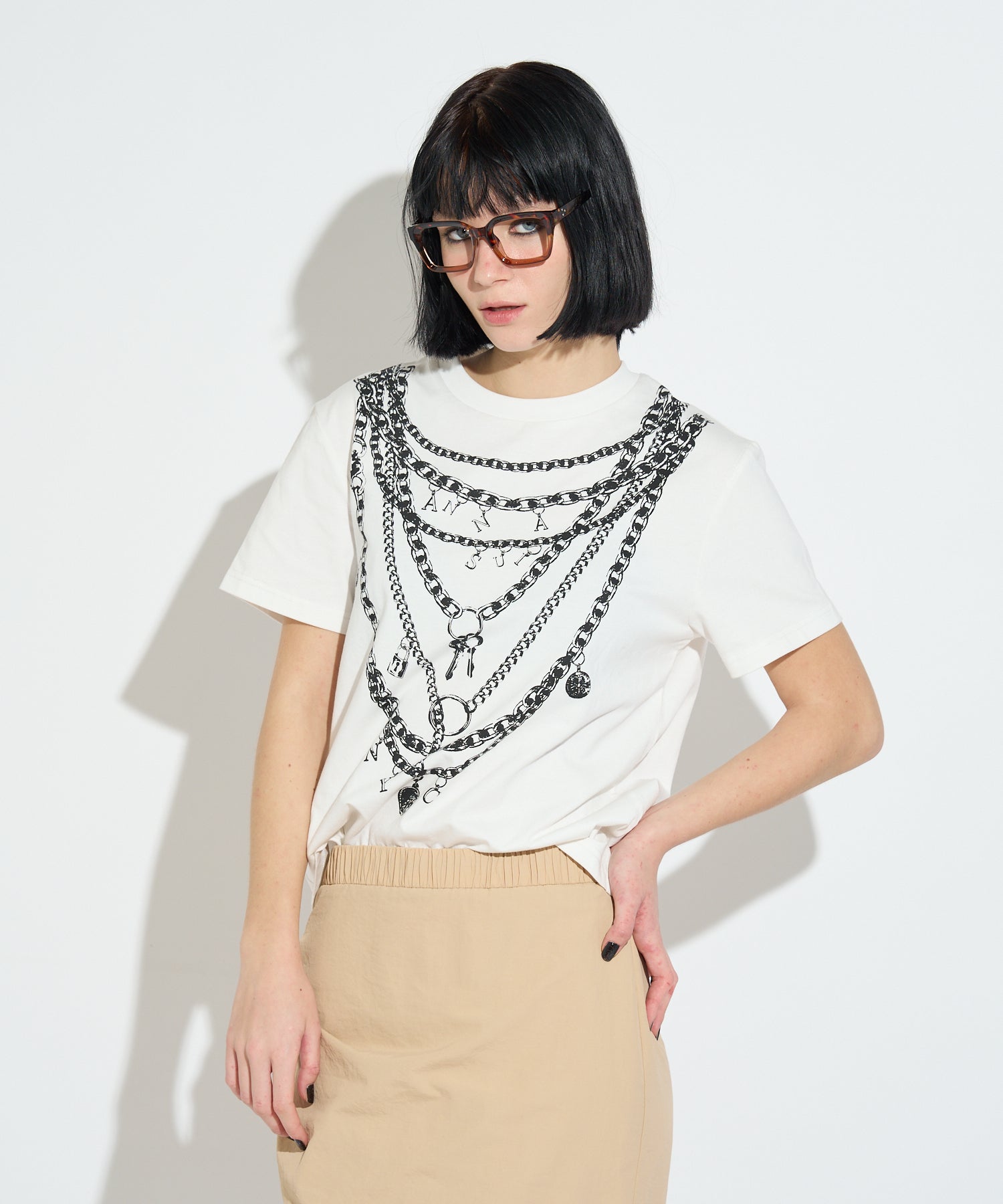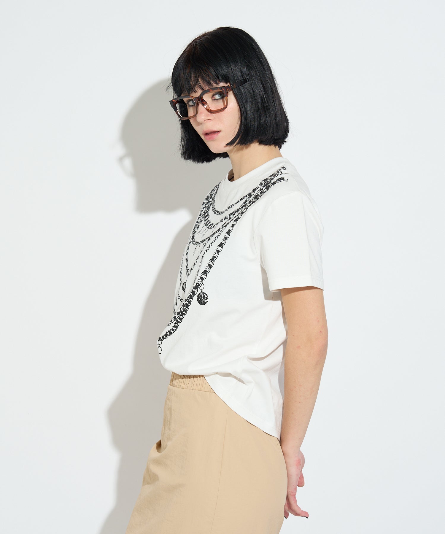 重ね付けしたようなチェーンネックレスを大胆にプリントしたデザインTシャツ。