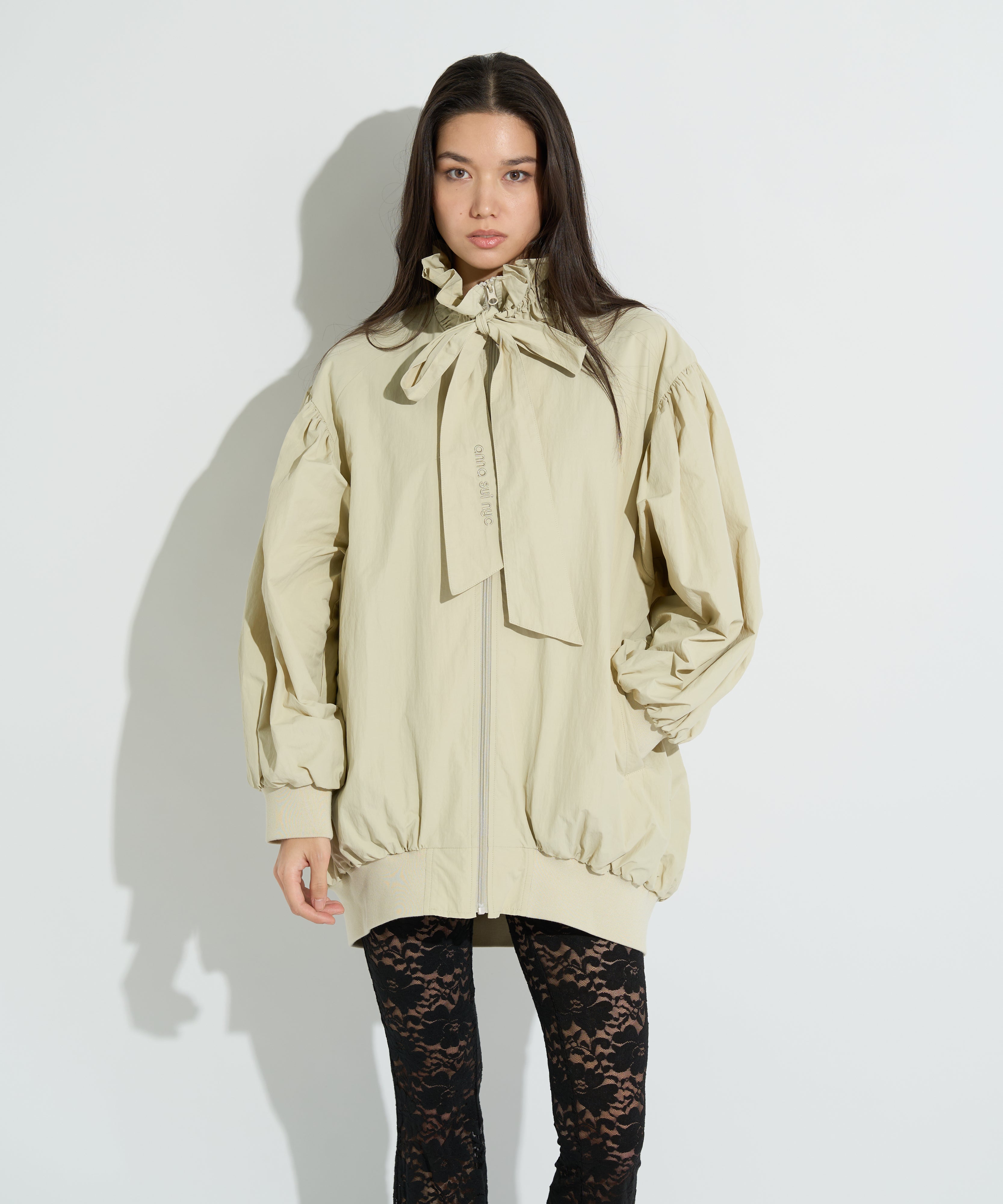 首元を華やかに彩るボリューミーなフリルと、ブランドロゴ刺繍を施したビッグリボンが特徴的なブルームブルゾン。