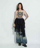 大胆なシルエットとティアードフリルが、スタイリングに華やかさをプラスします。