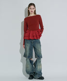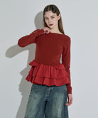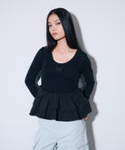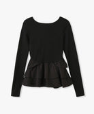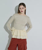 ペプラム切替のティアードフリルが華やかなロングスリーブトップス。ボディはカットソー、フリル部分はほどよくハリ感のある布帛を使用し、立体感をプラス。さらにウォッシュ加工を施すことで、ほんのりラフさが加わり甘すぎないバランスに仕上がっています。前後どちらを前にしても着られる2WAY仕様で、印象が大きく変わるので、シーンや気分にあわせてアレンジを楽しむことも。パンツにもスカートにも合わせやすくデイリーに取り入れやすいのに、特別感のあるデザインが魅力です。