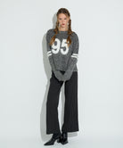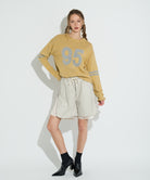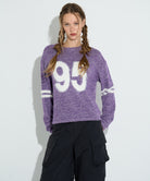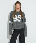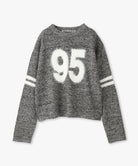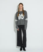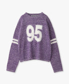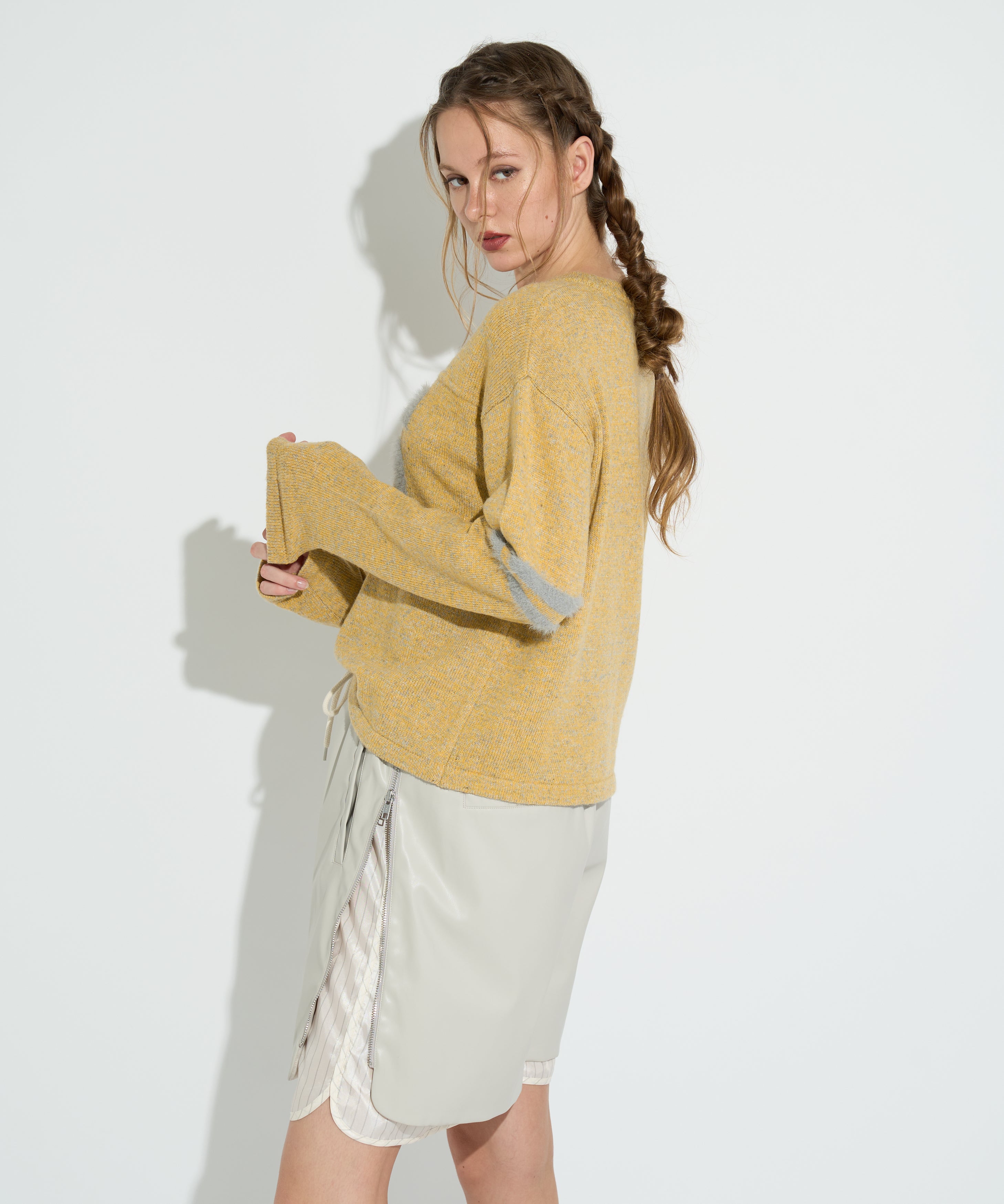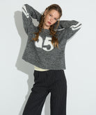メランジ糸ならではの奥行きある色合いが魅力のニットトップス。フロントの大胆なナンバリングと袖のライン部分にはシャギー糸を使用し、ふんわりとした質感がシーズンムードを高めてくれます。スポーティなモチーフを取り入れながらも、メランジのニュアンスカラーによって大人っぽく着られるバランスに仕上げた一枚。デニムやスカートとの相性も良く、デイリースタイリングに取り入れやすいアイテムです。