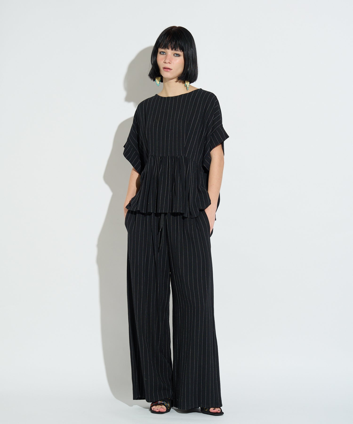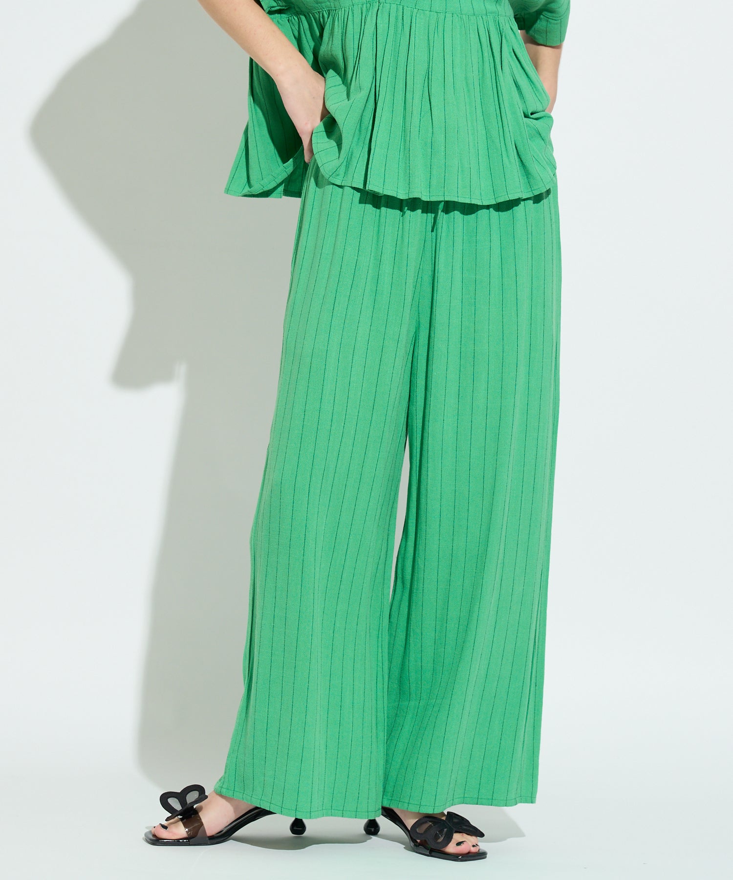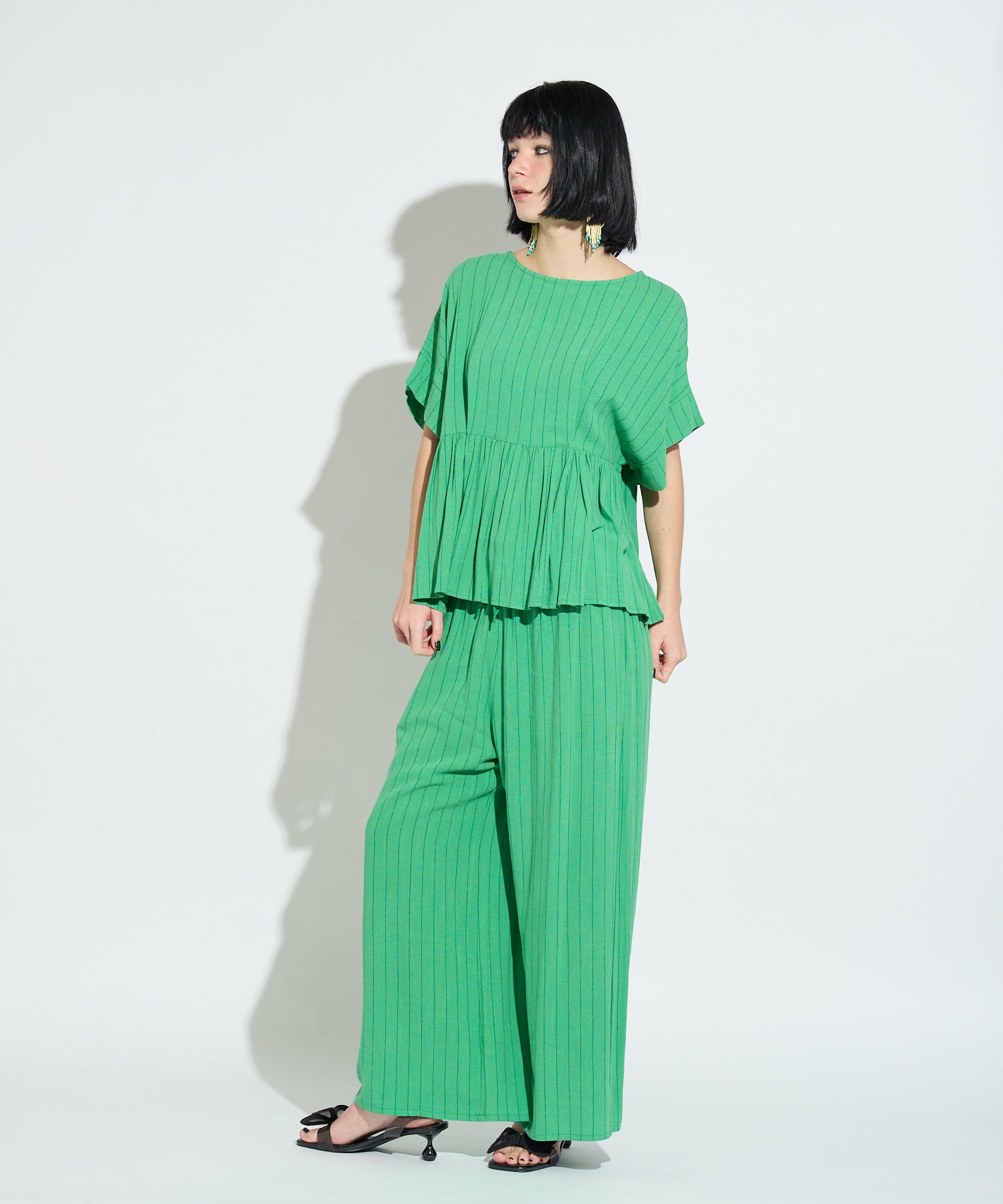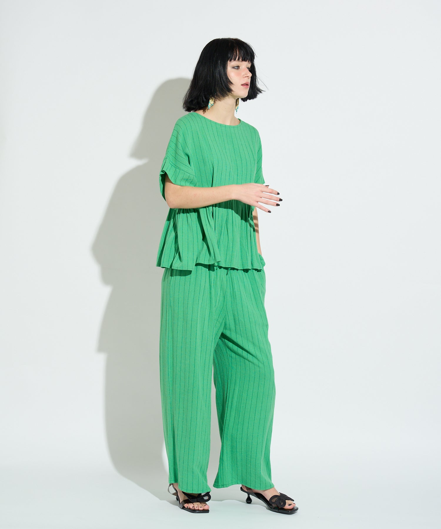同素材のストライプイージーパンツも展開しており、セットアップでの着用が可能。