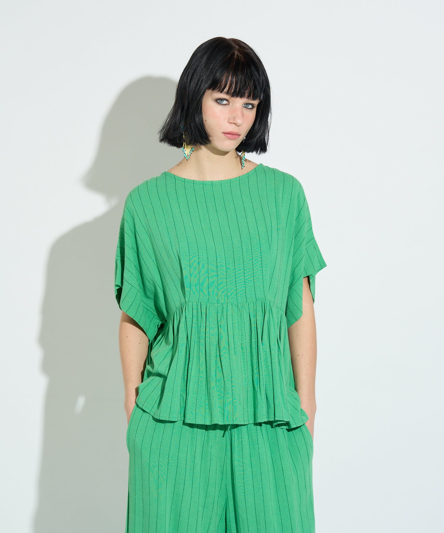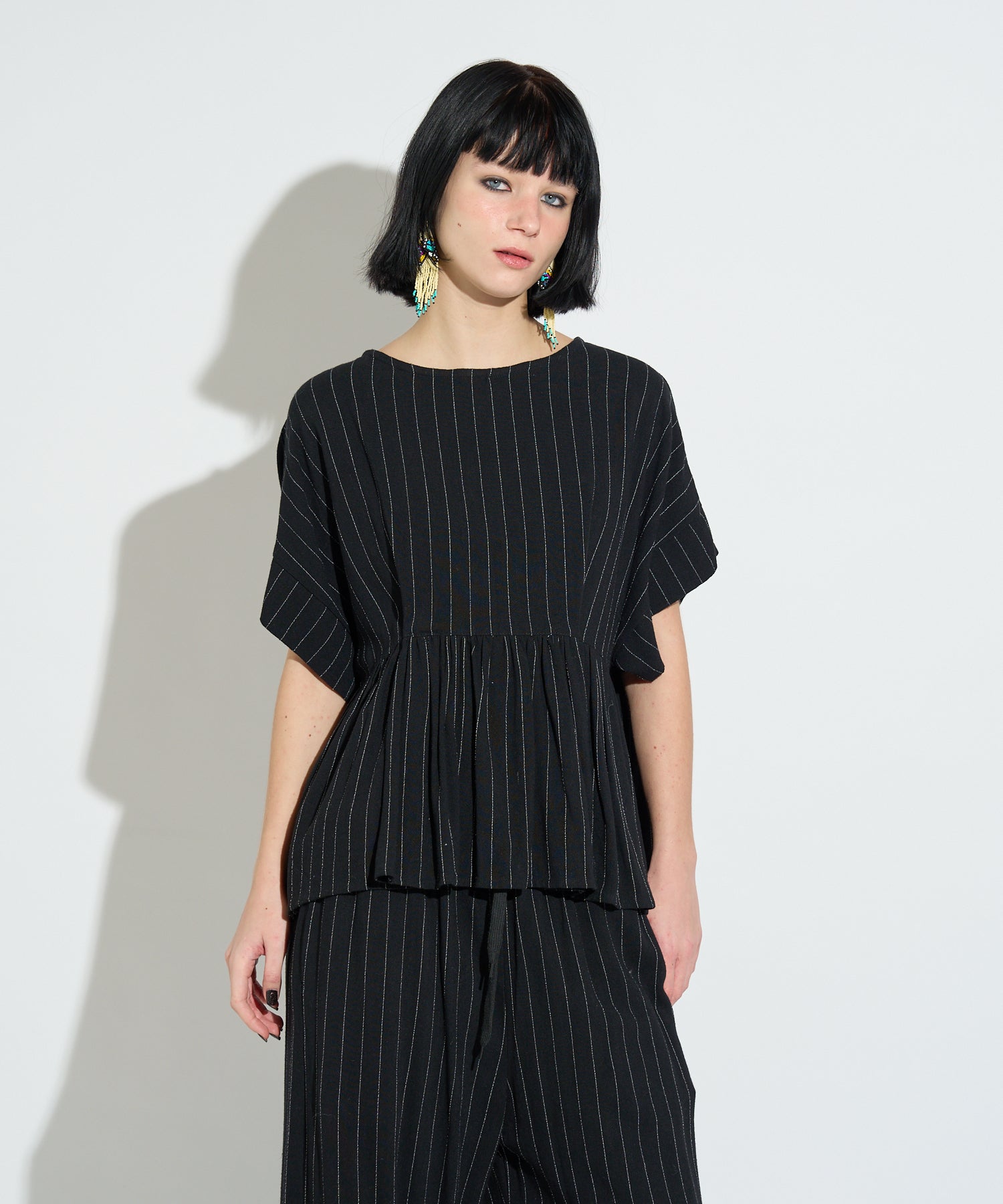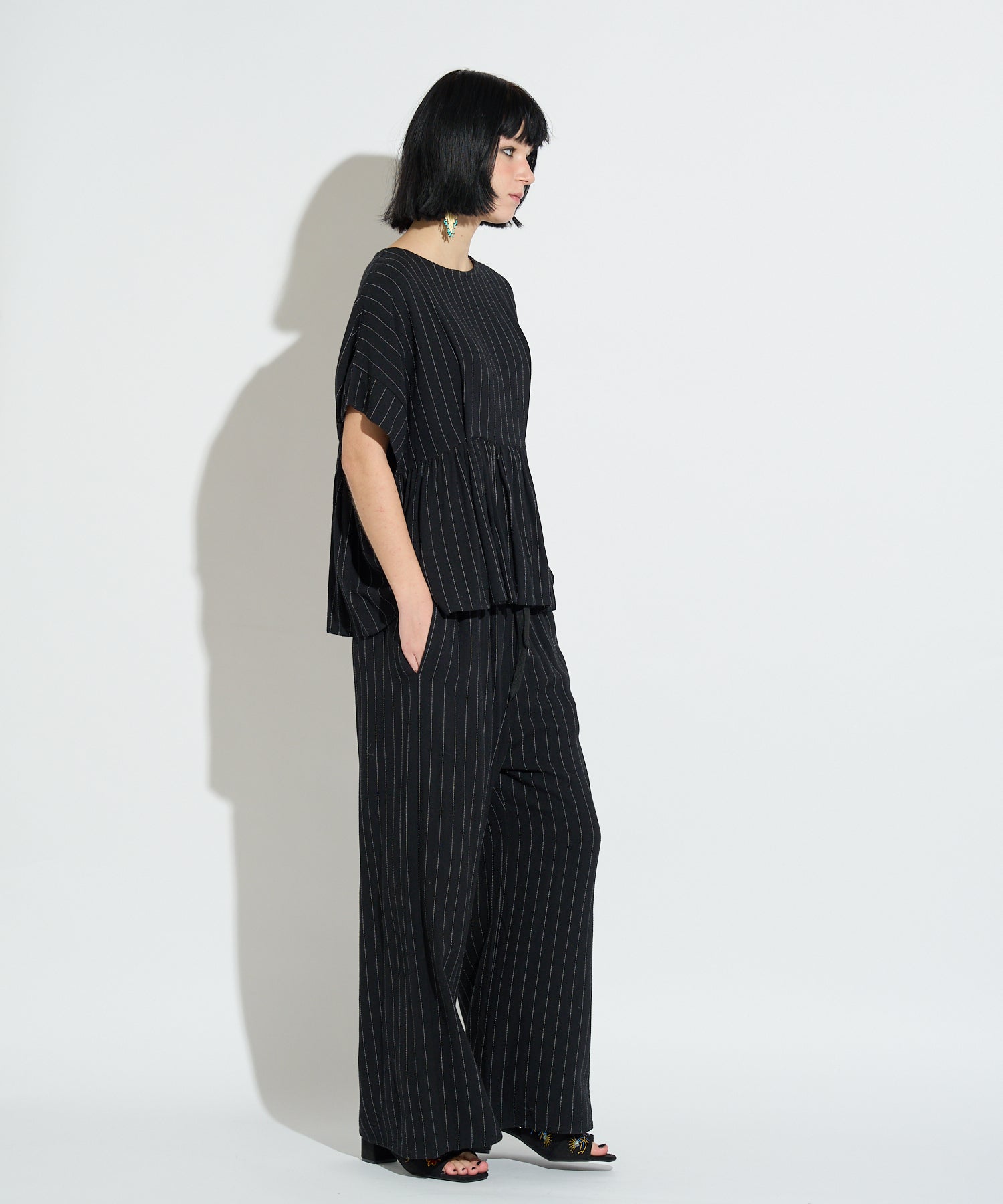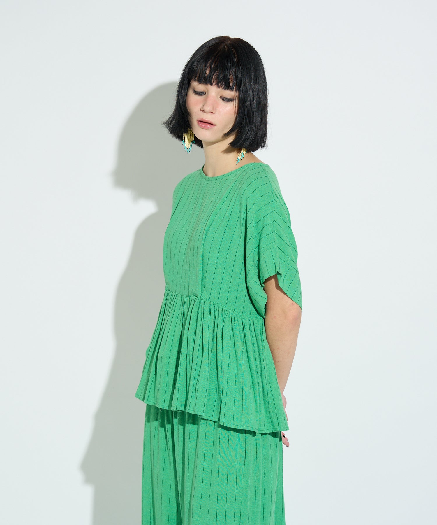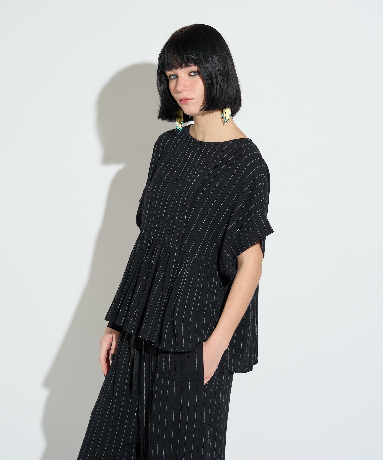 同素材のストライプイージーパンツも展開しており、セットアップでの着用が可能。