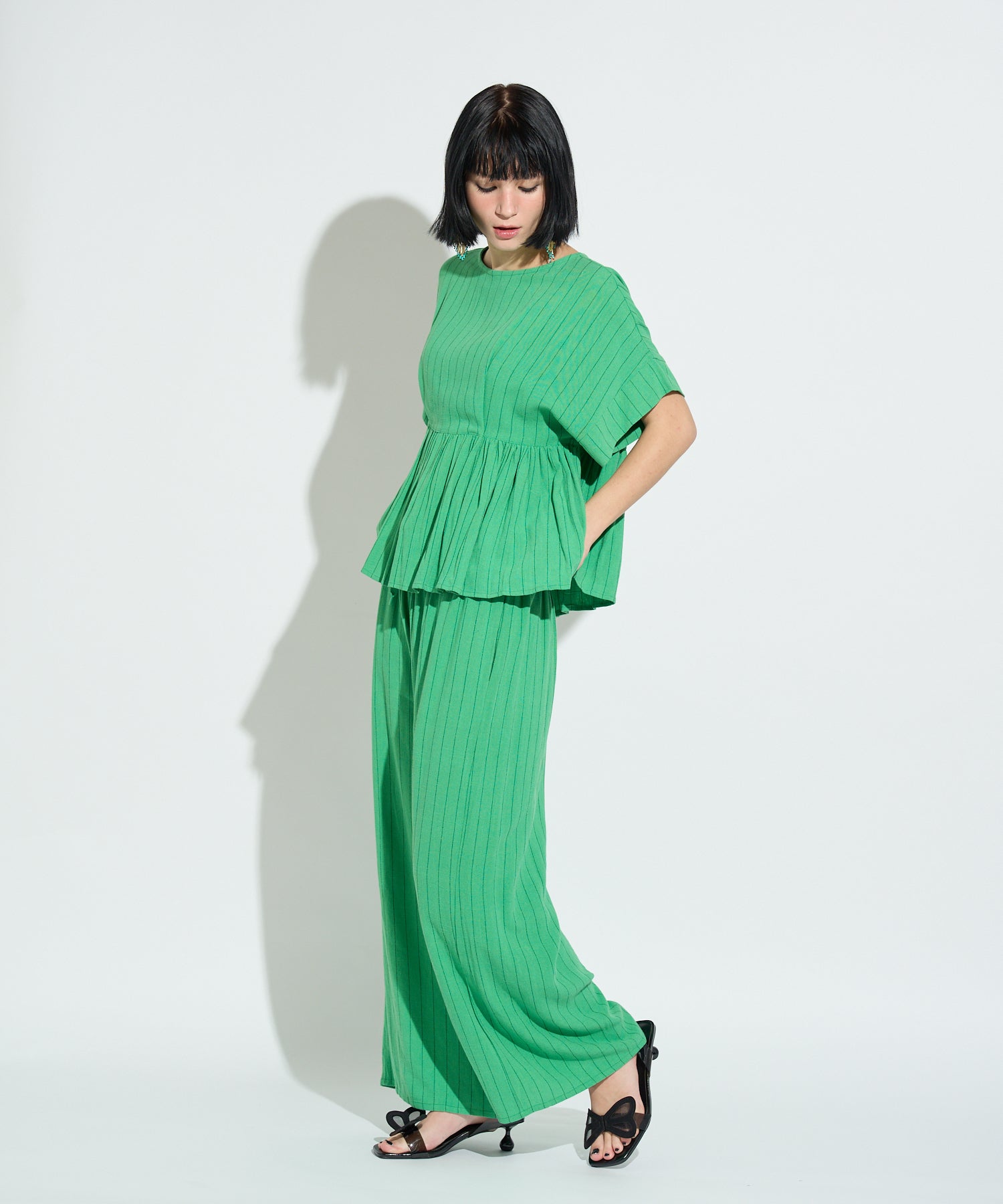 夏の日差しをさらりと味方にする軽やかな麻混素材を採用し、視線を縦に流すストライプと立体的なフリルが理想的なバランスで自然なスタイルアップを叶えるアイテム。