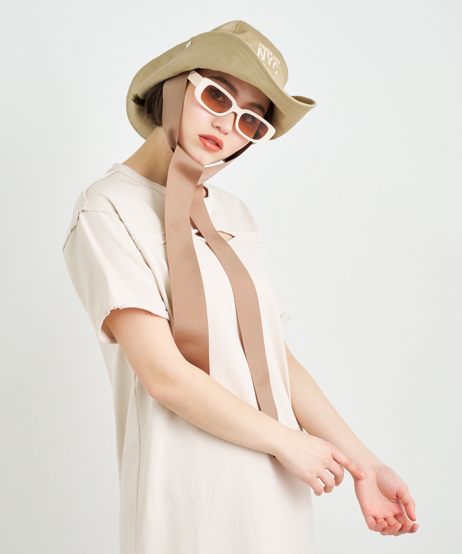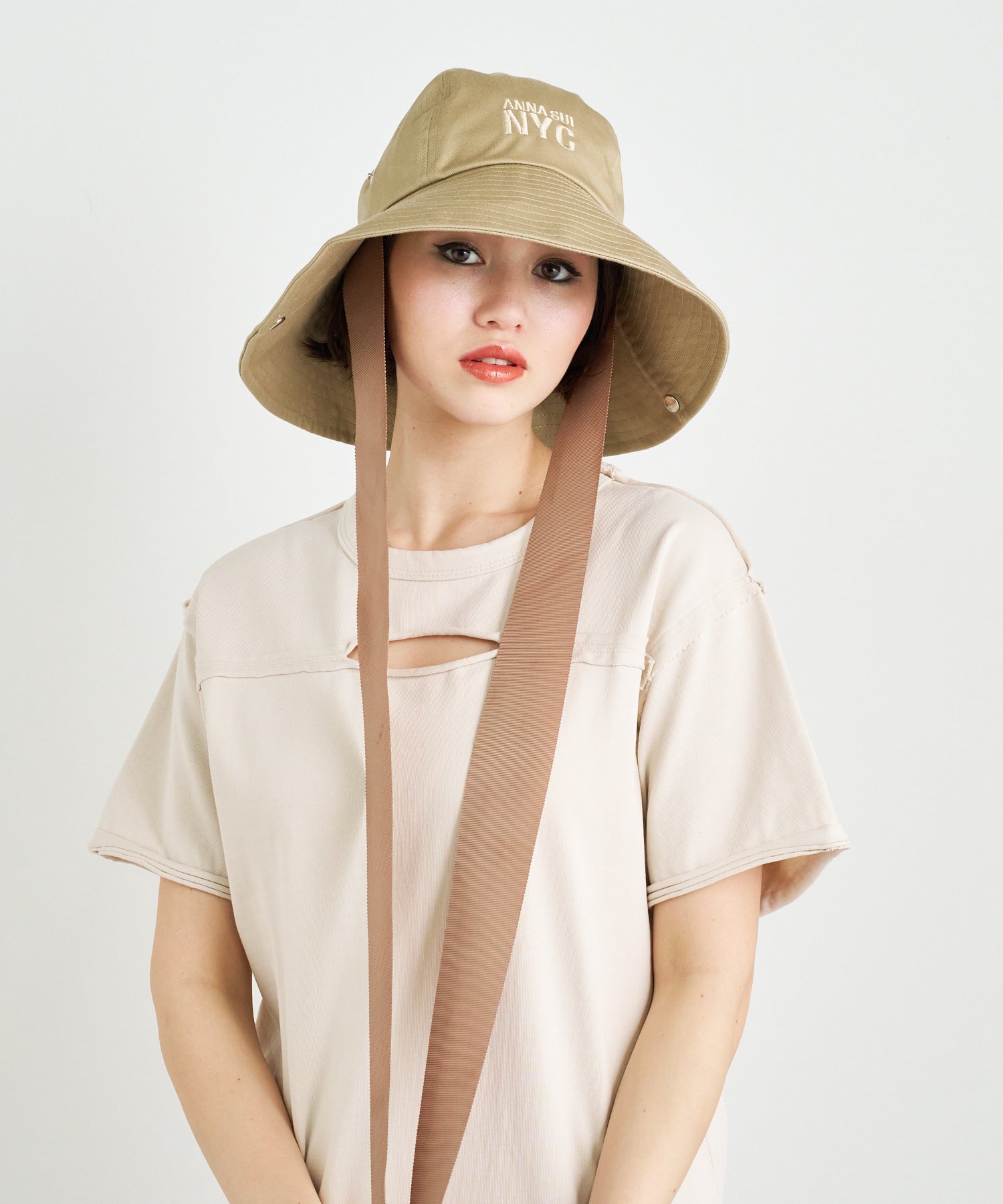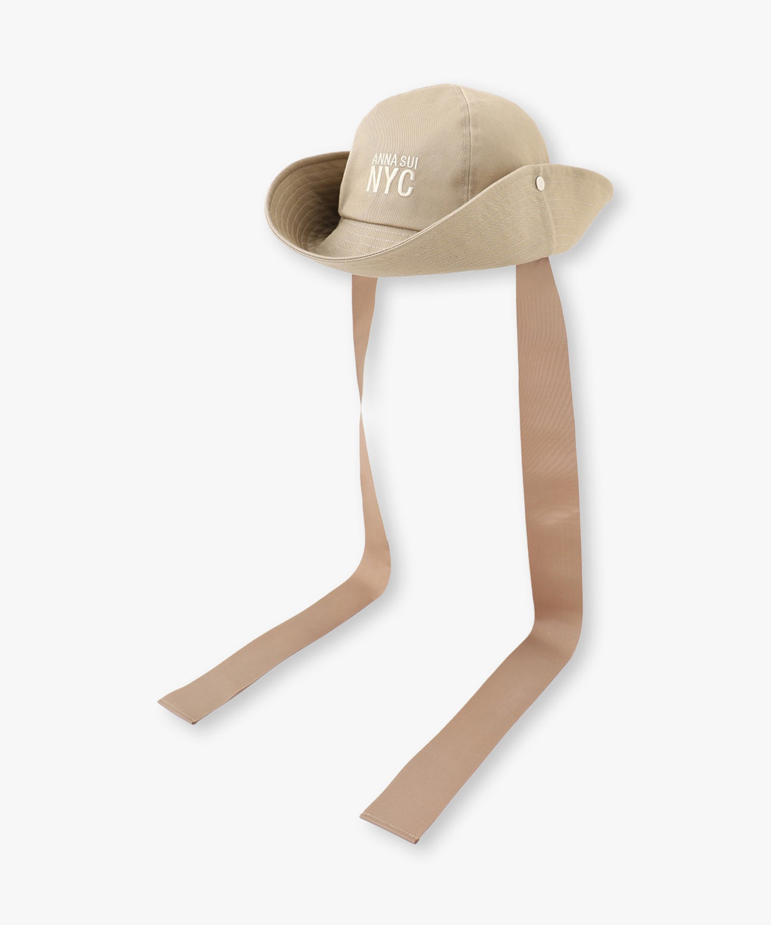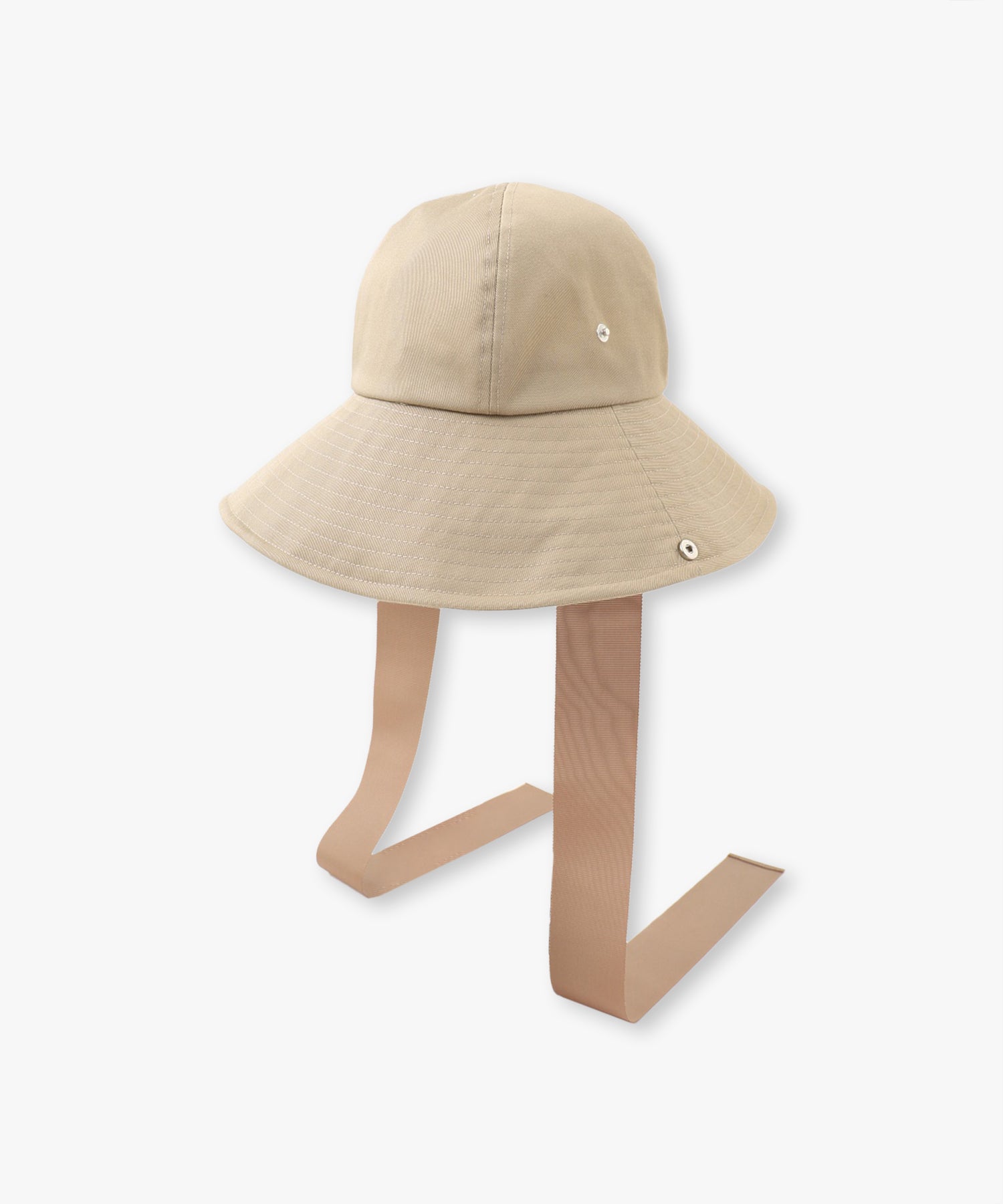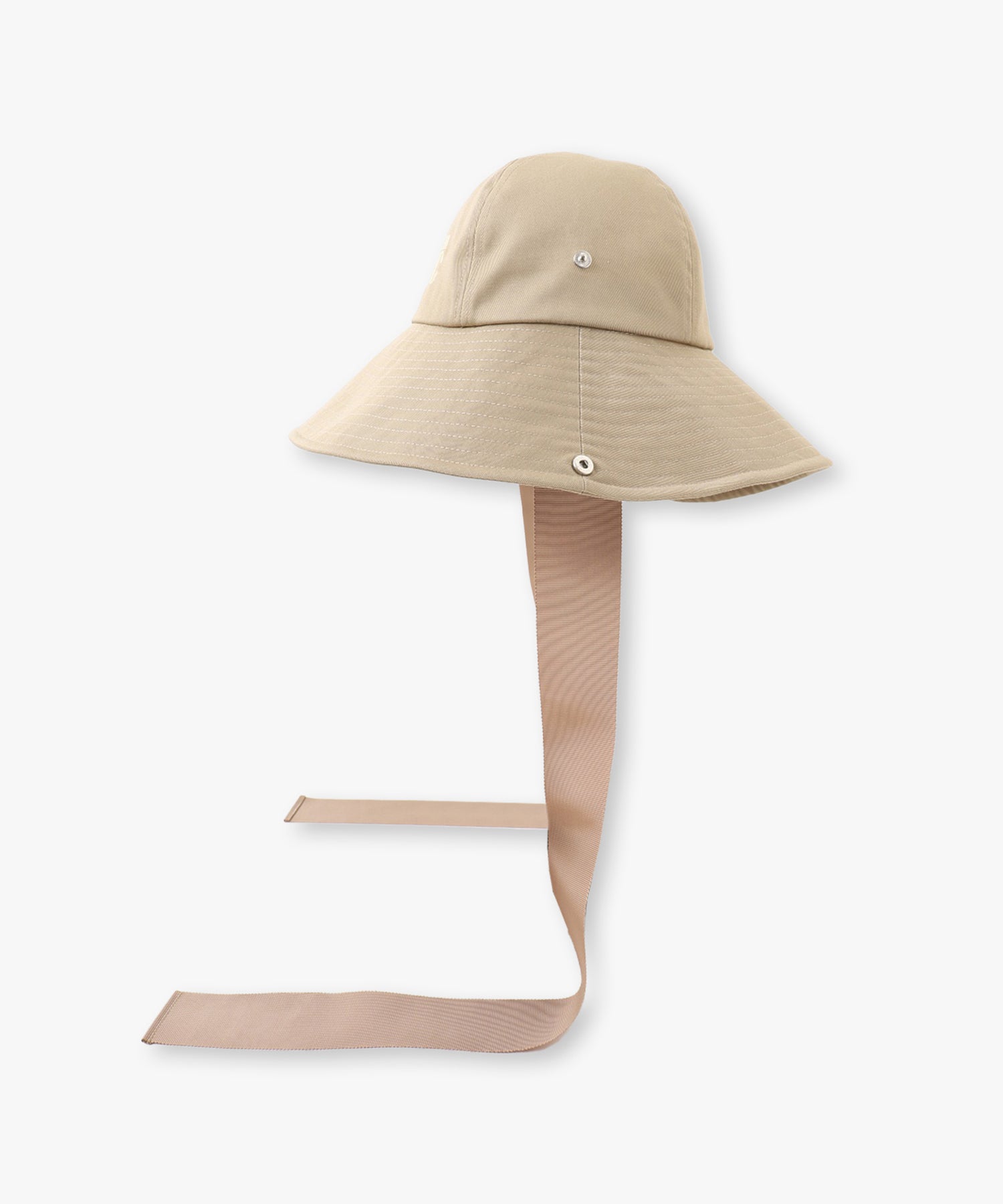ツバ広で日よけに最適なツイル生地のサハラハット。サイドに付いているドットボタンでツバをたたんで着用することも可能!サイドに垂れる太いテープが存在感溢れる他にない可愛いデザインハットです。カジュアルからフェミニンなスタイリングまで幅広く着用できます。