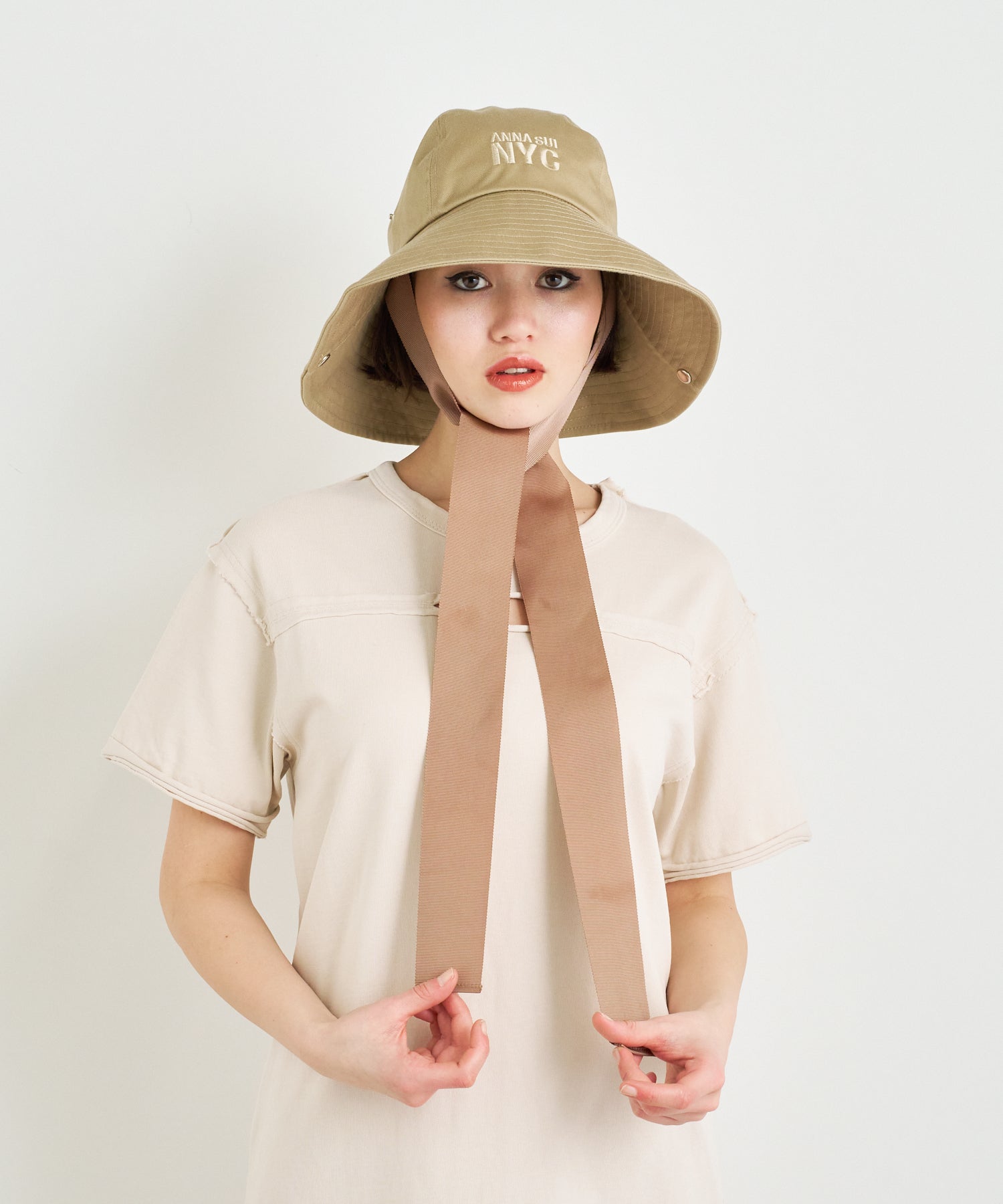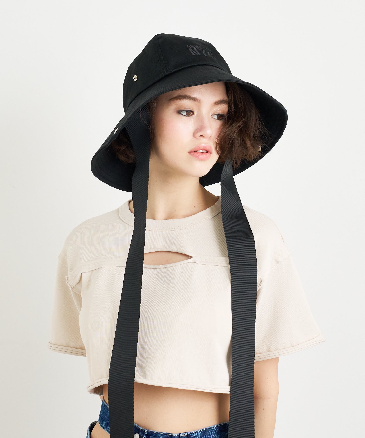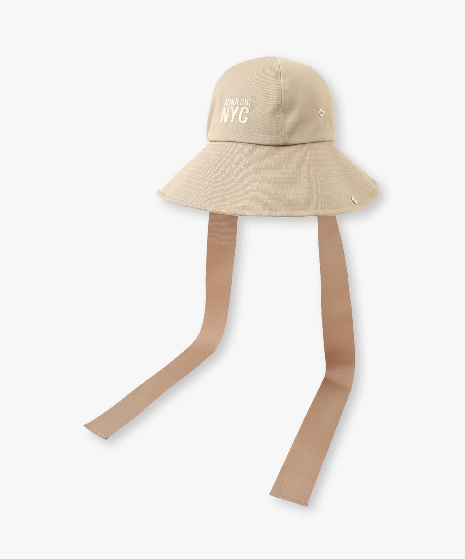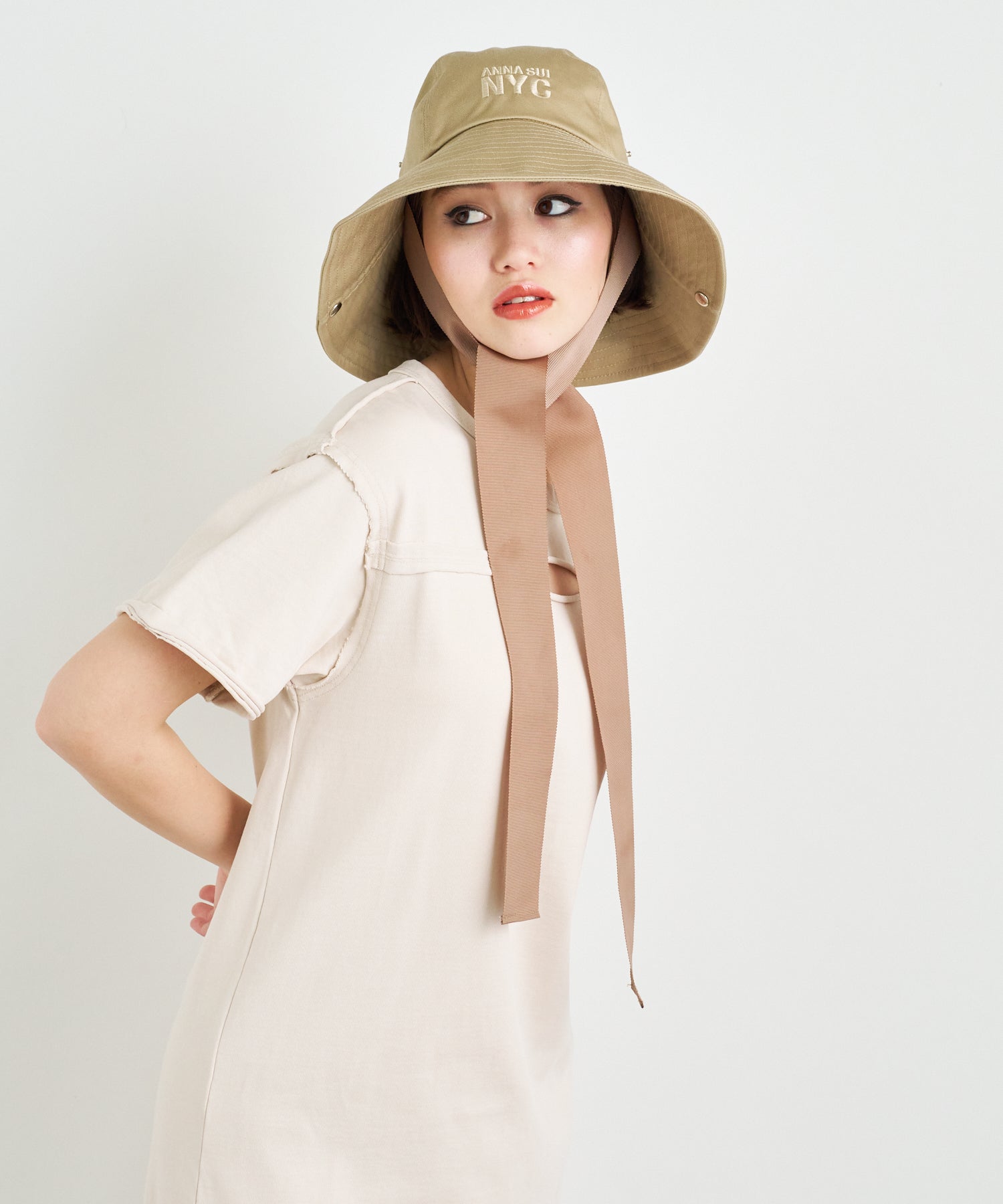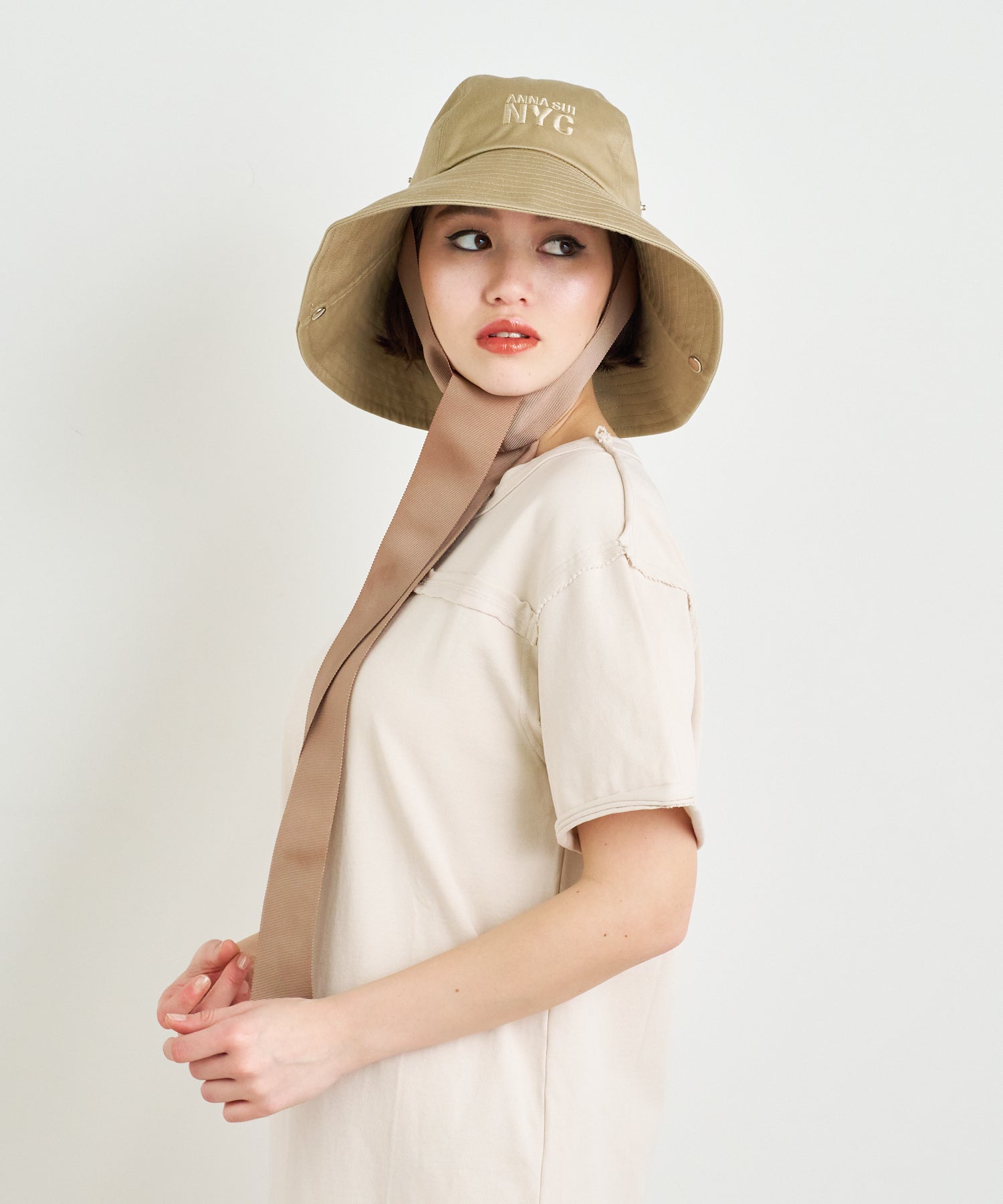 ツバ広で日よけに最適なツイル生地のサハラハット。サイドに付いているドットボタンでツバをたたんで着用することも可能!サイドに垂れる太いテープが存在感溢れる他にない可愛いデザインハットです。カジュアルからフェミニンなスタイリングまで幅広く着用できます。