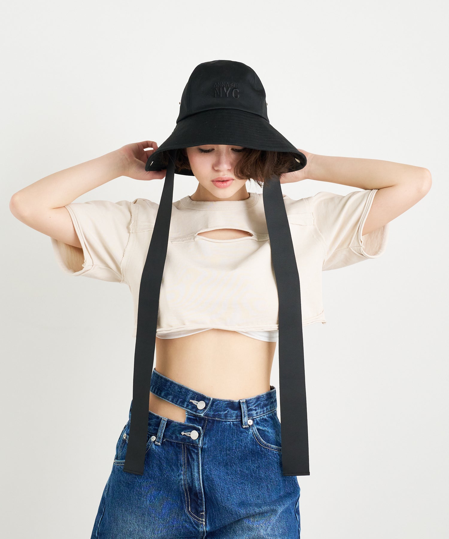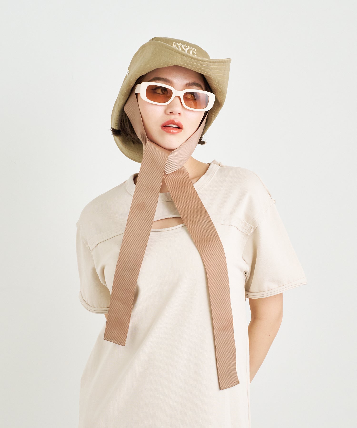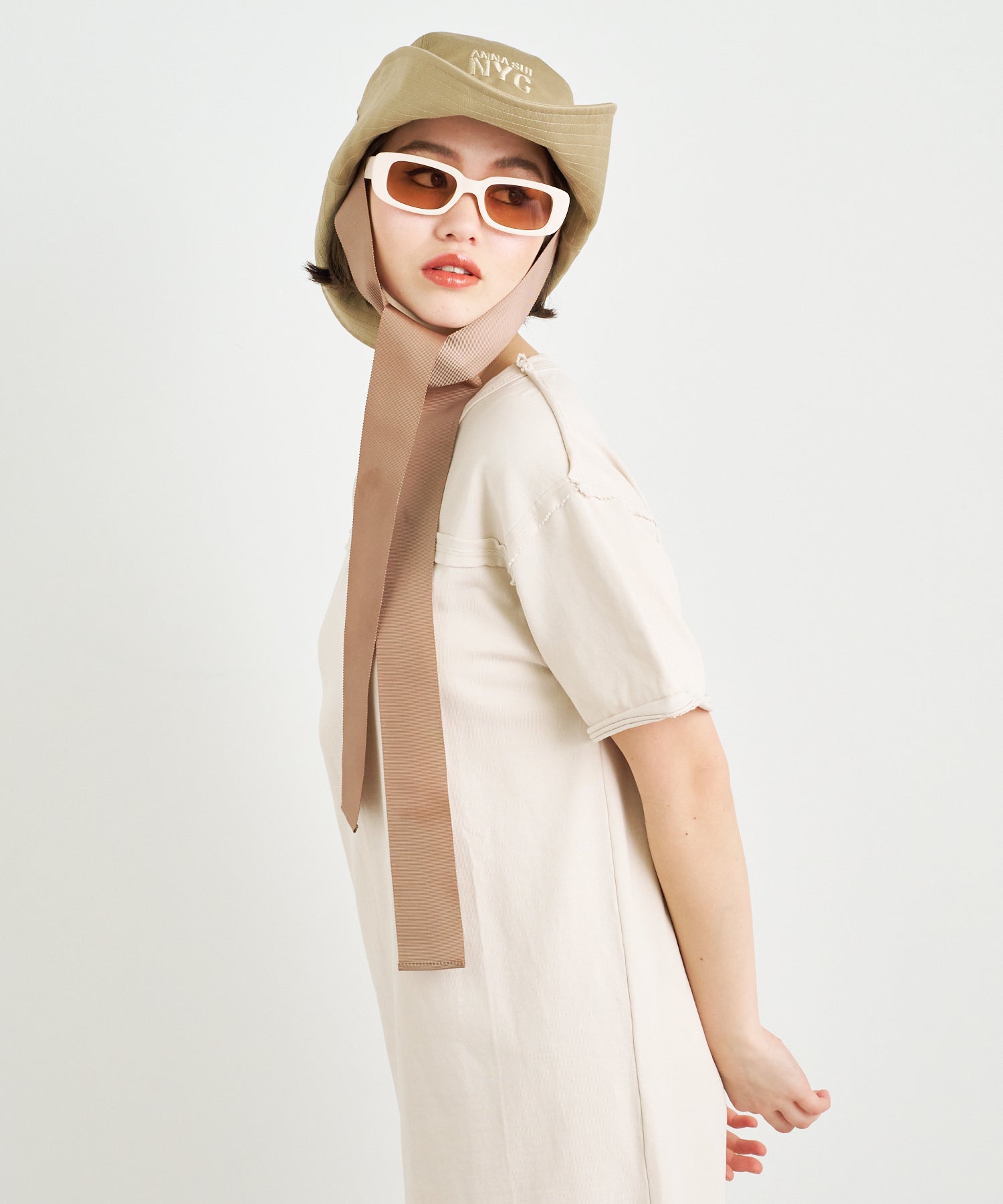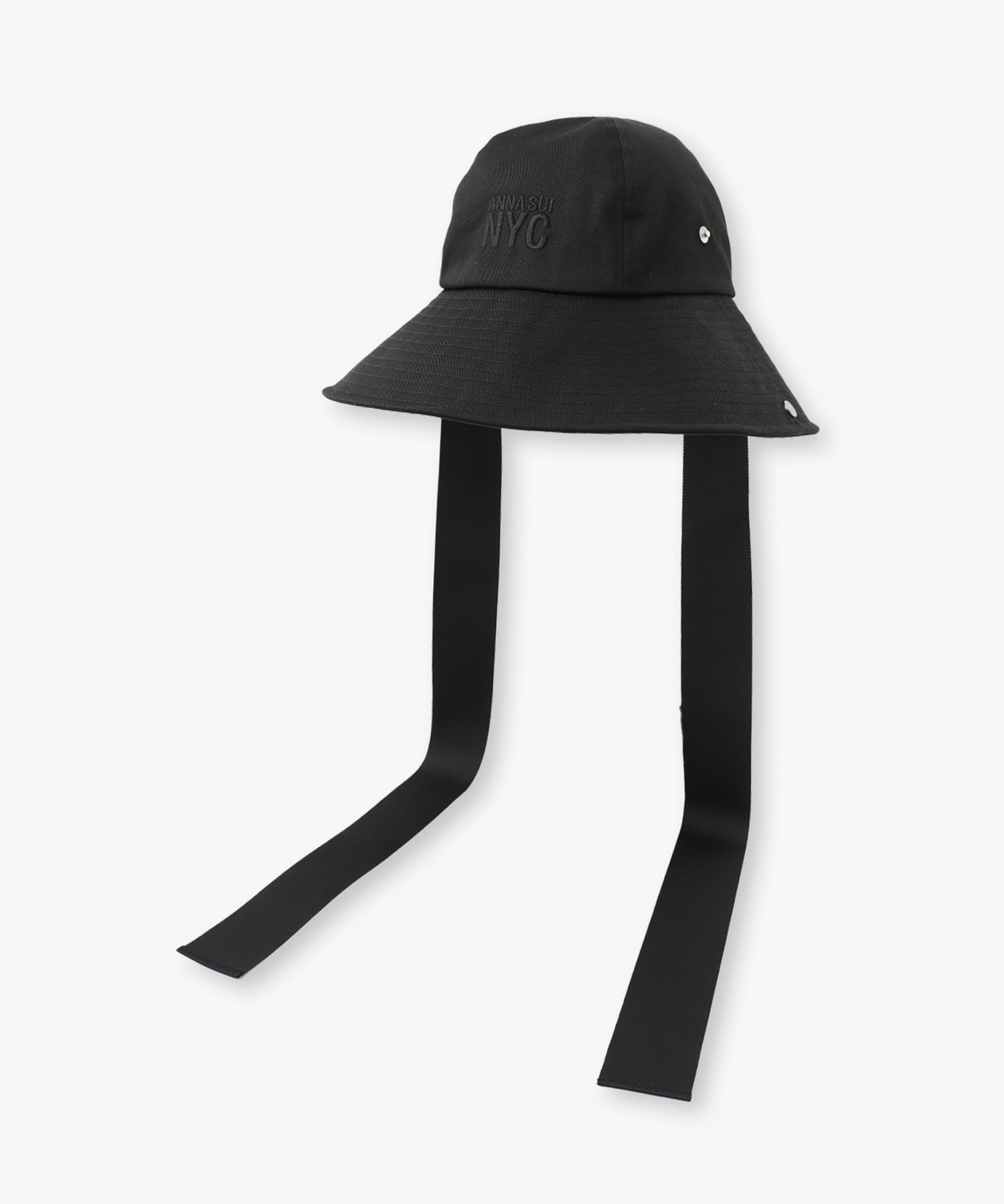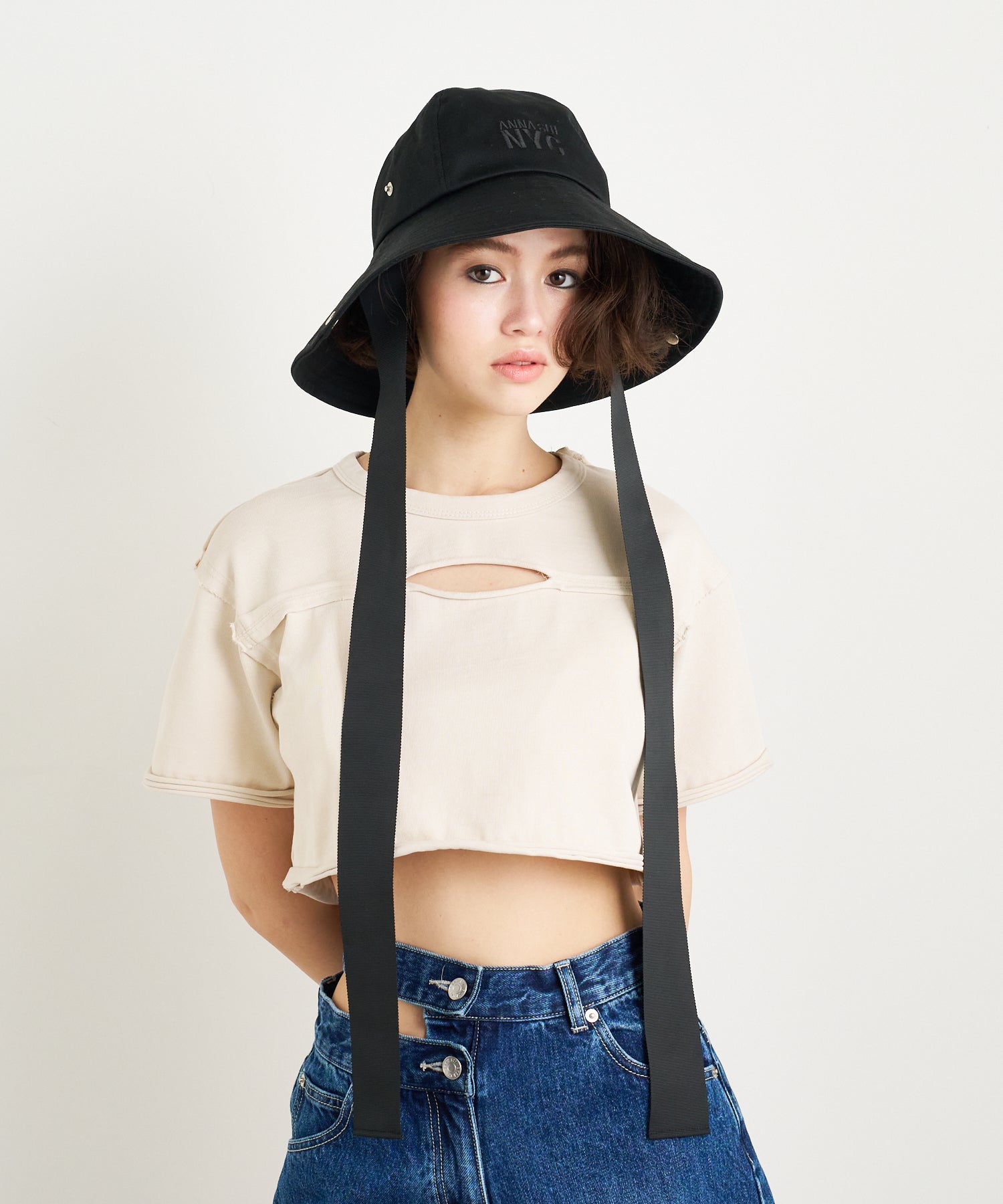 ツバ広で日よけに最適なツイル生地のサハラハット。サイドに付いているドットボタンでツバをたたんで着用することも可能!サイドに垂れる太いテープが存在感溢れる他にない可愛いデザインハットです。カジュアルからフェミニンなスタイリングまで幅広く着用できます。