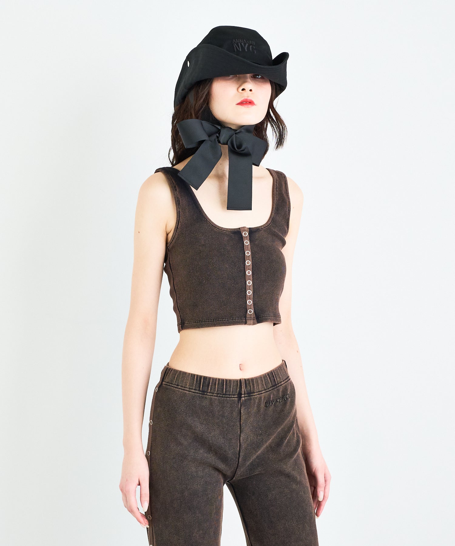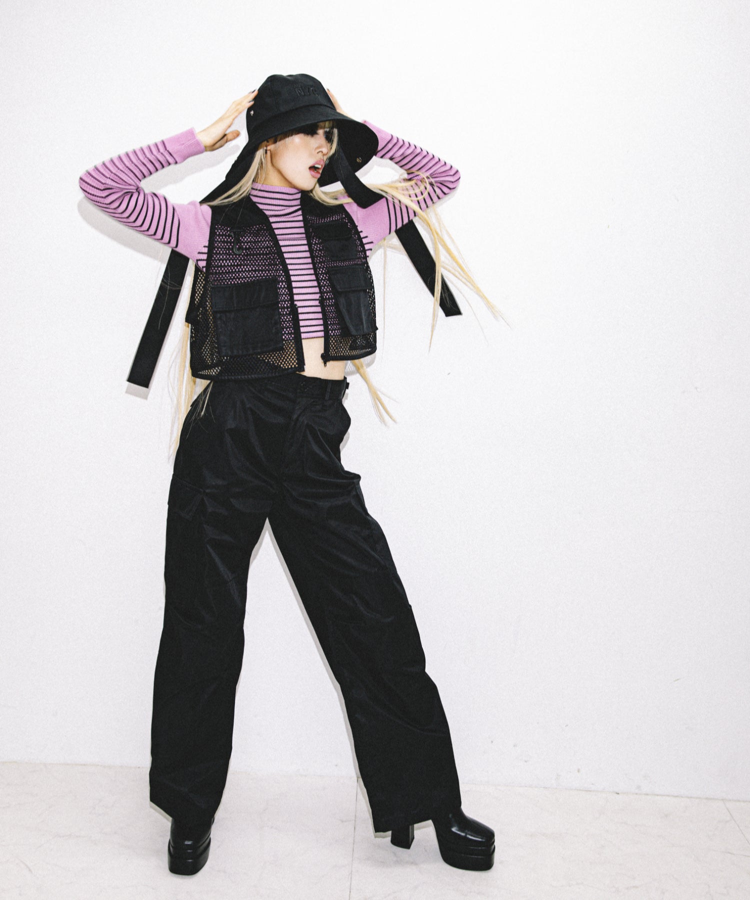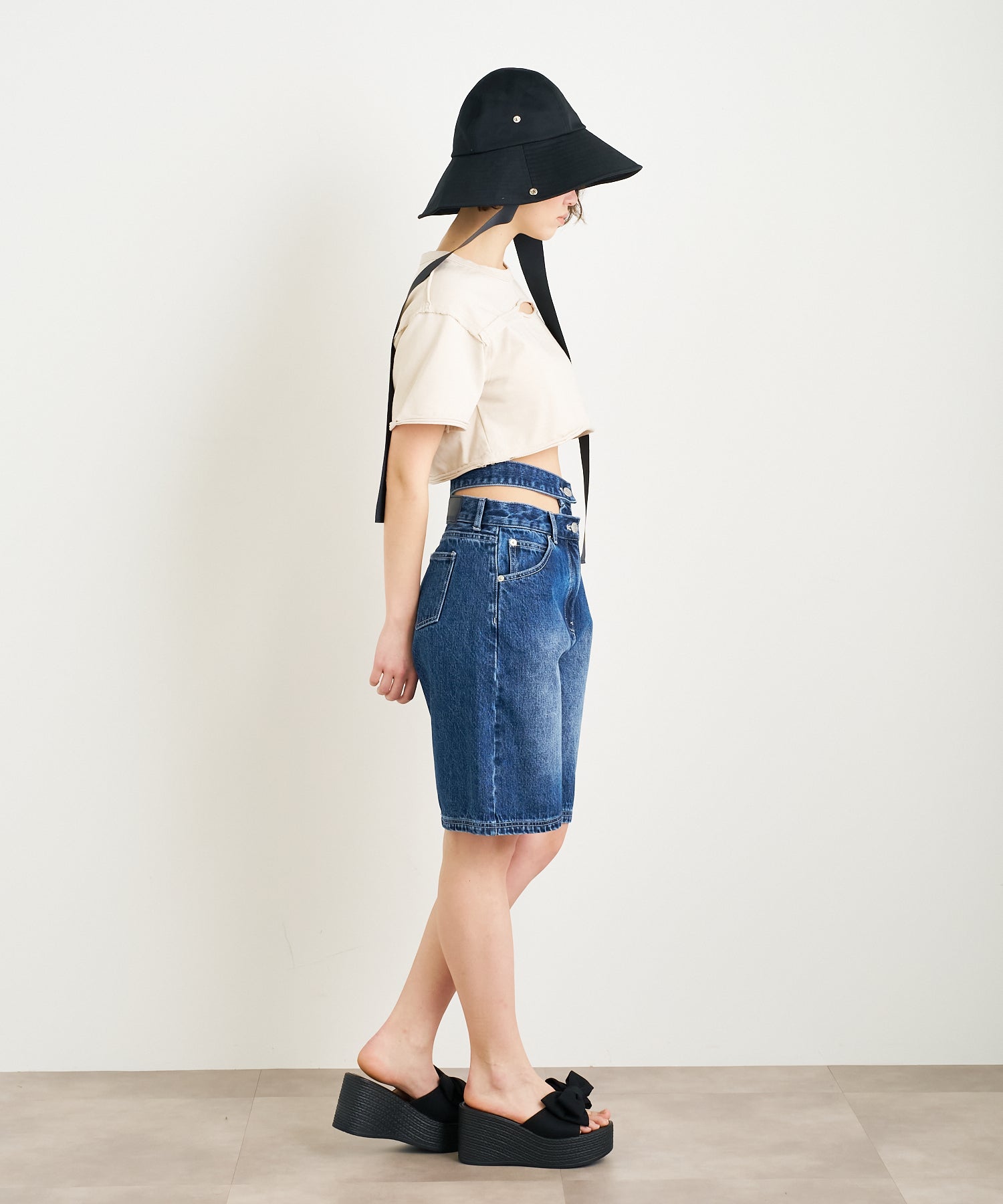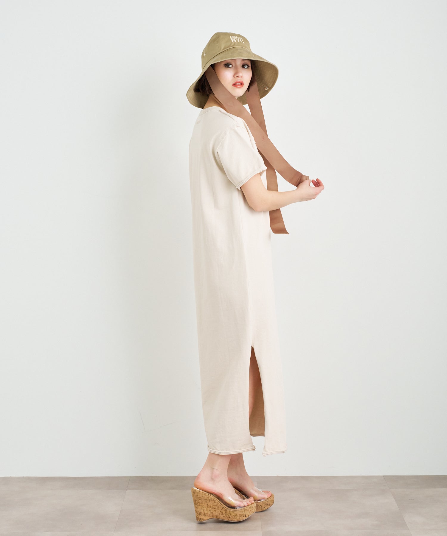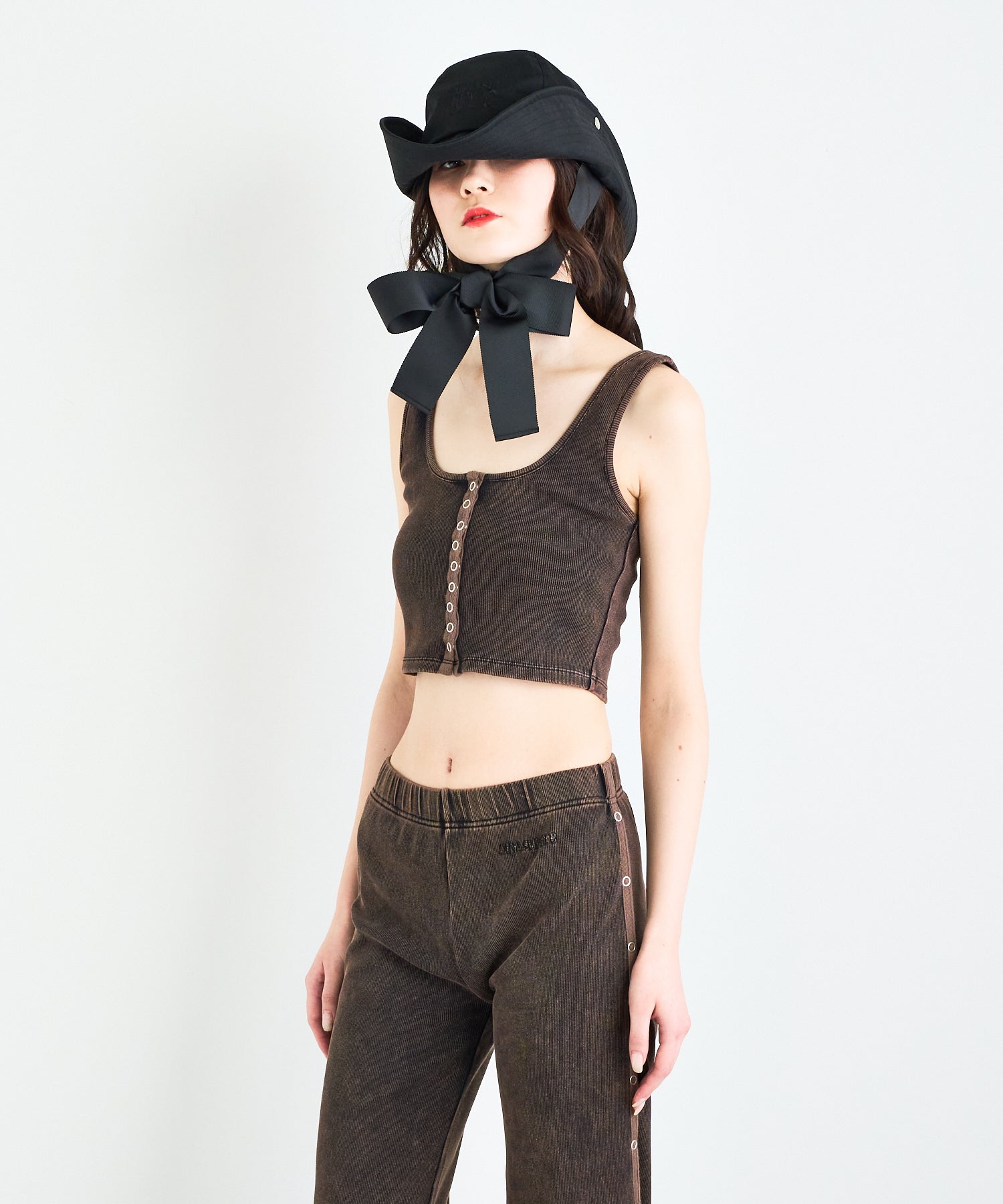 ツバ広で日よけに最適なツイル生地のサハラハット。サイドに付いているドットボタンでツバをたたんで着用することも可能!サイドに垂れる太いテープが存在感溢れる他にない可愛いデザインハットです。カジュアルからフェミニンなスタイリングまで幅広く着用できます。