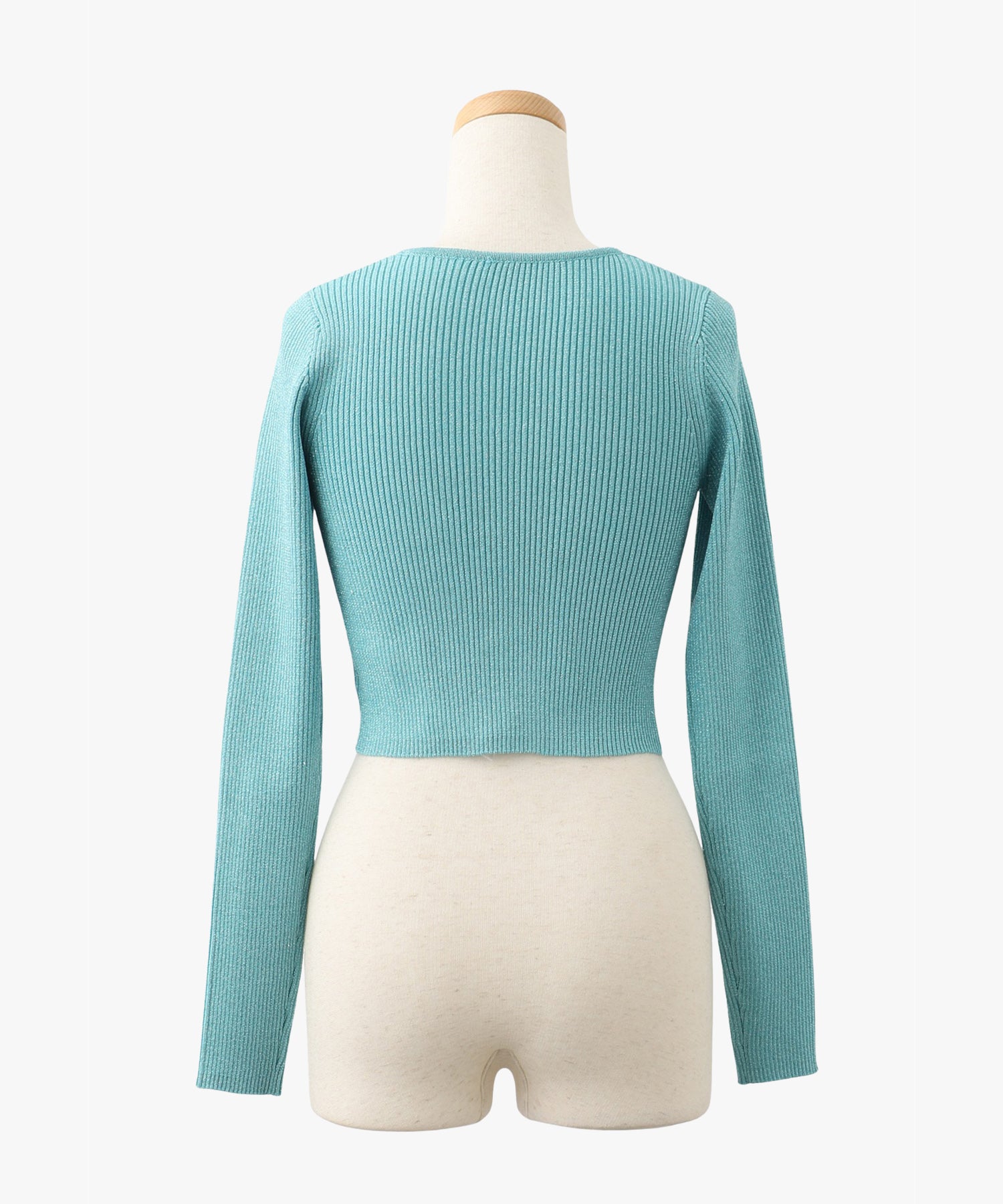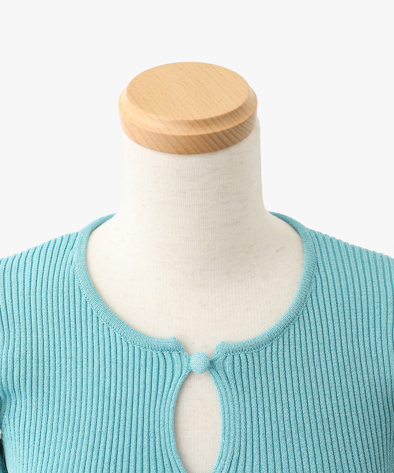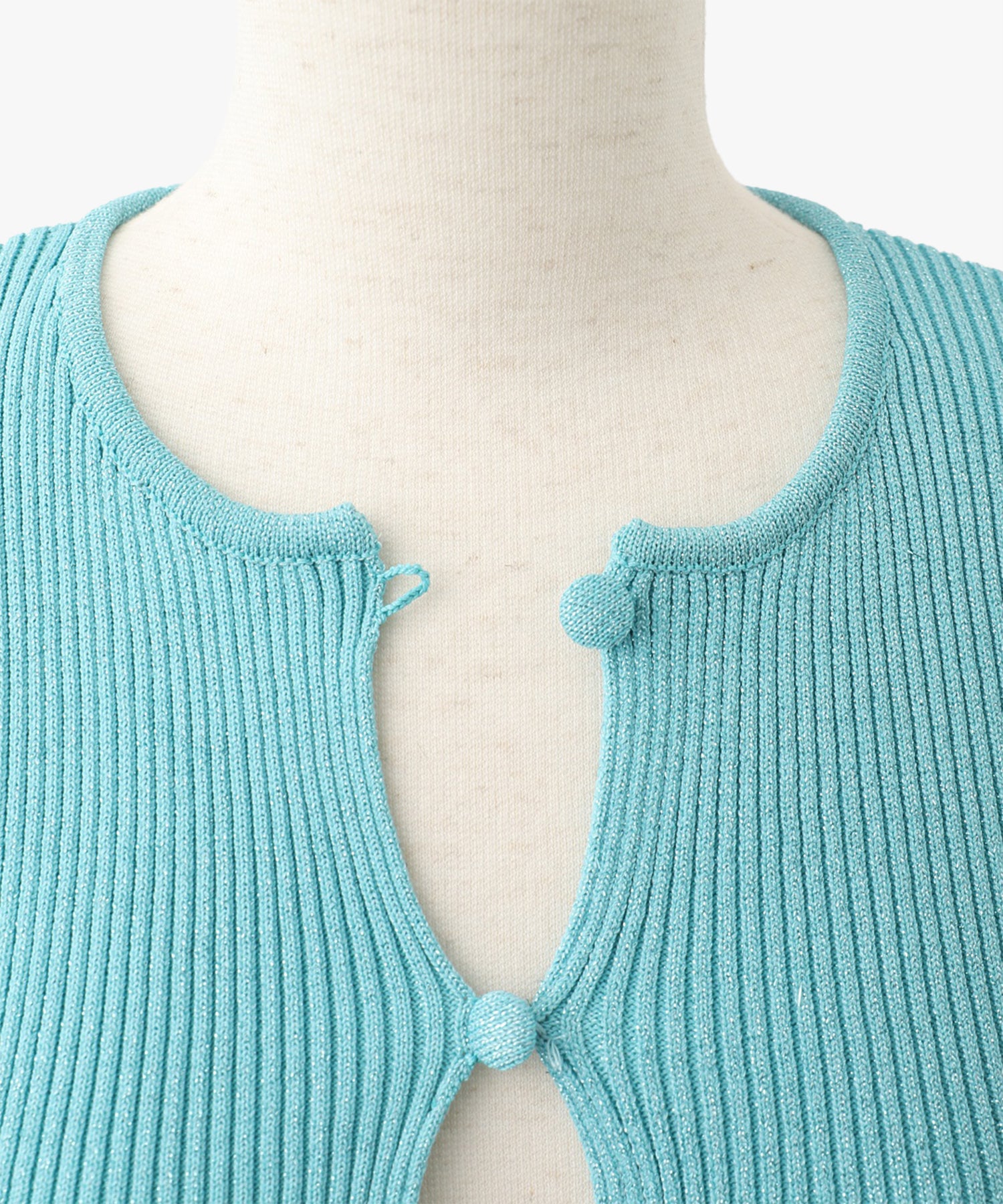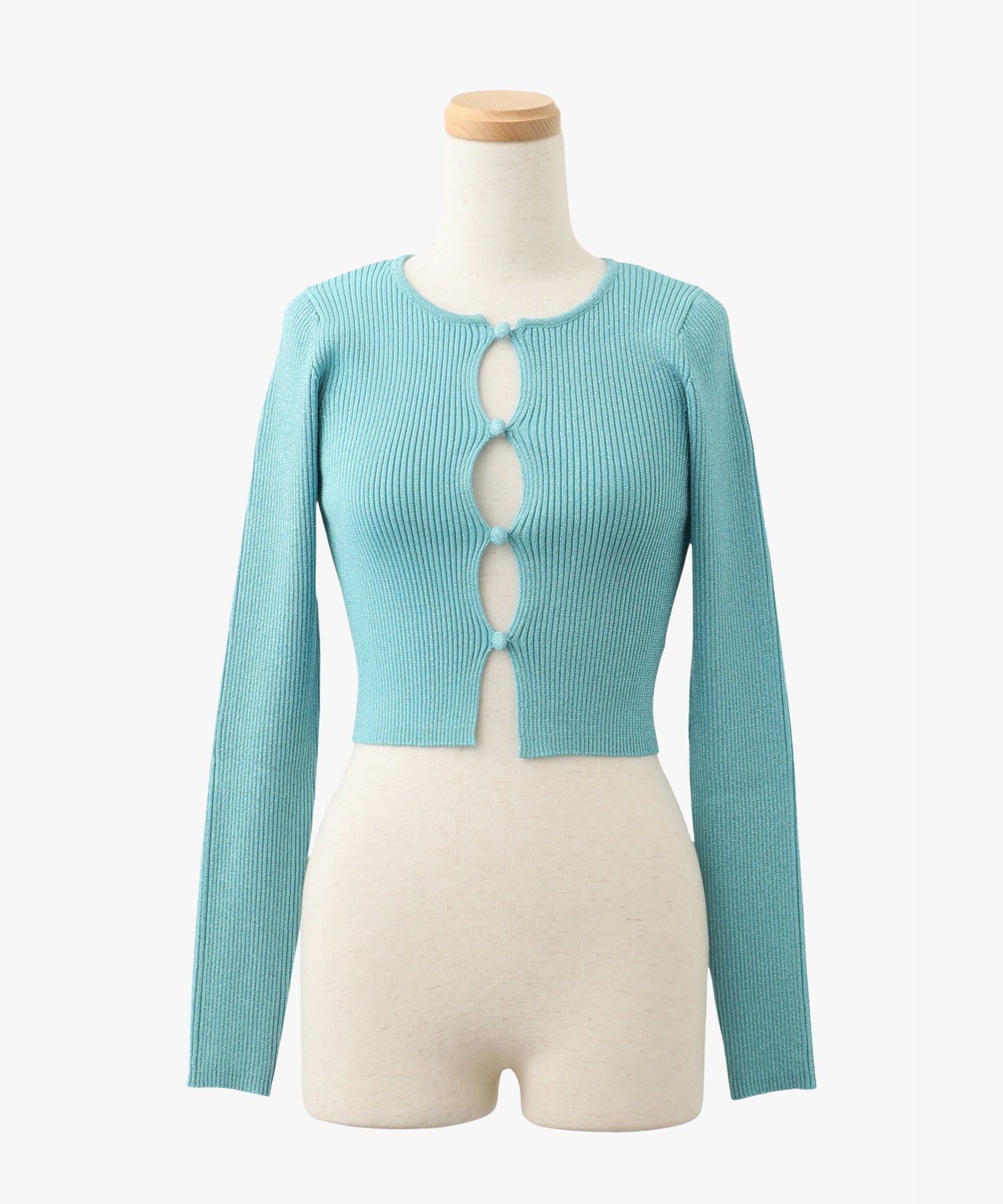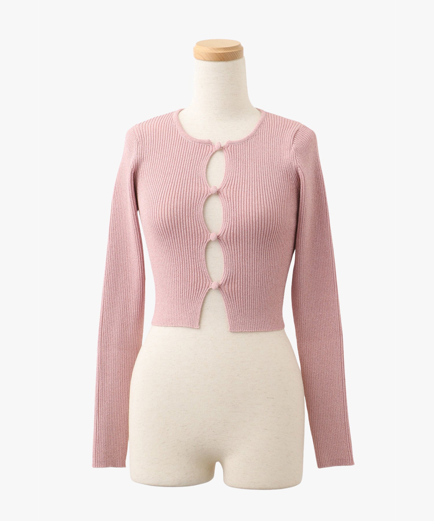 キラキラのラメが気分を上げてくれる伸縮性があるニットカーディガン。ボタンとボタンの隙間からインナーがのぞくため、色の組み合わせでスタイリングを楽しんでいただける1着です。羽織りにもインナーにもなる、着まわしが効く万能アイテムです◎