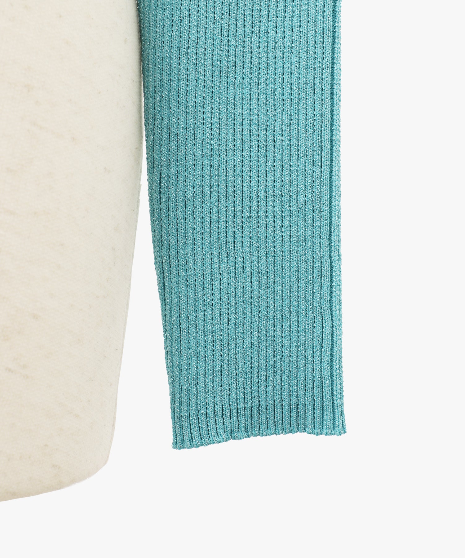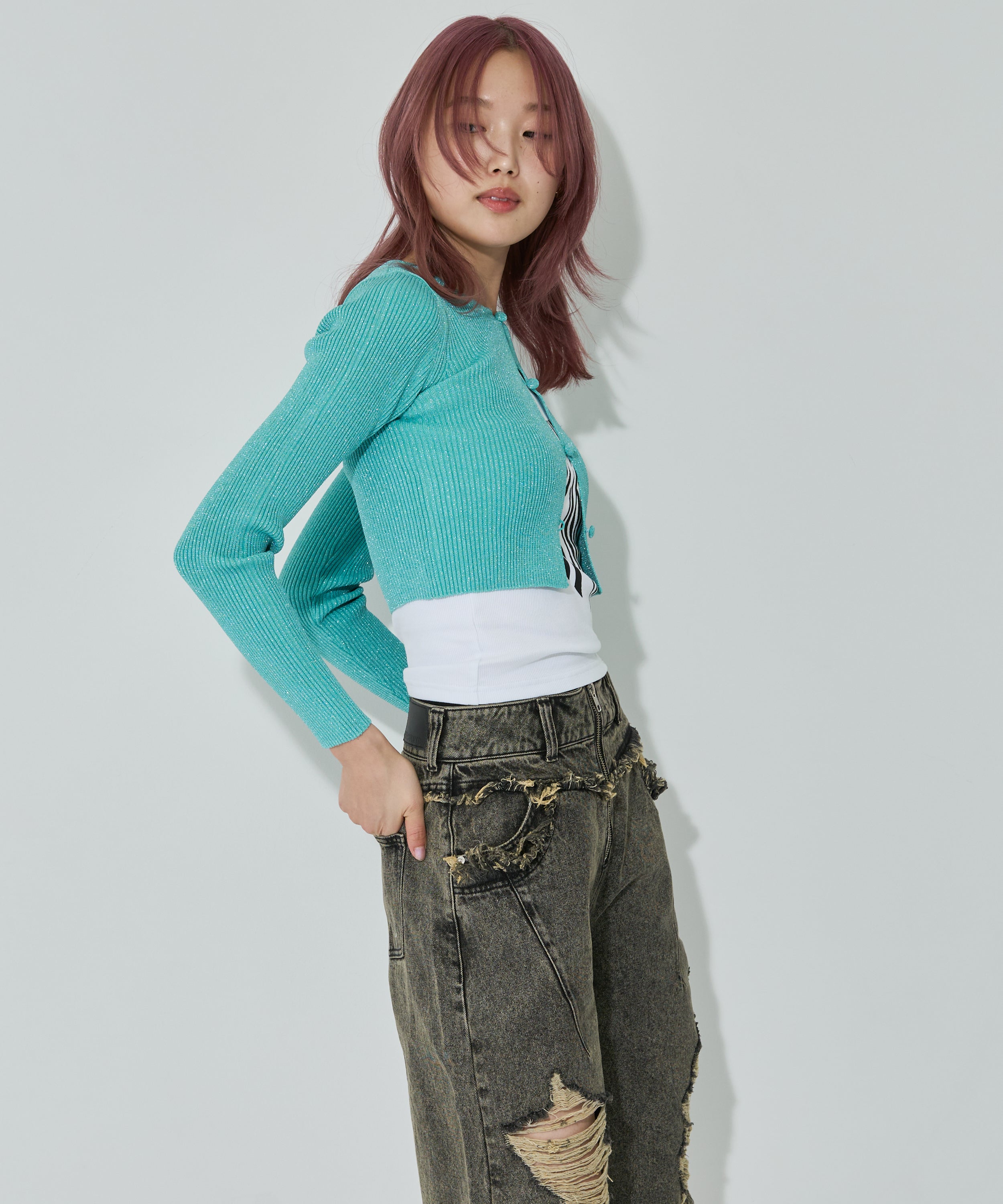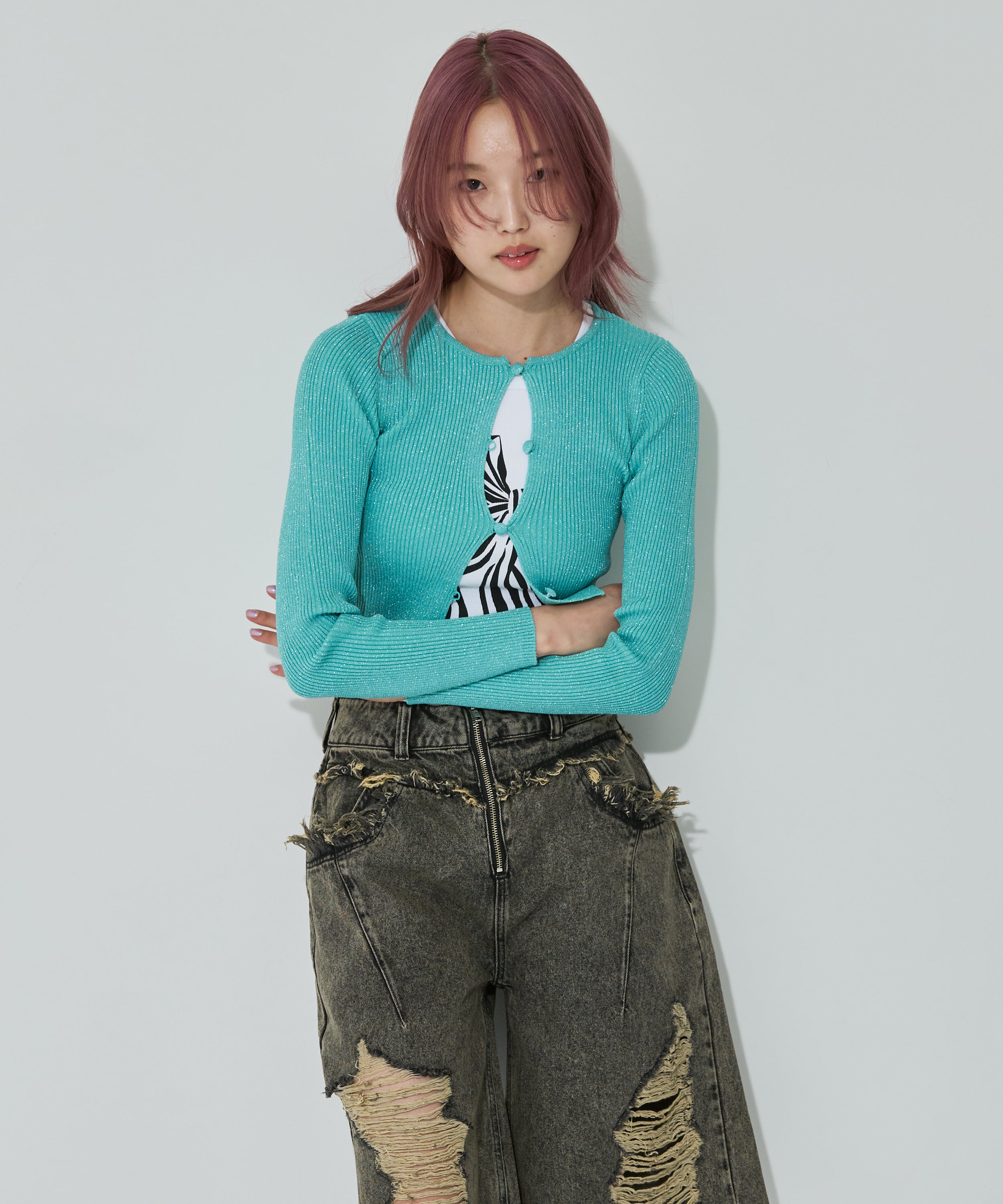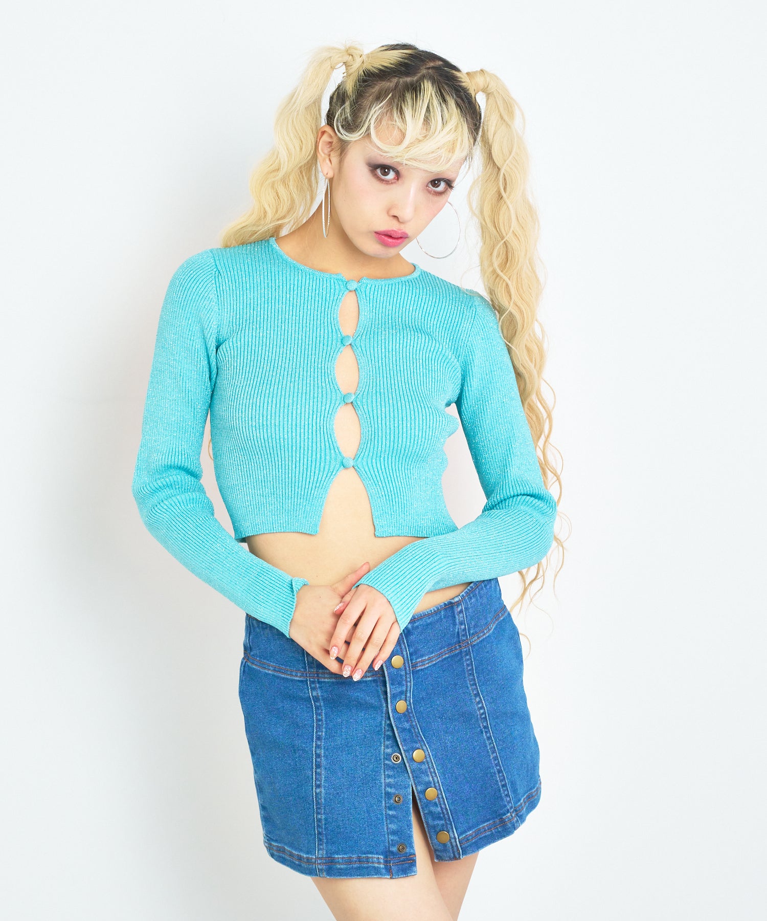キラキラのラメが気分を上げてくれる伸縮性があるニットカーディガン。ボタンとボタンの隙間からインナーがのぞくため、色の組み合わせでスタイリングを楽しんでいただける1着です。羽織りにもインナーにもなる、着まわしが効く万能アイテムです◎