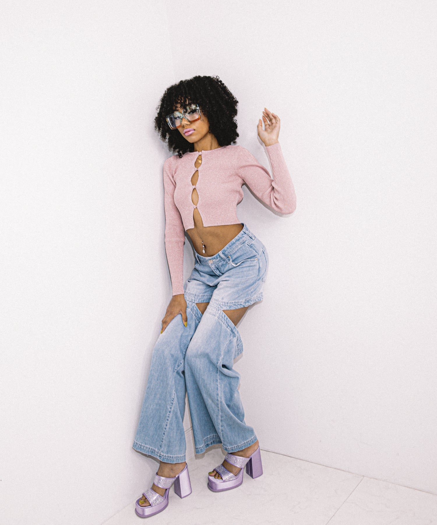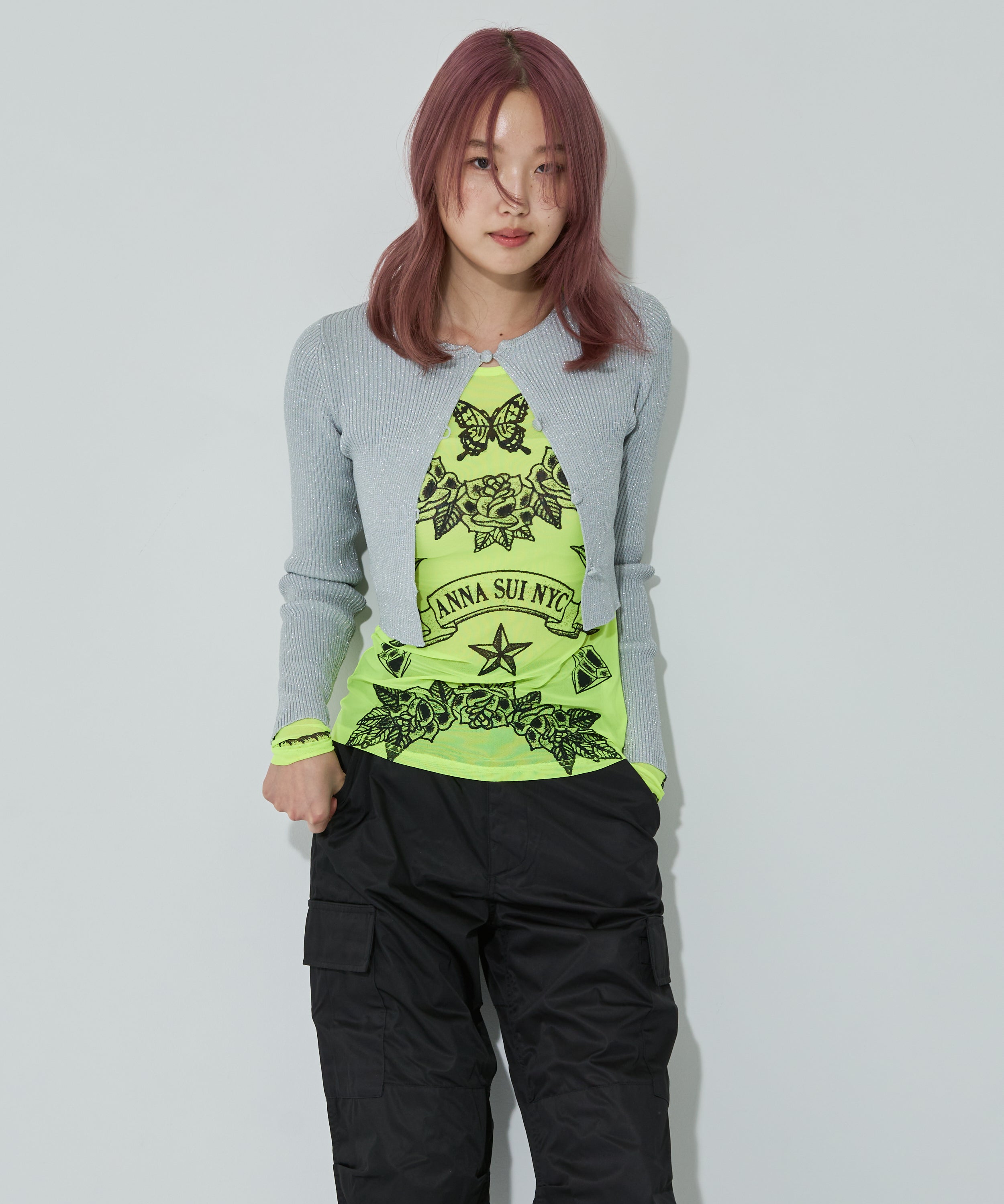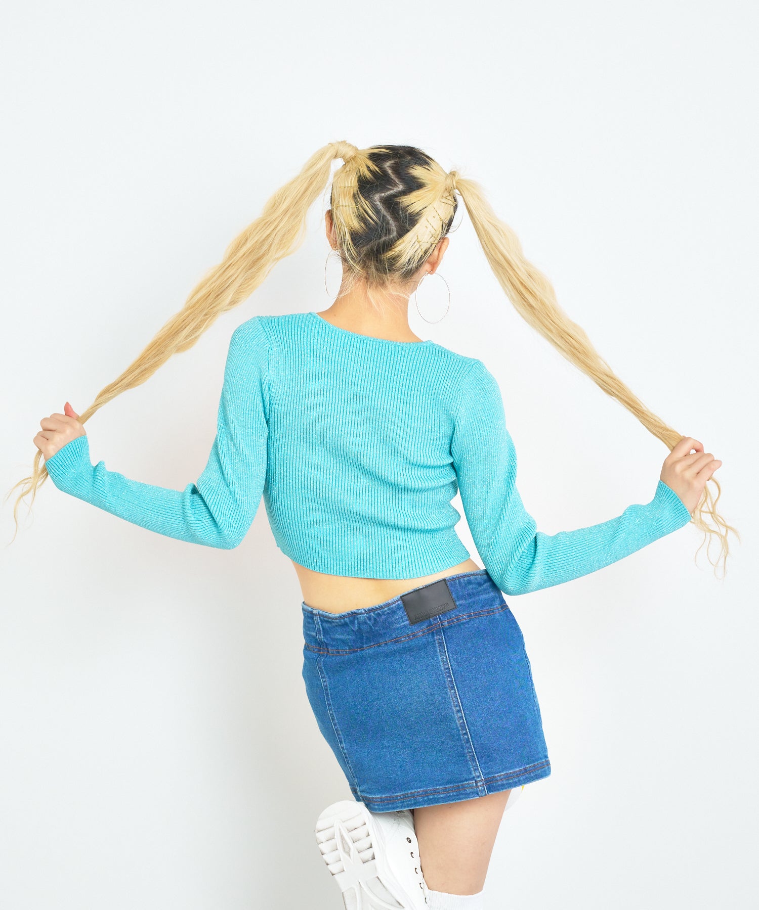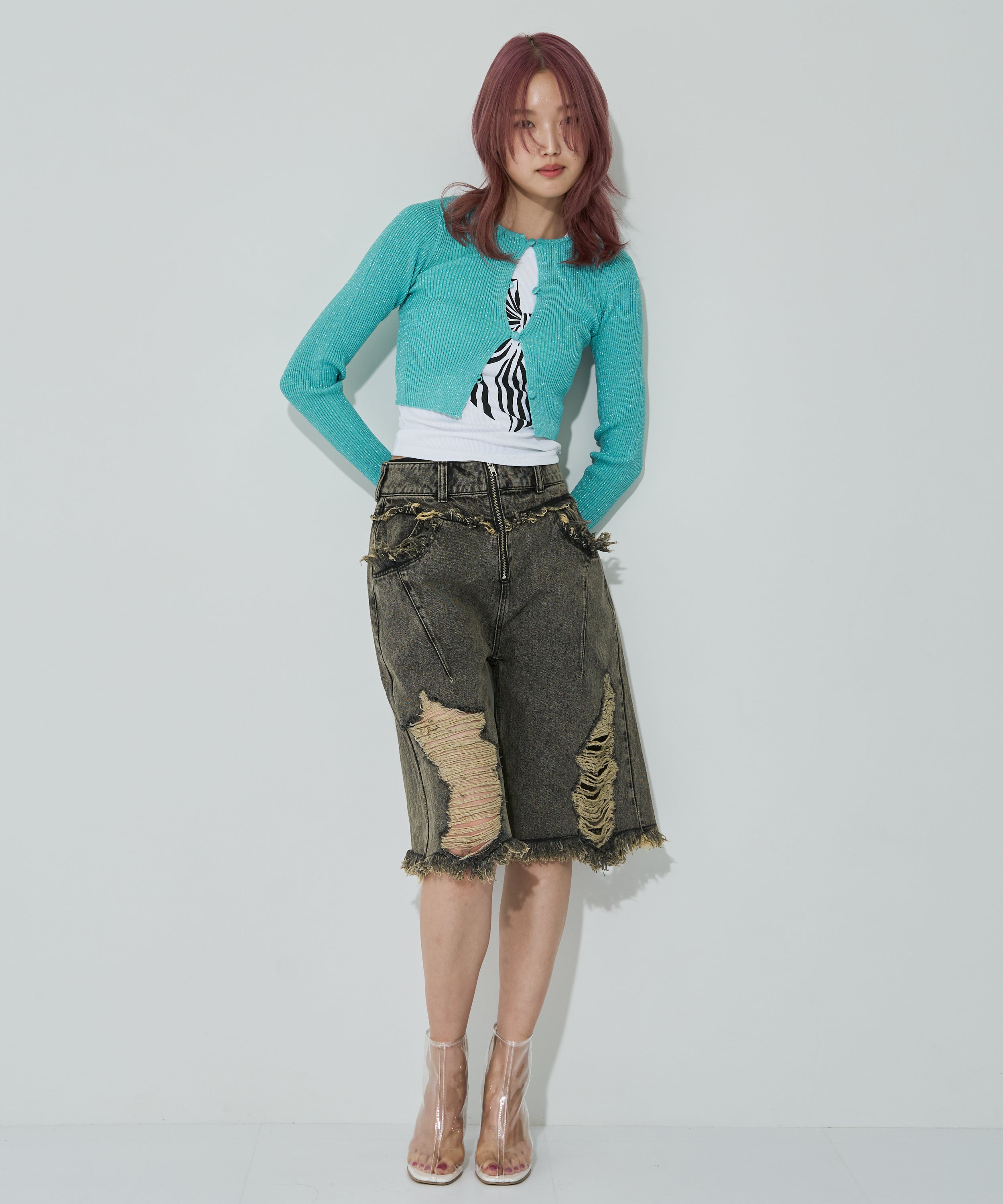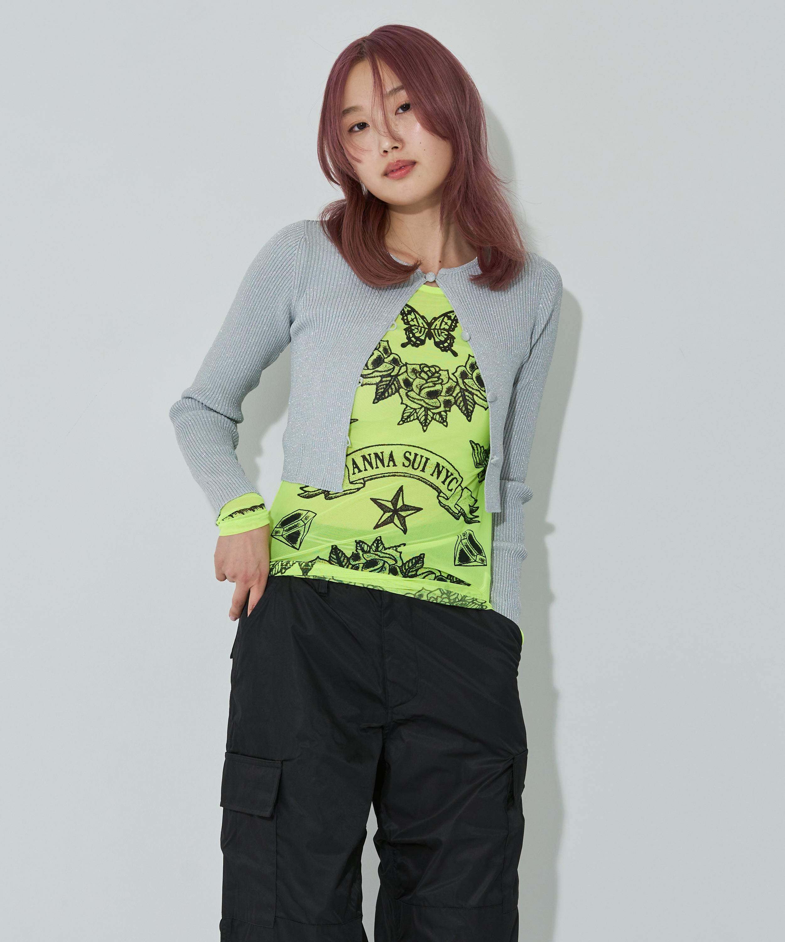 キラキラのラメが気分を上げてくれる伸縮性があるニットカーディガン。ボタンとボタンの隙間からインナーがのぞくため、色の組み合わせでスタイリングを楽しんでいただける1着です。羽織りにもインナーにもなる、着まわしが効く万能アイテムです◎