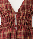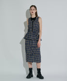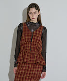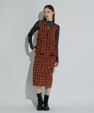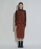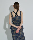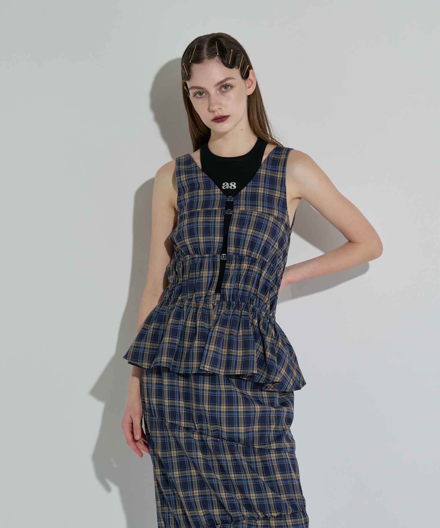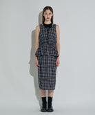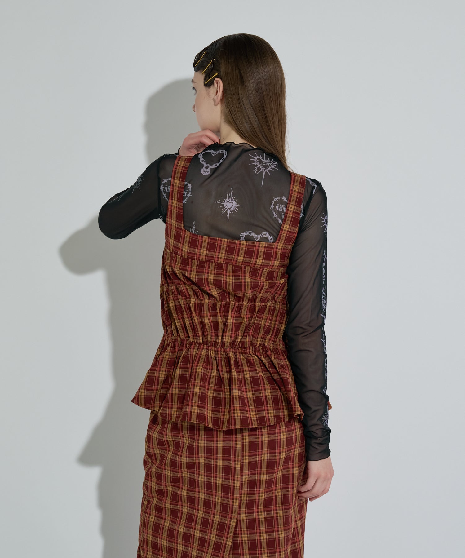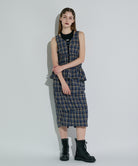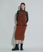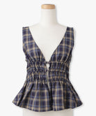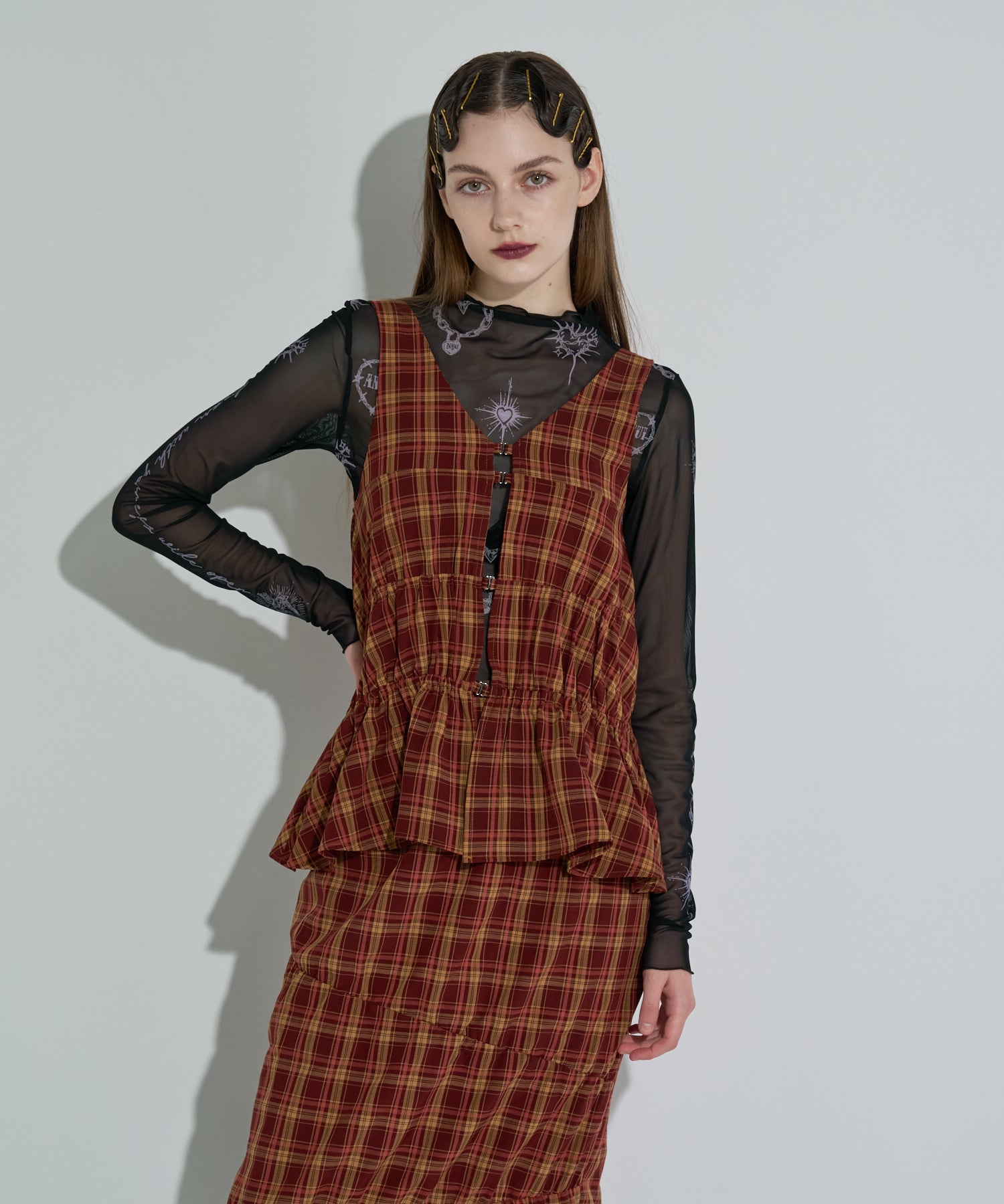 クラシカルなチェック柄に、ギャザーディテールで甘さを添えたノースリーブトップス。フロントからバックにかけてたっぷりと寄せられたギャザーが、立体感のある美しいシルエットを演出。ウエストを自然にマークしながら、裾に向かってふわりと広がるフレアが、フェミニンなムードを引き立ててくれます。前後どちらを前にしても着用できる2WAY仕様なので、その日の気分やスタイリングに合わせたアレンジが可能◎カラーは深みのあるレッドとネイビーの2色展開で、どちらも秋冬スタイルにぴったりの落ち着いた配色です。カジュアルにもクラシカルにも着こなせる、季節の変わり目に取り入れたい一着。同素材の“チェックシャーリングスカート”とセットアップでもご着用いただけます。