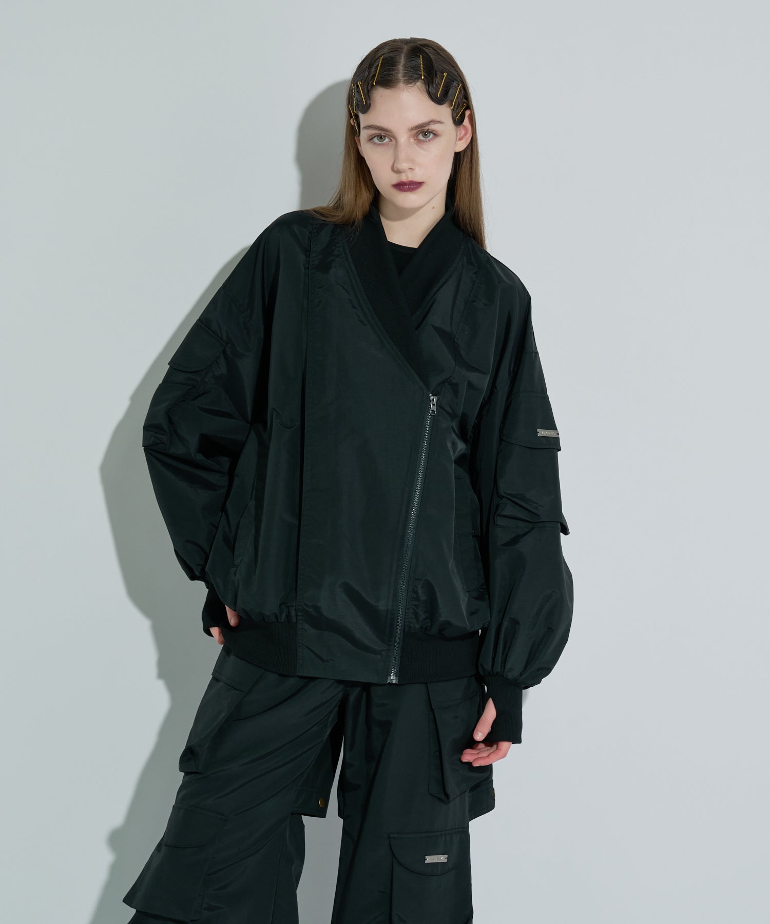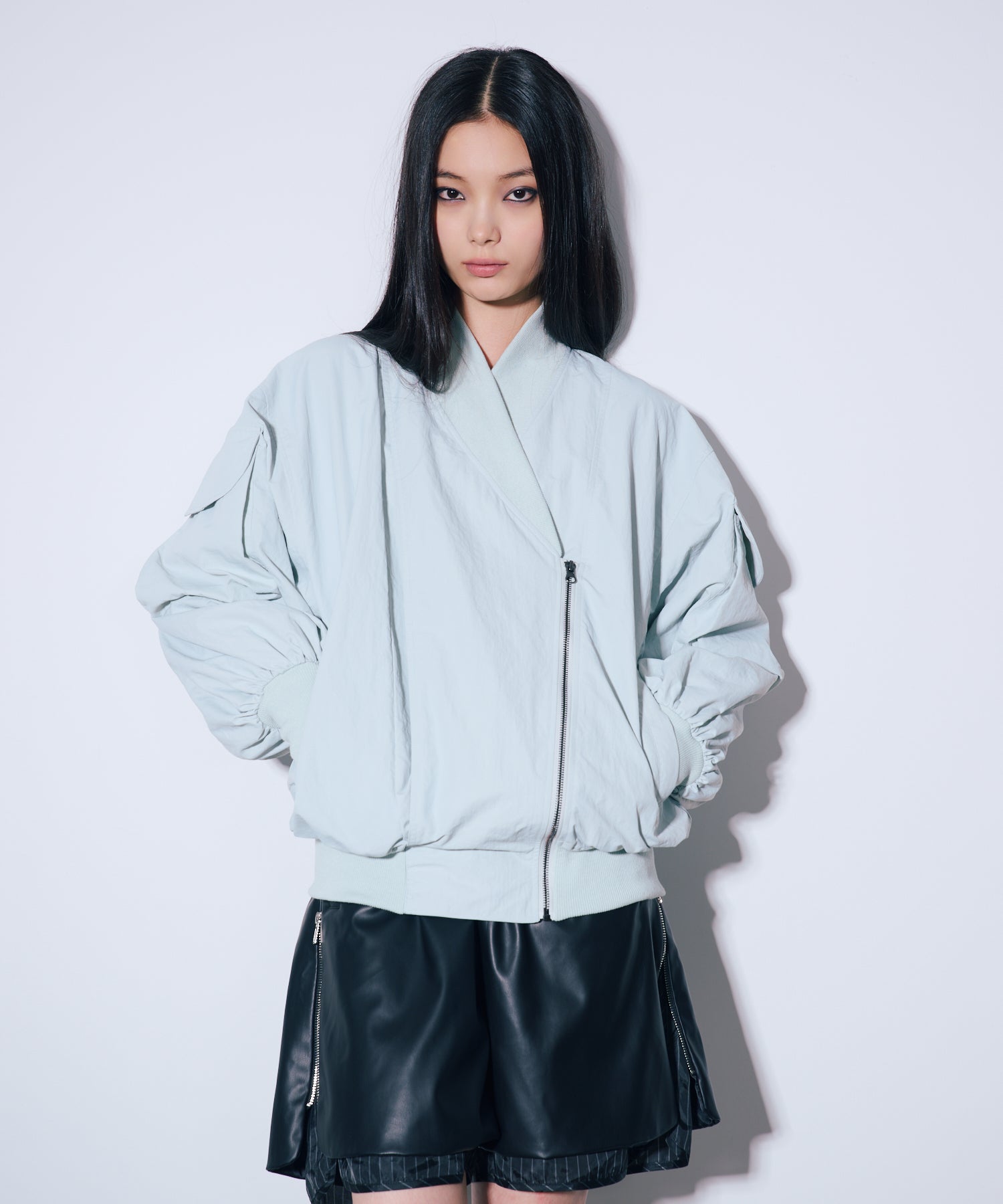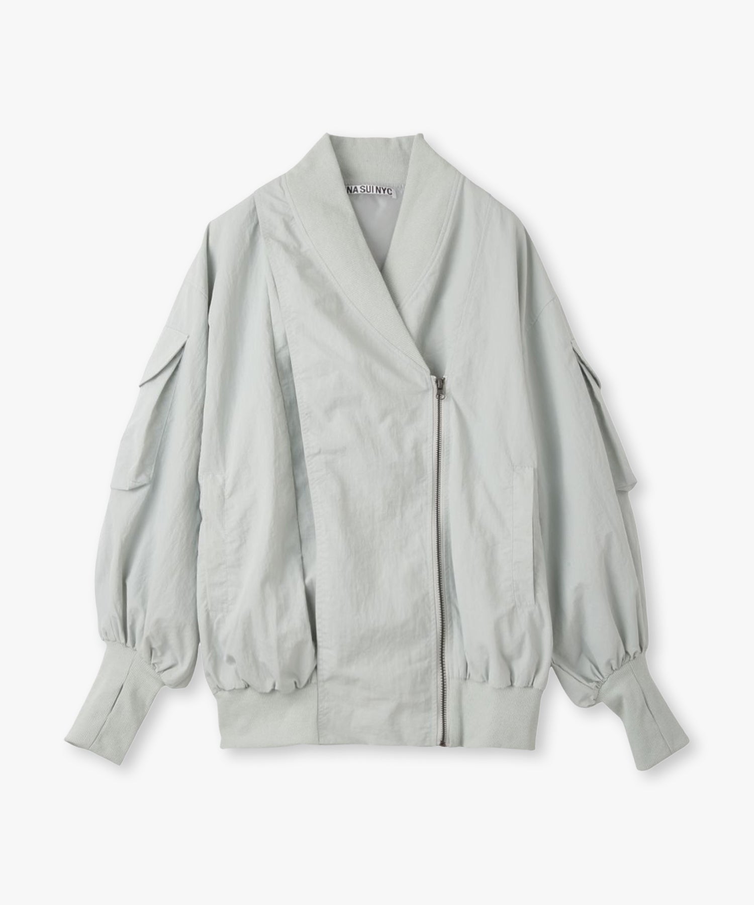 トレンド感のあるボリュームスリーブと、シャープなアシンメトリージップが印象的なナイロンブルゾン。軽やかでありながら程よいハリ感のある素材が、丸みを持たせたシルエットの立体感をより一層引き立ててくれます。襟元と袖口、裾にはリブを効かせて、スポーティさをプラス。ラフに着られるのに、どこかモード感も漂う絶妙なバランスが魅力です。