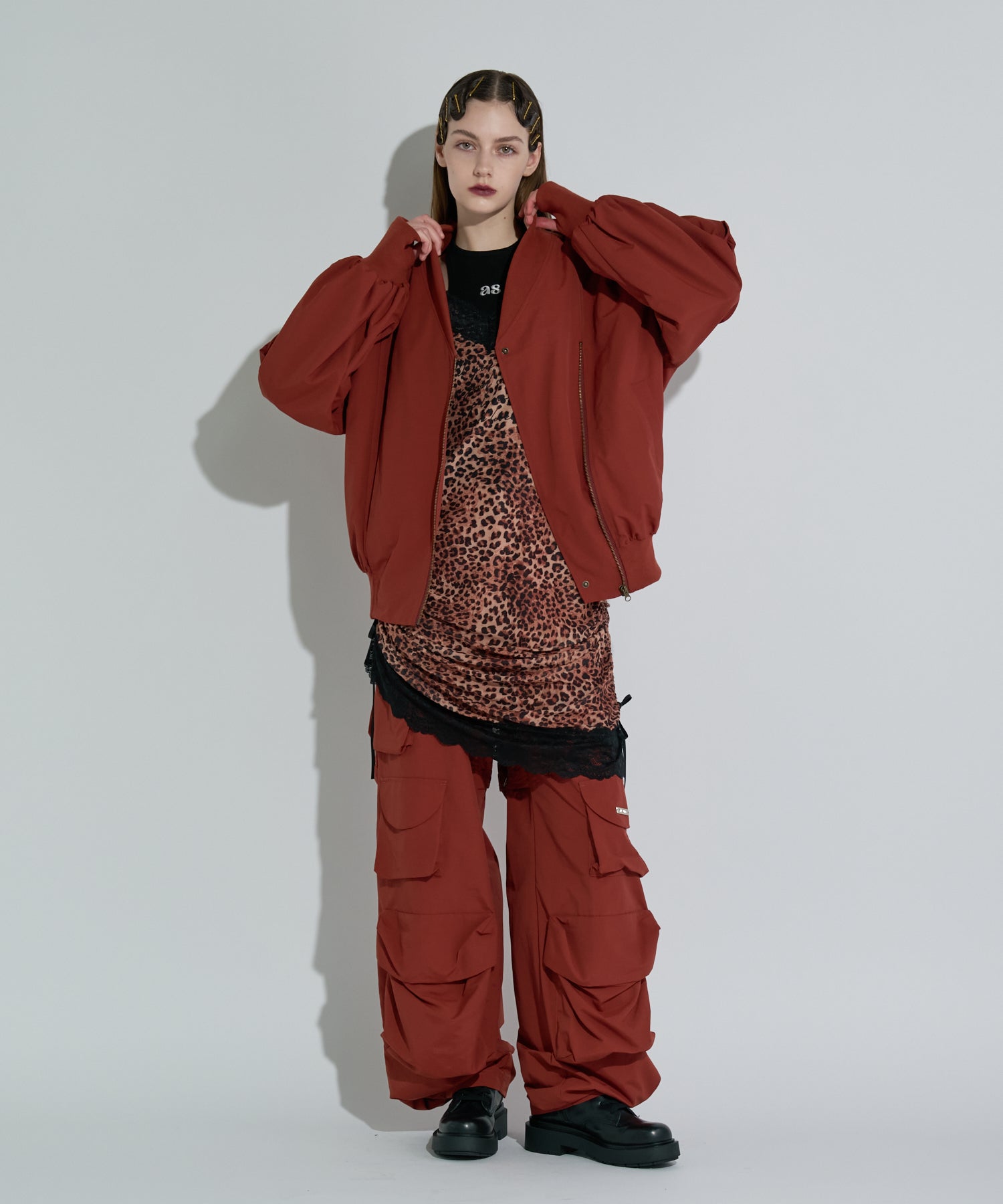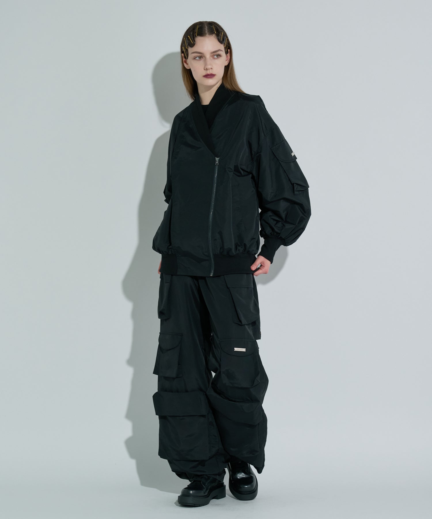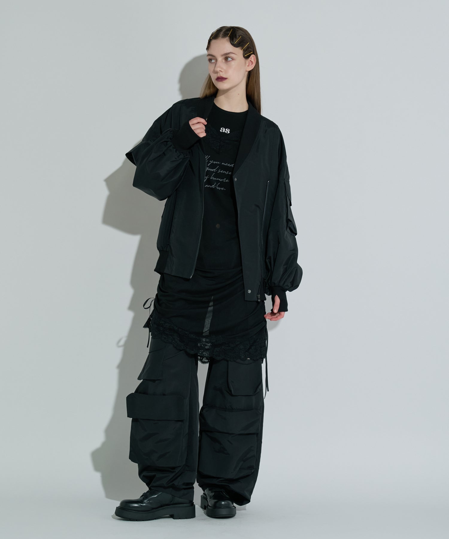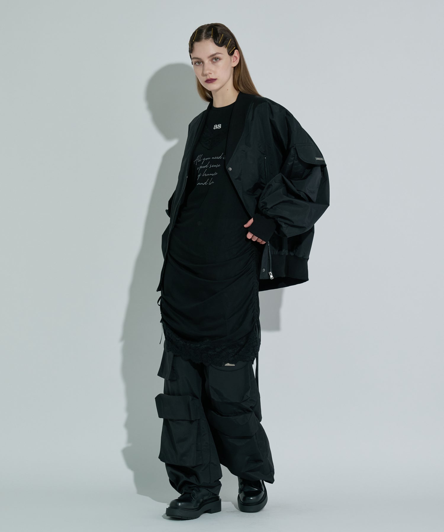 セットアップで着用できる同素材の“マットバギーロングパンツ”や”マットロングスカート”と合わせれば、都会的で洗練されたミリタリースタイルが完成。羽織るだけでスタイリングを格上げしてくれる、秋のワードローブに欠かせないアイテムです。