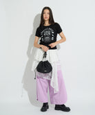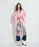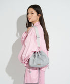 丸みのあるフォルムと、くしゅっとしたドローストリングデザインが目を惹くショルダーバッグ。表地にはナイロン素材を使用しており、デイリーユースにぴったりのタフさと、スポーティーで軽やかな質感が魅力です。 フロントに配置したロゴプレートがエッジを効かせ、カジュアルさの中に都会的な高級感をプラスしています。開口部は大きく開く巾着タイプで、荷物の出し入れもスムーズ。 ドローコードには、ビビッドな配色や柄コードを採用し、コーディネートのアクセントとして存在感を放ちます。