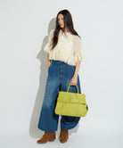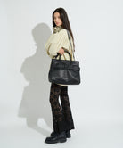 大きなベルトとバックルデザインが、レトロかつインパクト抜群のバッグ。表地には、本革のようなリッチな風合いを持ちながらも、軽量で雨や汚れにも強くお手入れがしやすい合成皮革を採用。くたっと柔らかく、使い始めから手に馴染むヴィンテージライクな質感が魅力です。ボディにはほんのり中綿を入れ、ふくらみのあるフォルムを演出。ほどよい厚みがニュアンス感を生み、シンプルなコーデにも品よく映えます。ハンドバッグとしてはもちろん、付属のライン入りショルダーストラップで斜めがけもできる2WAY仕様。マチが広く収納力もあり、デイリーからお出かけまで頼れる一品です。