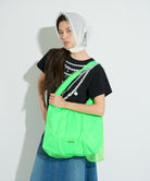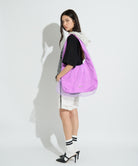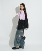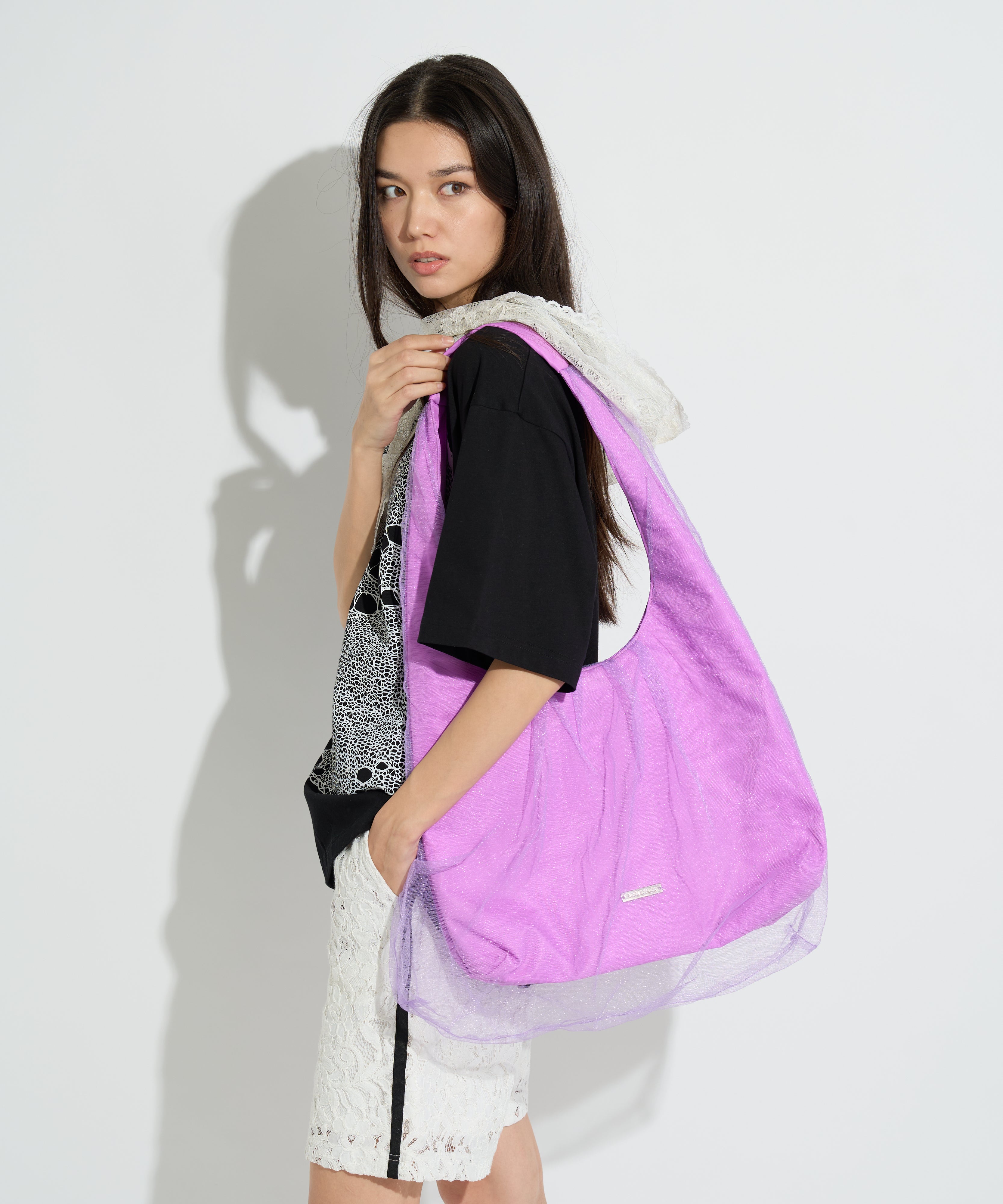 鮮やかな発色のボディ全体を繊細なチュール素材で包み込んだ、エアリーな表情が魅力のバッグ。ベースの表地にはナイロン素材を使用し、スポーティーな質感に仕上げつつ、透け感のあるソフトチュールを重ねることで、カジュアルさとロマンティックなムードを絶妙にミックスさせたこだわりのデザインです。ハンドル部分まで続くくしゅっとしたギャザーが立体感を生み出し、動くたびにふんわりとしたニュアンスを演出。 幅広のワンハンドルで肩掛けしやすく、ナイロン特有の軽量さで長時間持っても疲れにくい実用性もポイントです。 フロントにはさりげなくロゴプレートをあしらい、全体を引き締めるアクセントに。