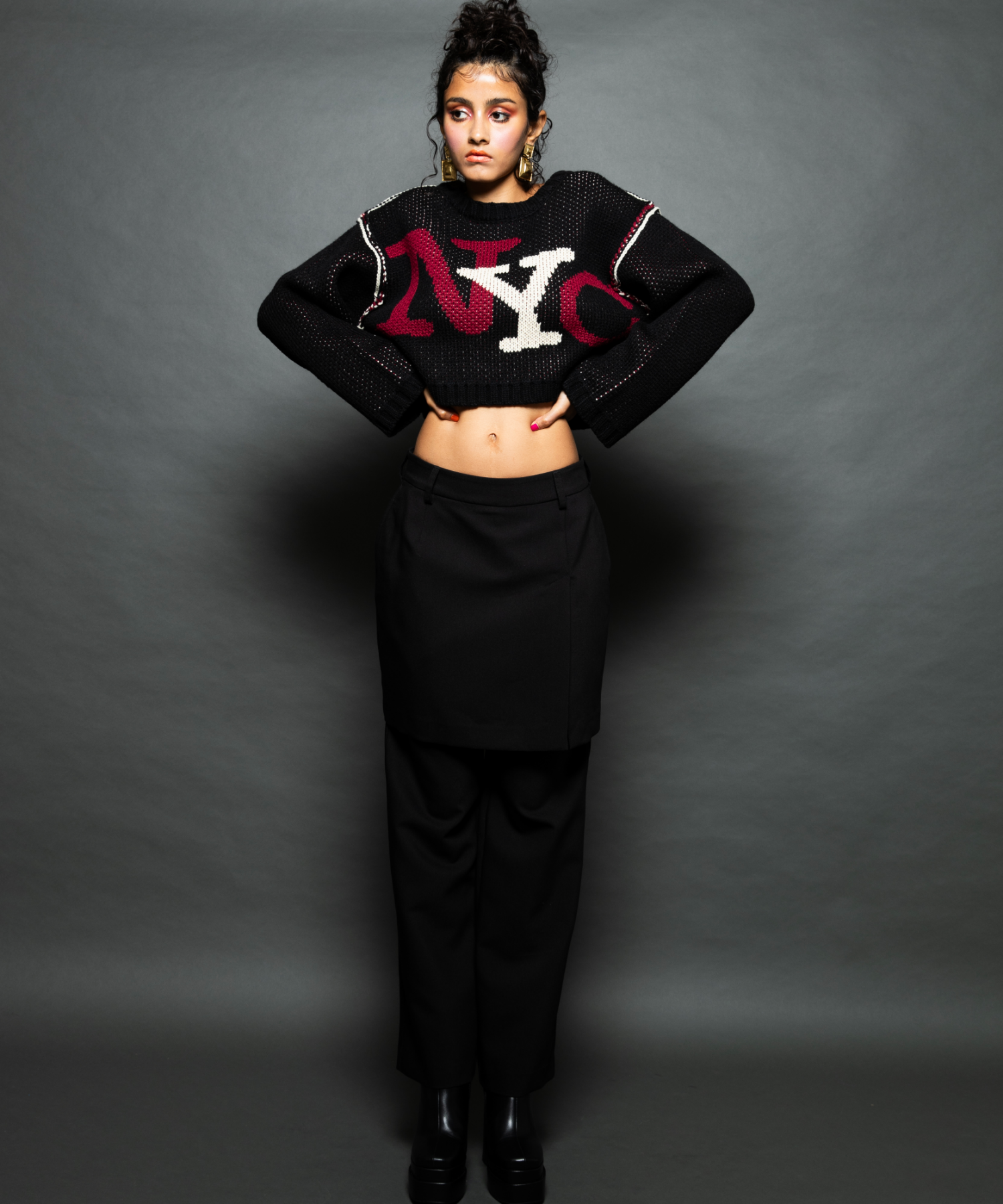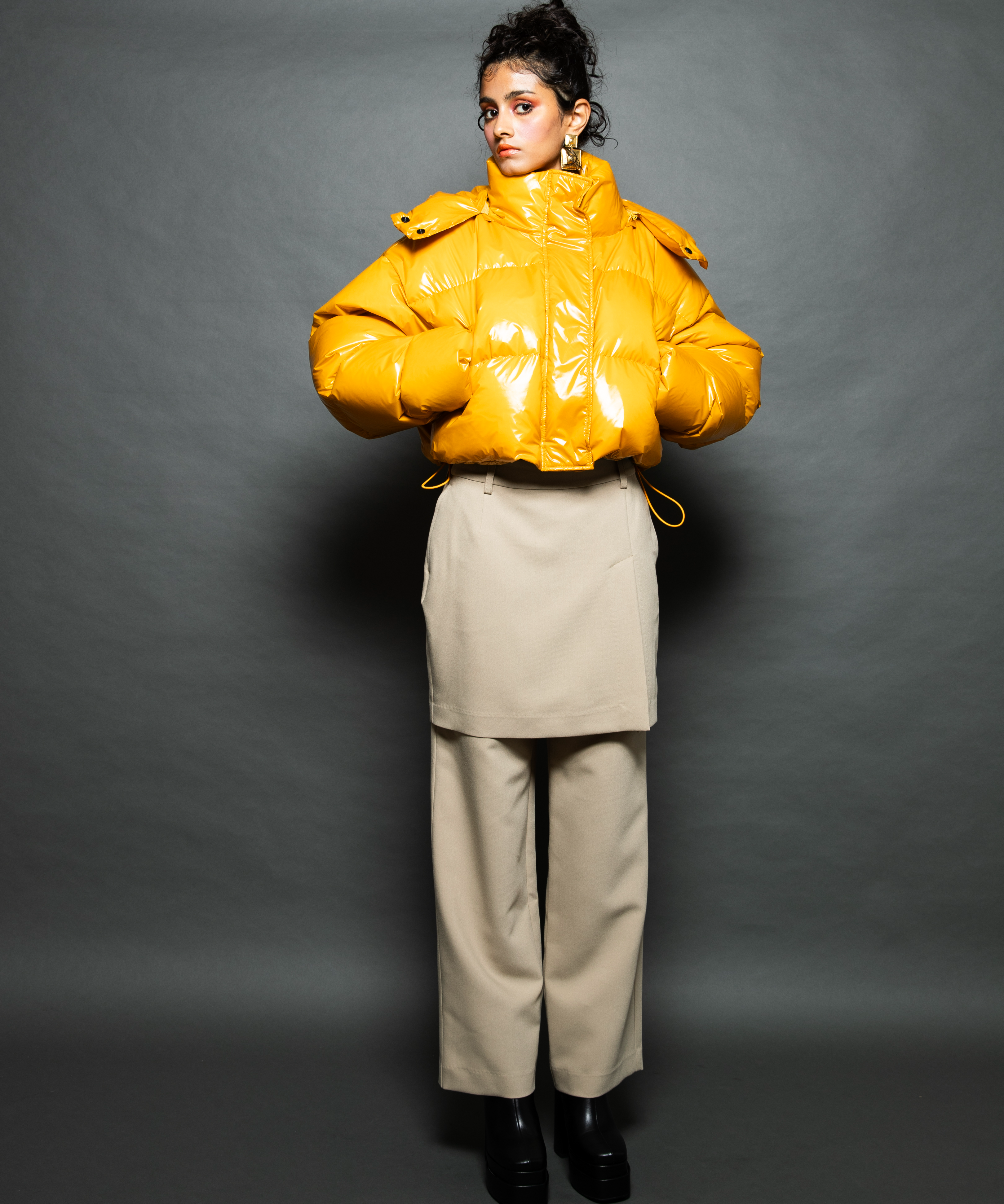 メンズライクなトラウザーの上にタイトなスカートを重ねた、ユニークなデザインのパンツ。個性的なスタイルを好む方へおすすめです。スカートに入っているスリットがアクセントになっています。