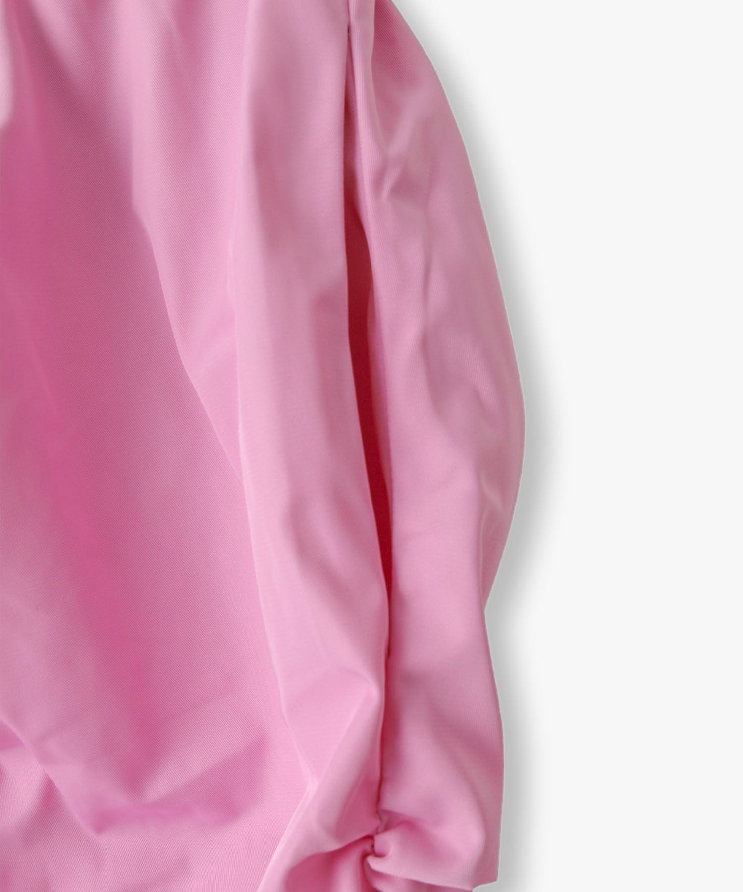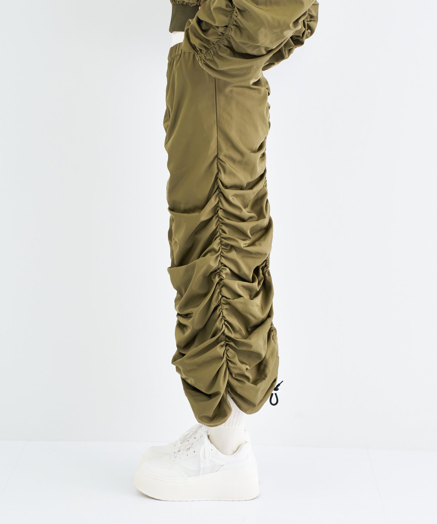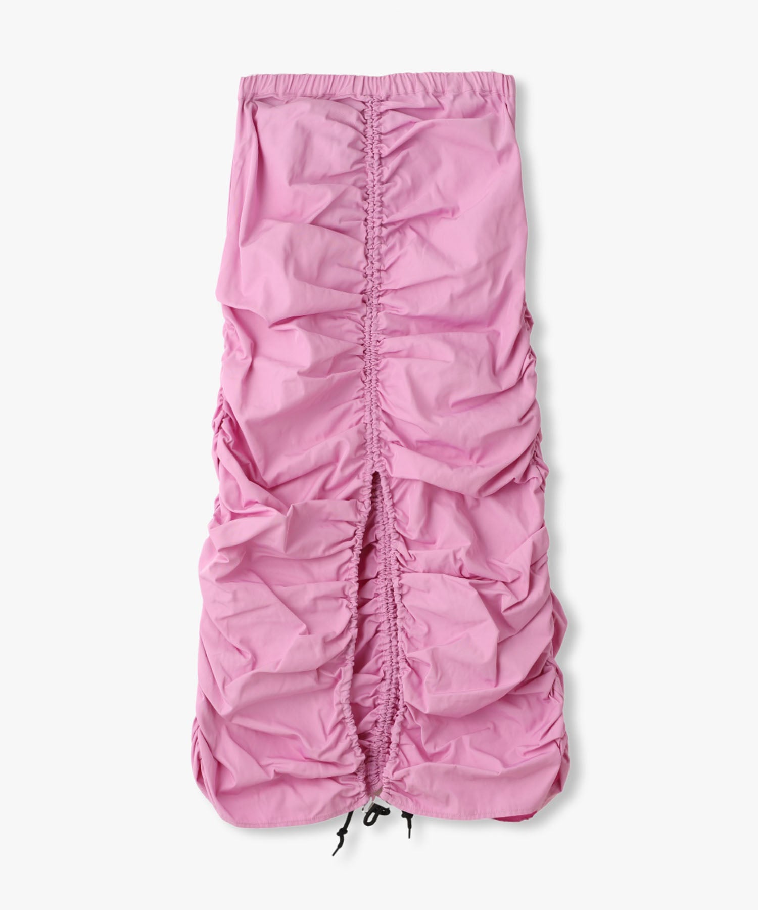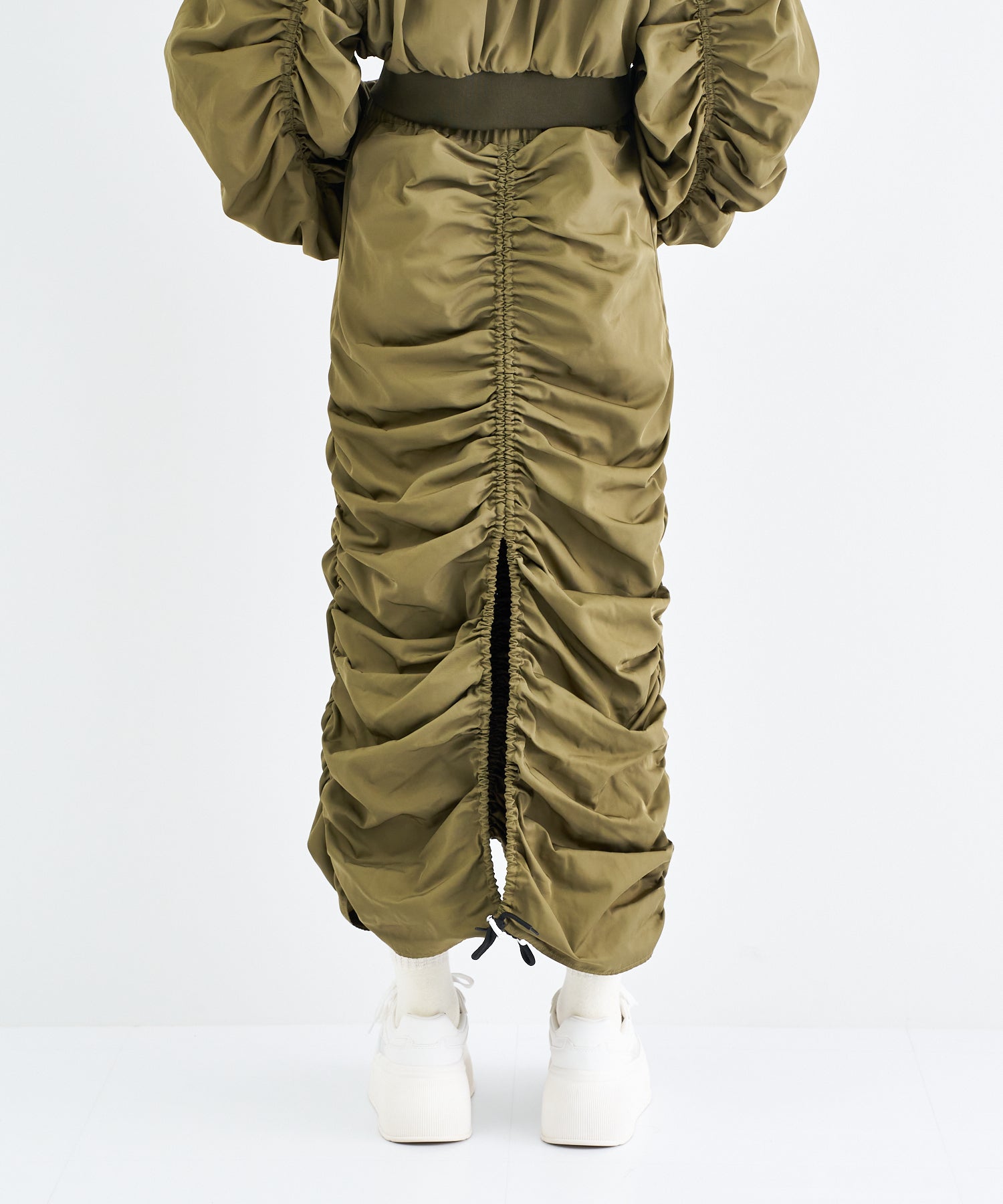ハリのある素材を、全体的にシャーリングした個性的なロングスカートです。スポーティーかつ女性らしいシルエットを兼ねそろえたスカートは、スタイリングのポイントになります。