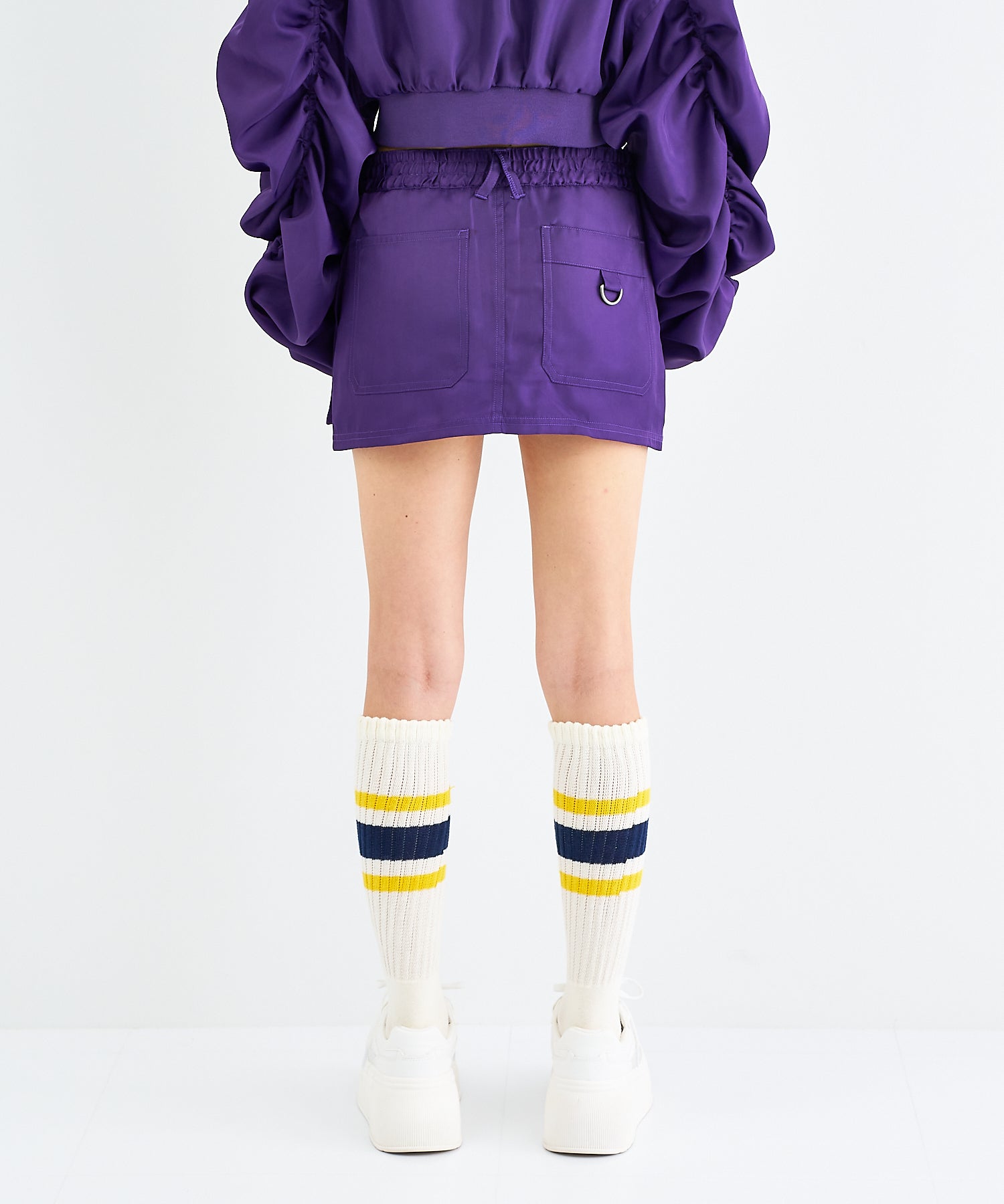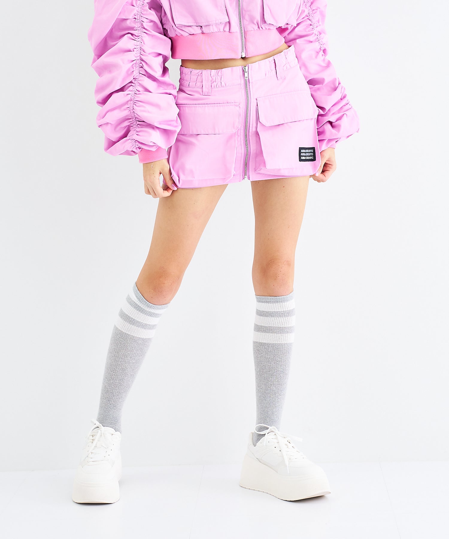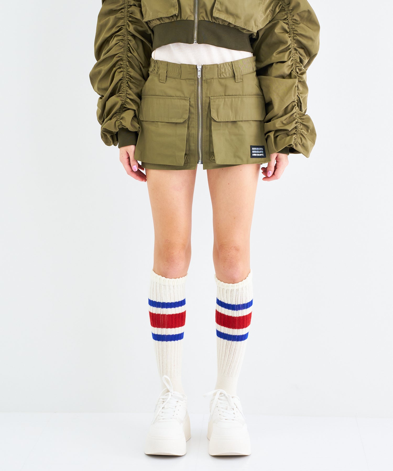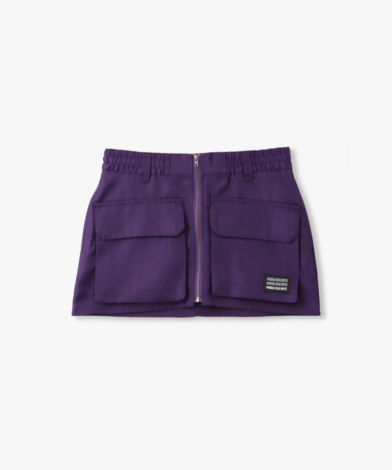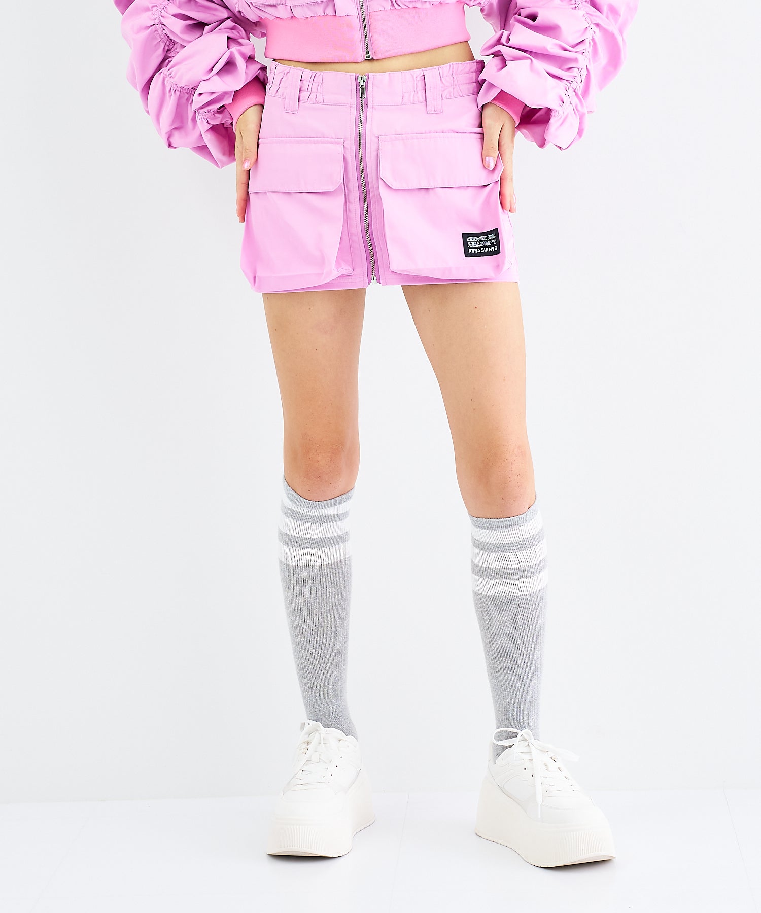 Y2Kな気分のショートスカート。前の大きなポケットがアクセントのスカートは、スニーカーやロングブーツなどと合わせると、カッコ良いですね。今年はパンツの上から重ね着もありです!