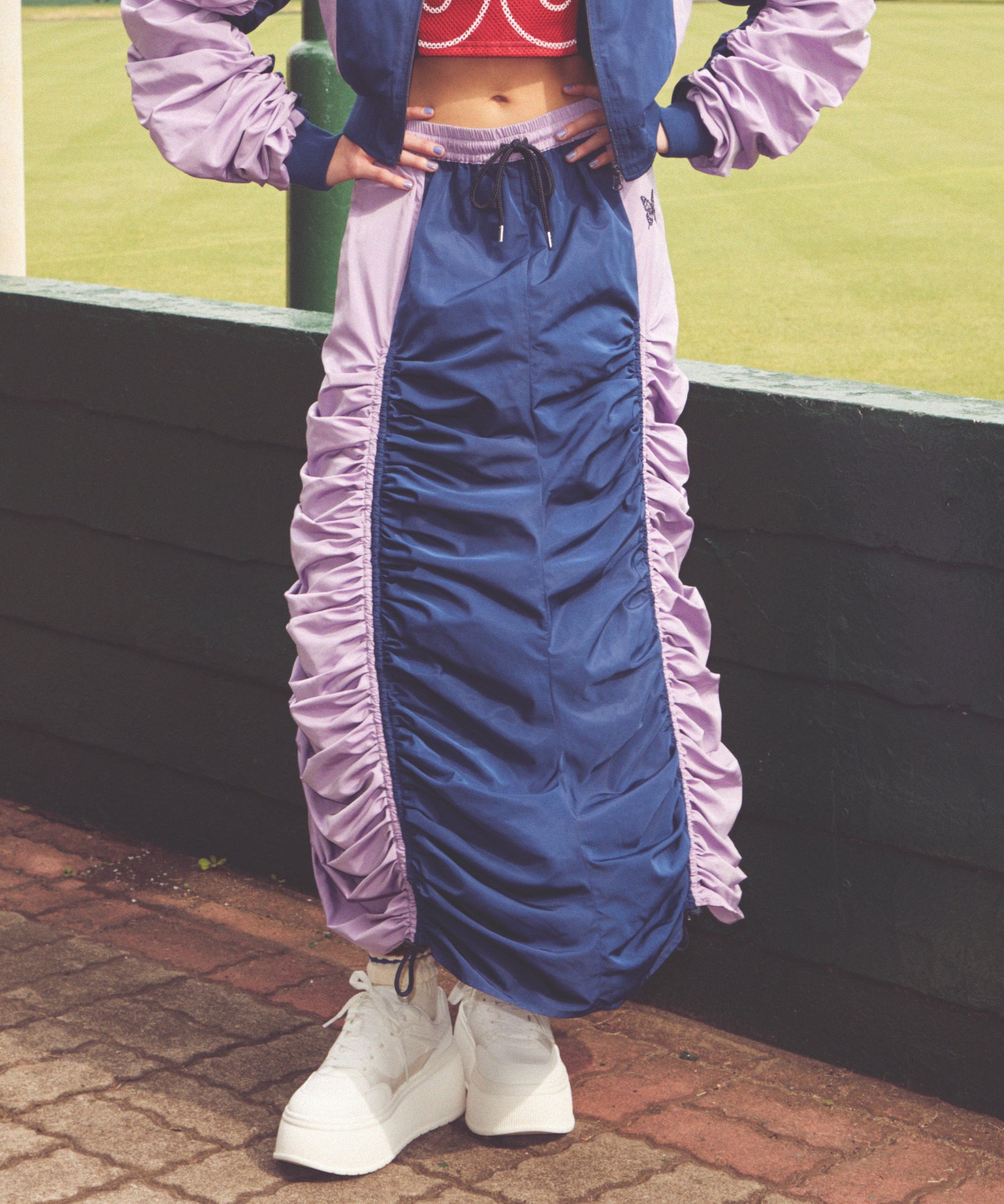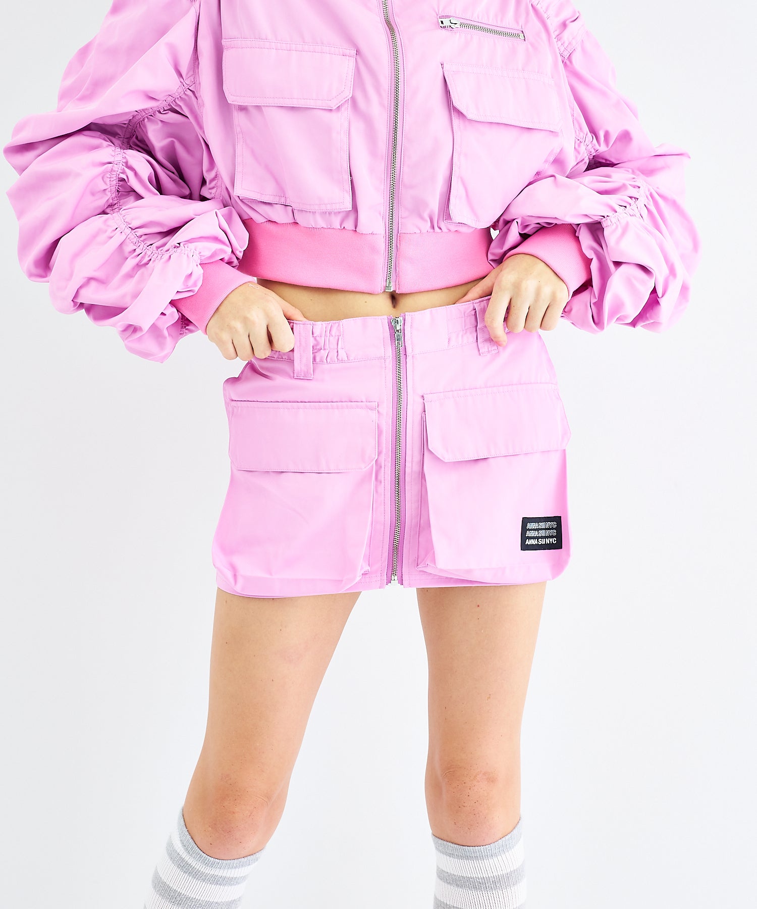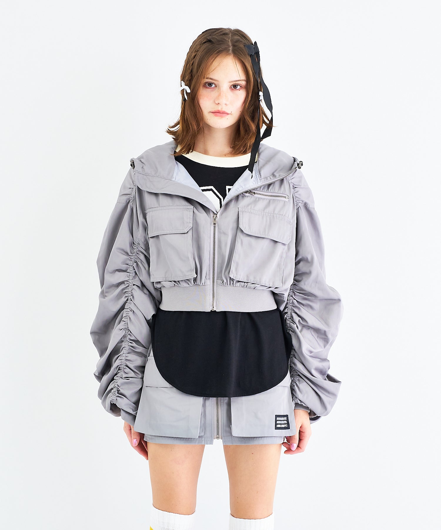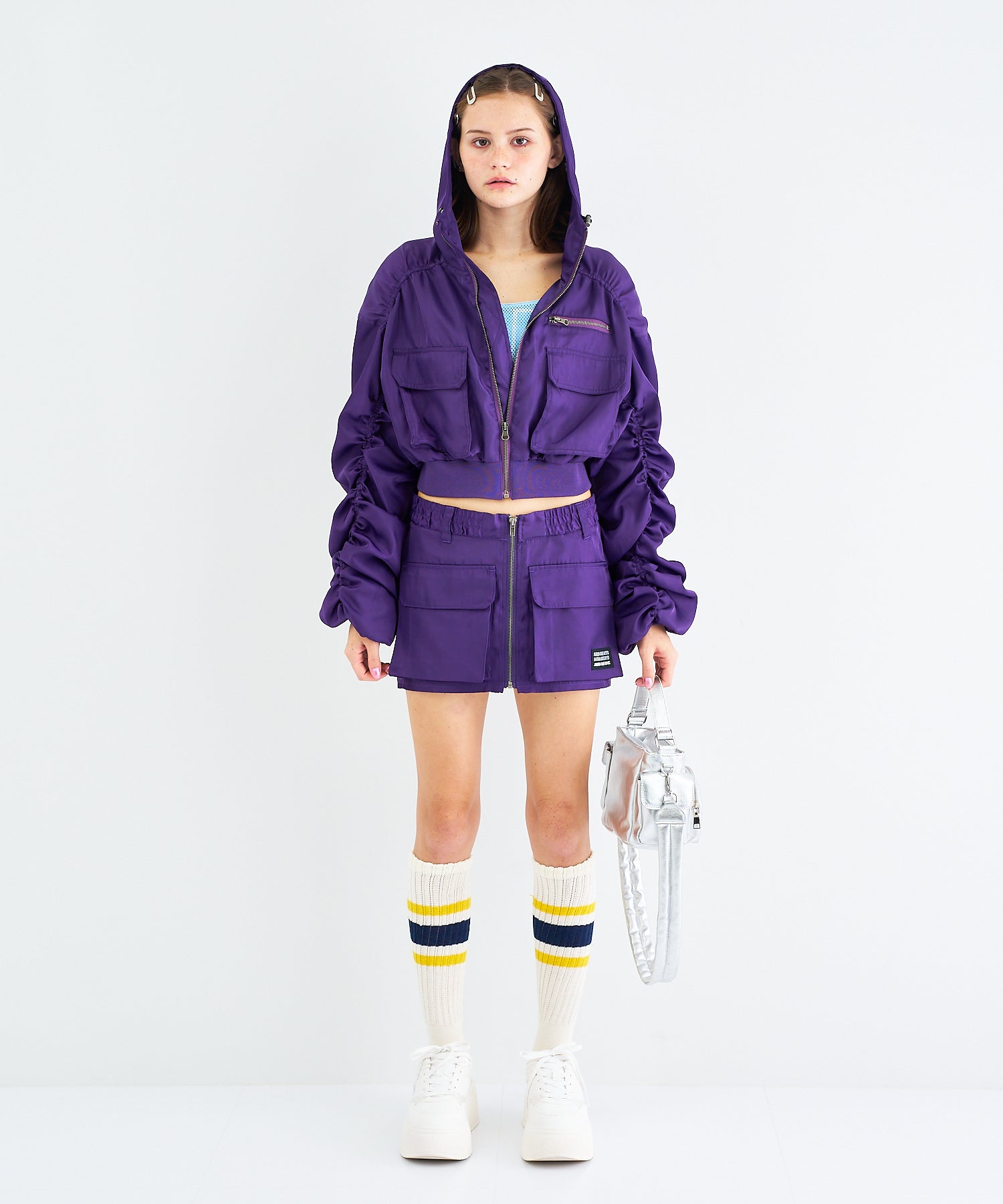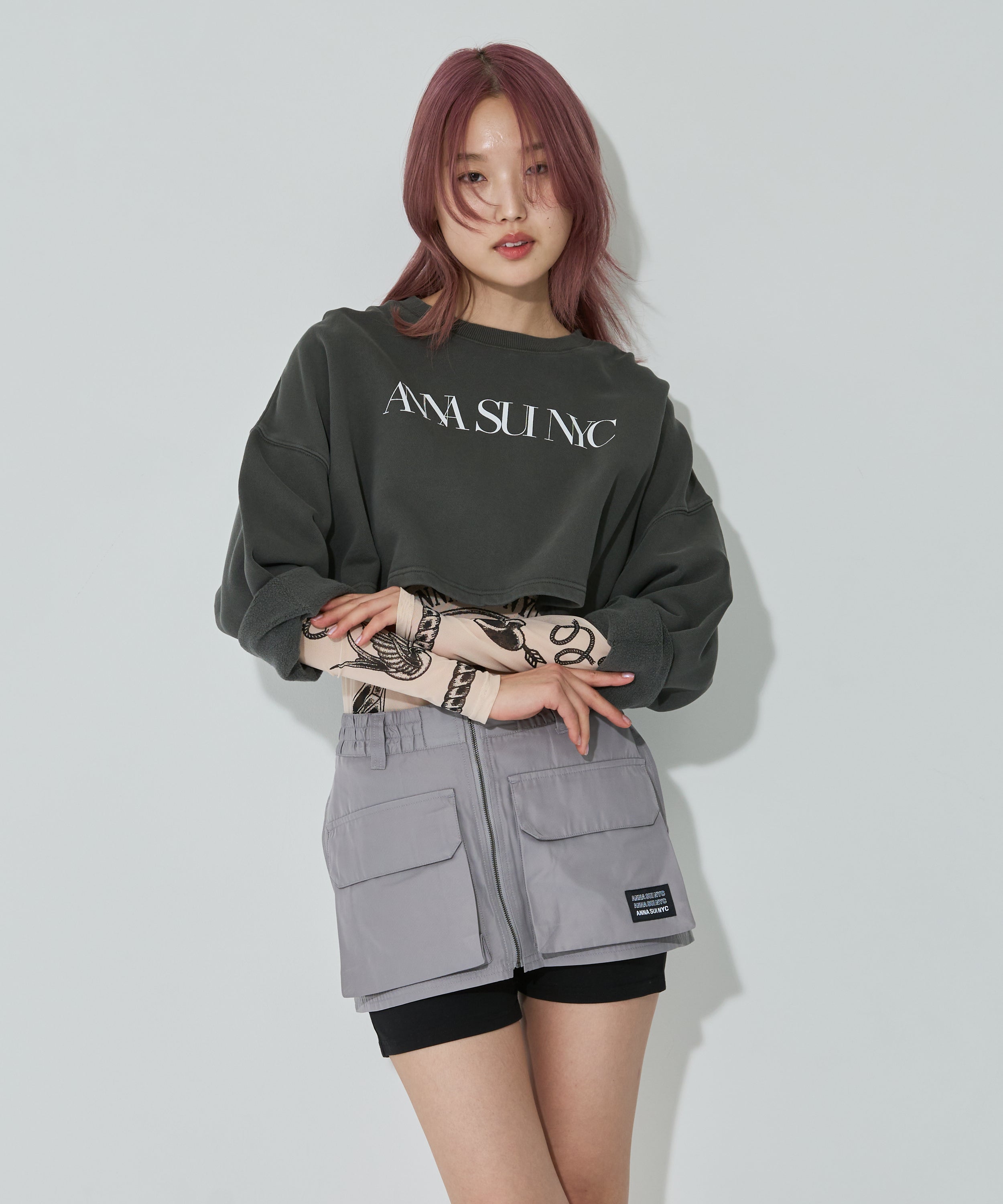 Y2Kな気分のショートスカート。前の大きなポケットがアクセントのスカートは、スニーカーやロングブーツなどと合わせると、カッコ良いですね。今年はパンツの上から重ね着もありです!