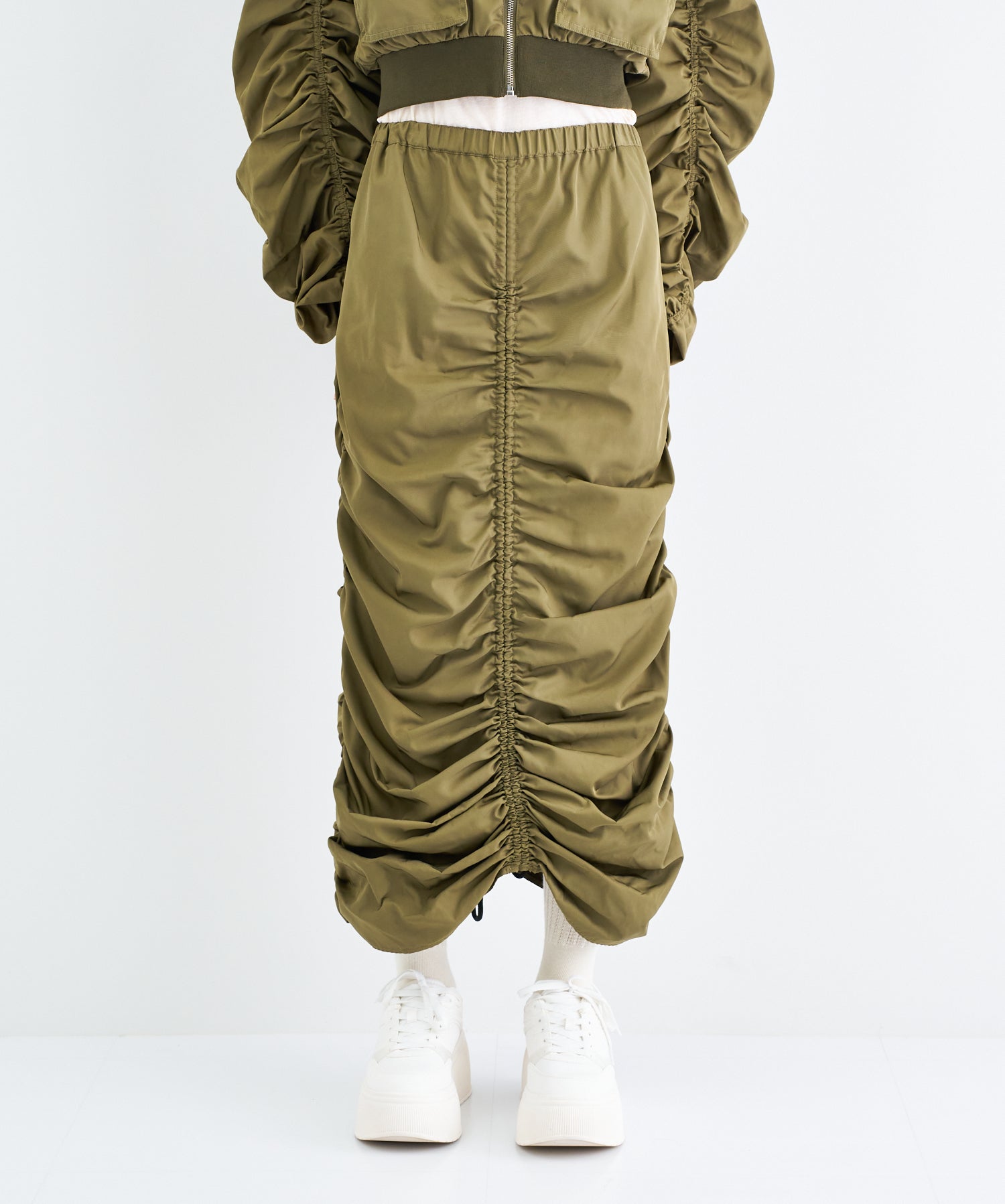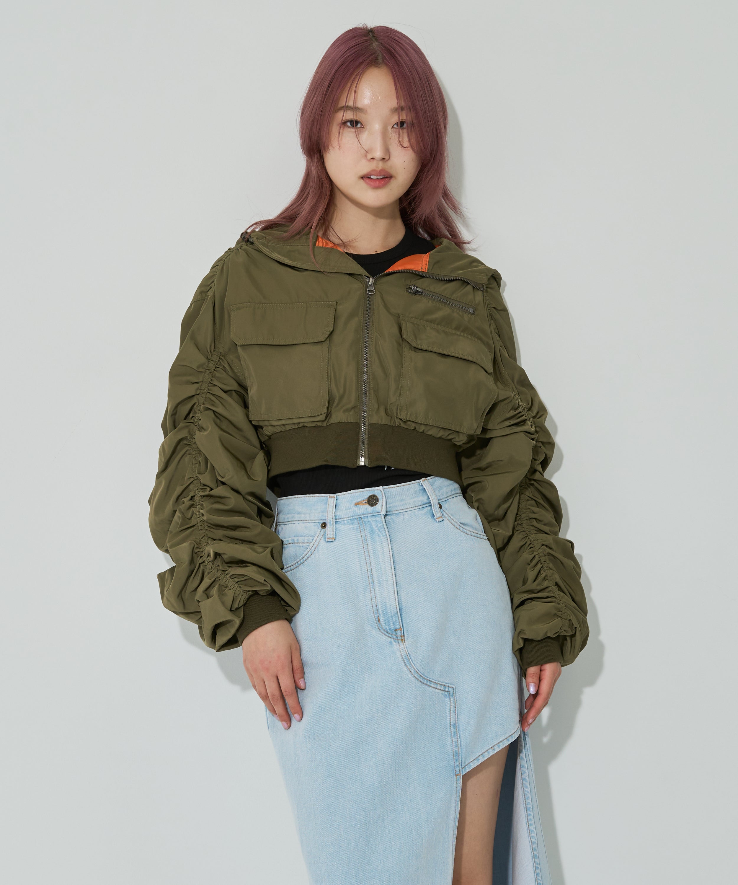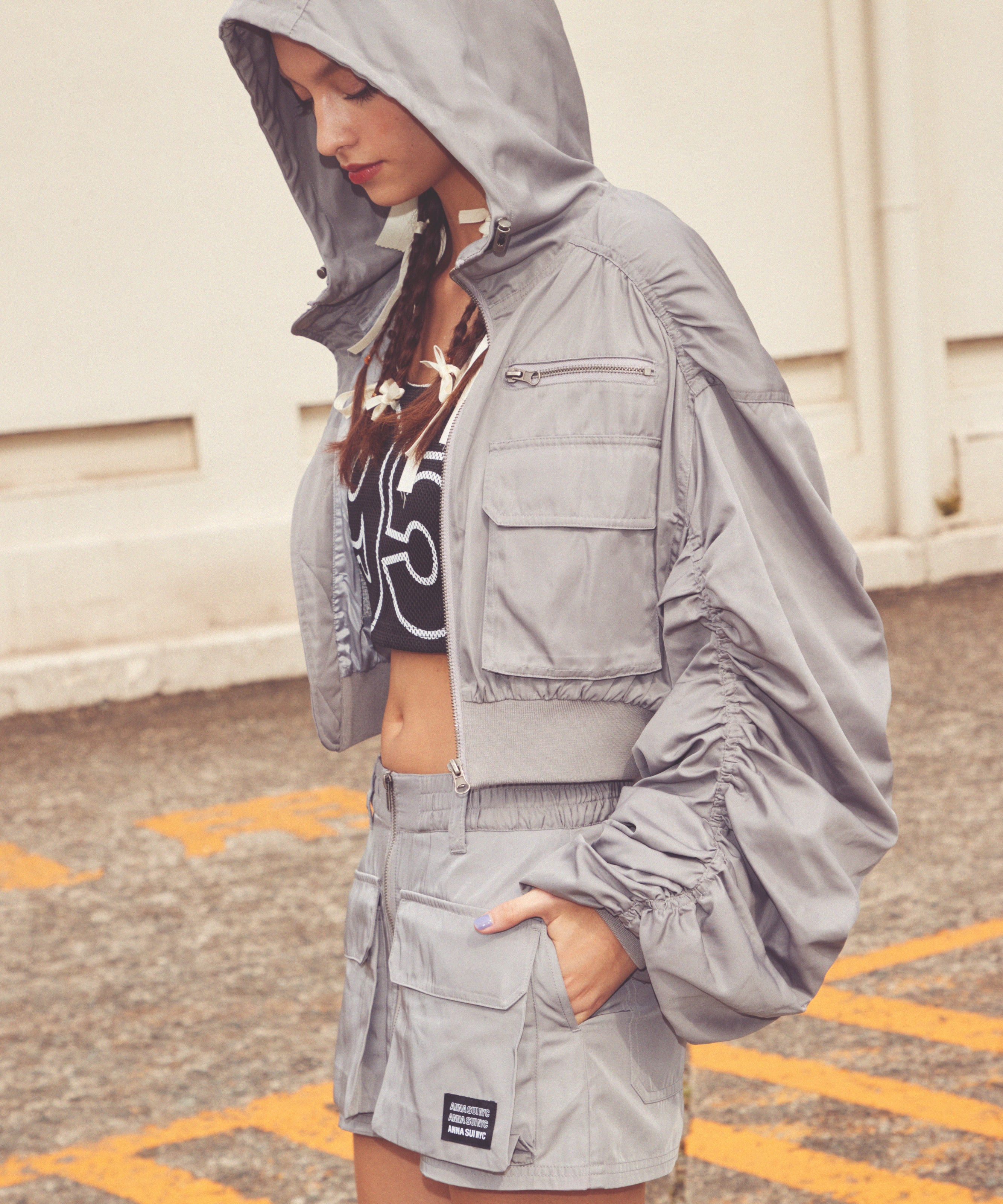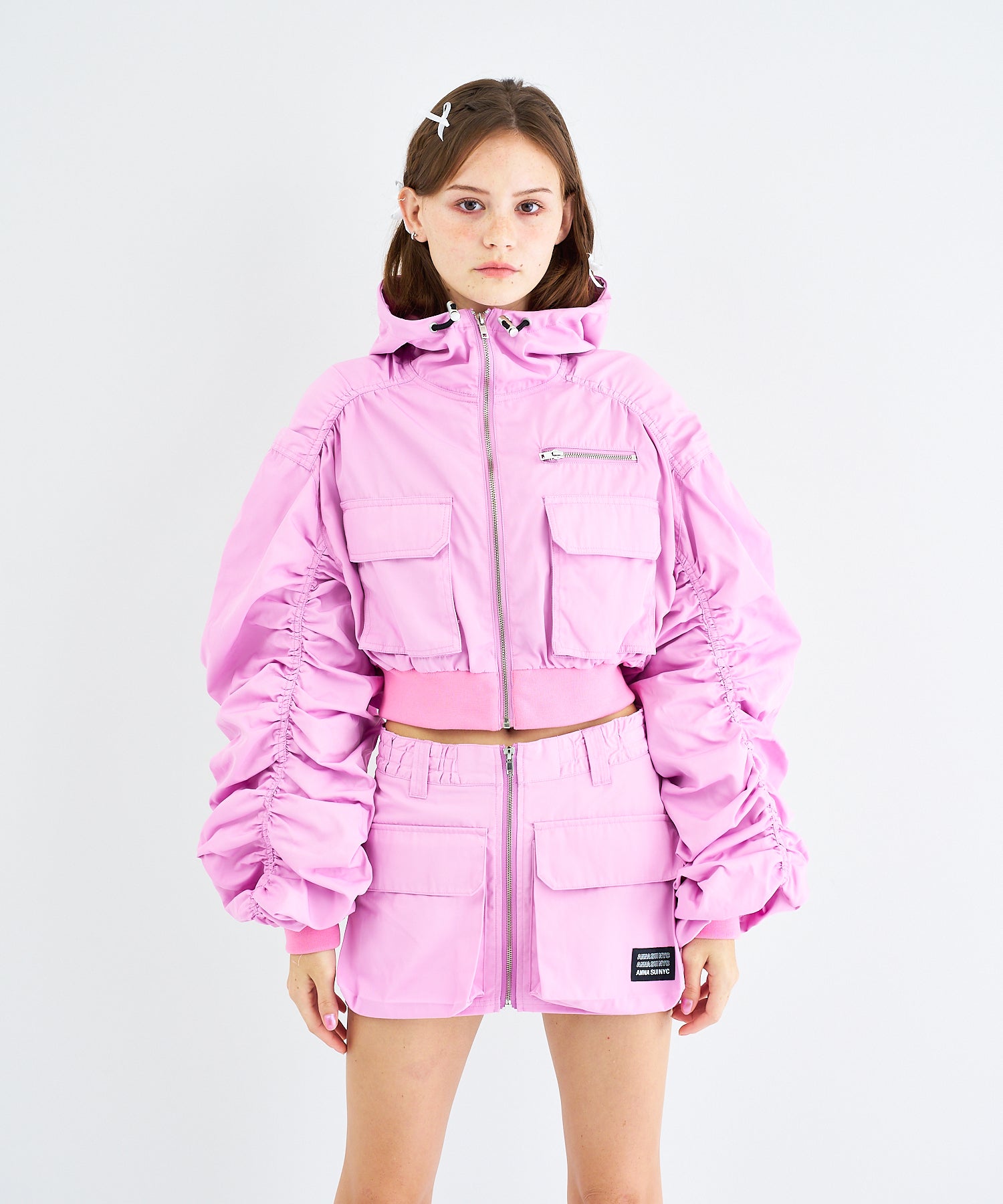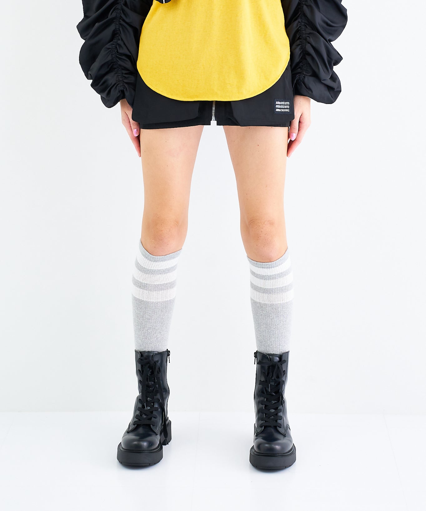 Y2Kな気分のショートスカート。前の大きなポケットがアクセントのスカートは、スニーカーやロングブーツなどと合わせると、カッコ良いですね。今年はパンツの上から重ね着もありです!