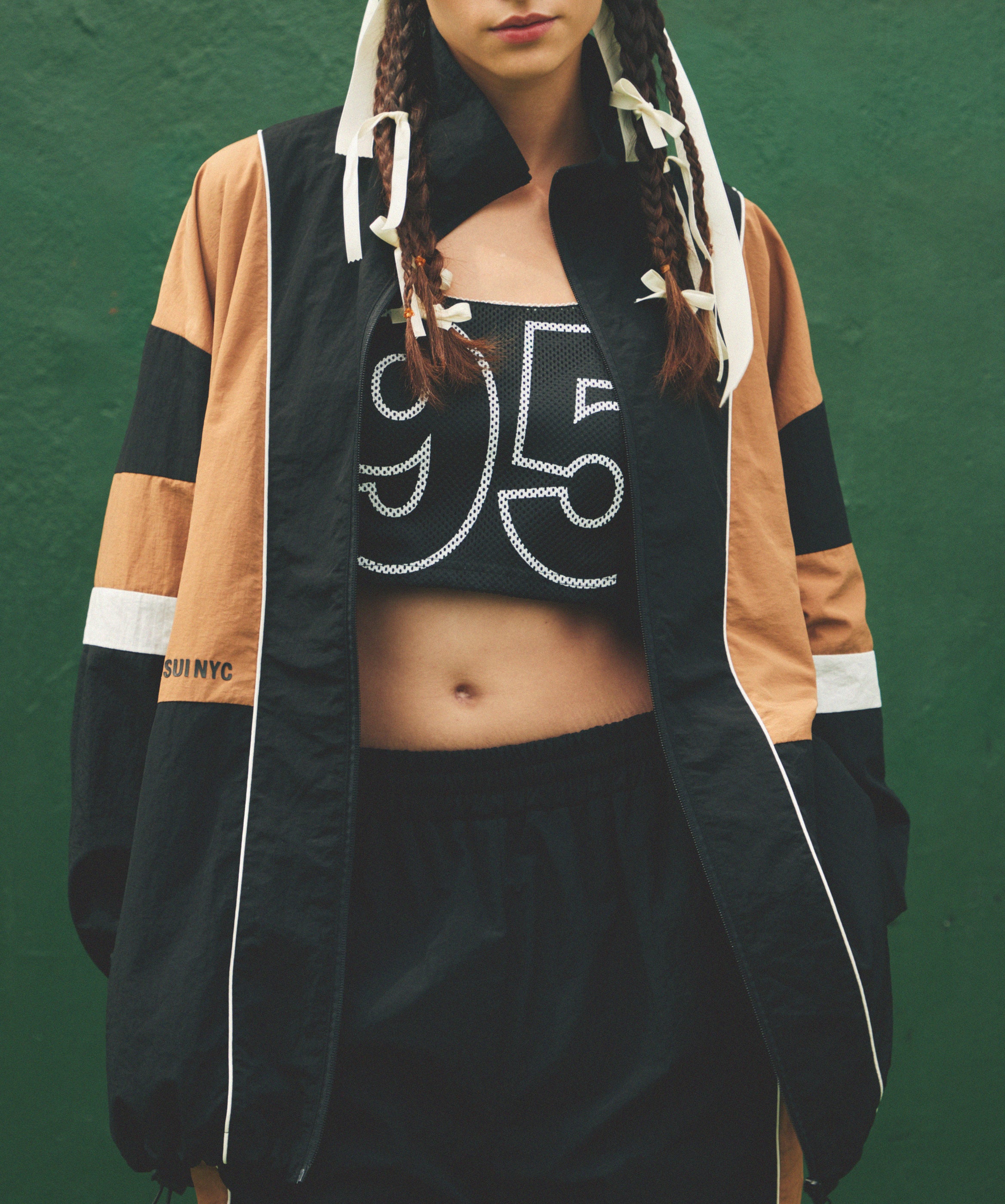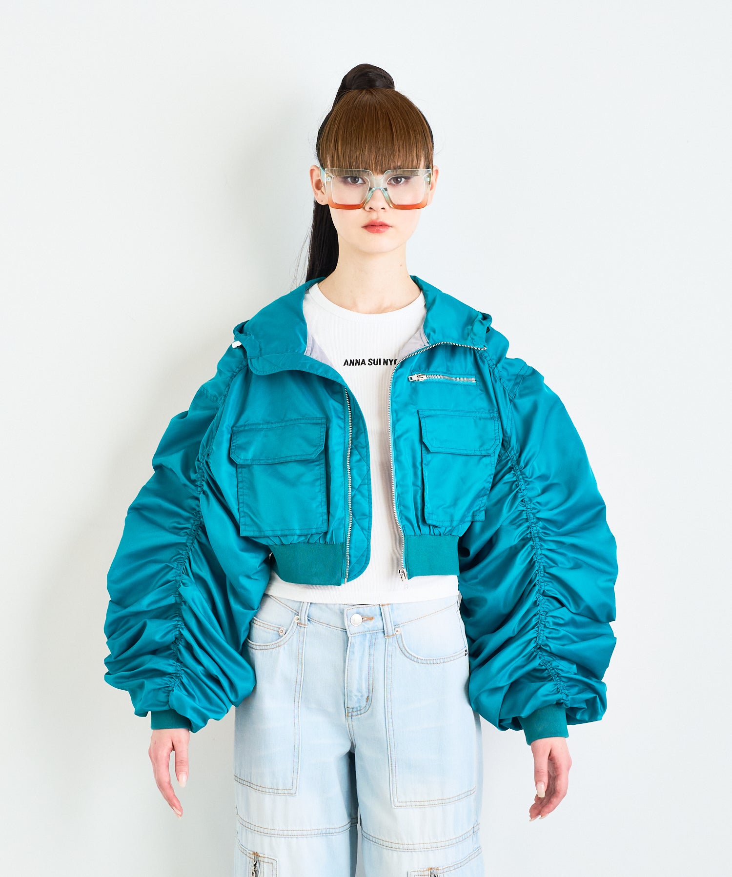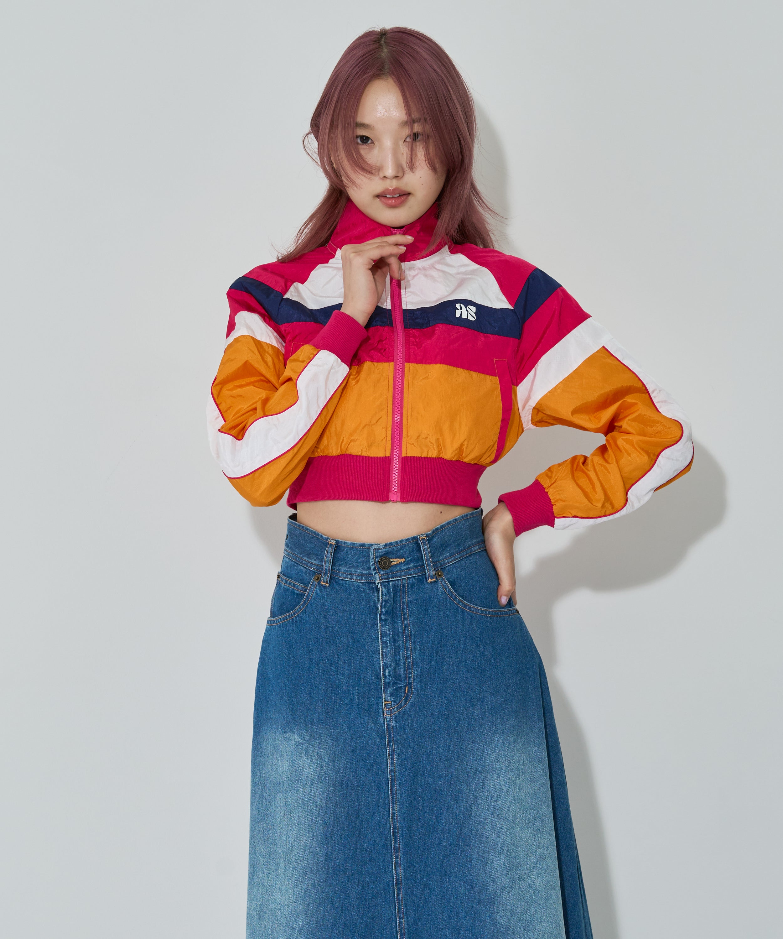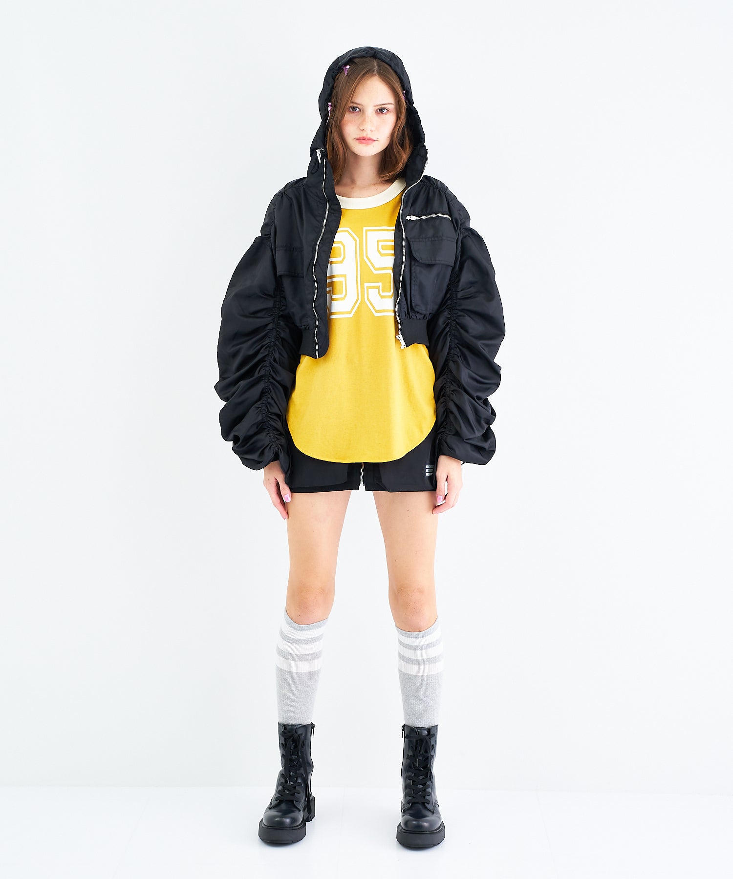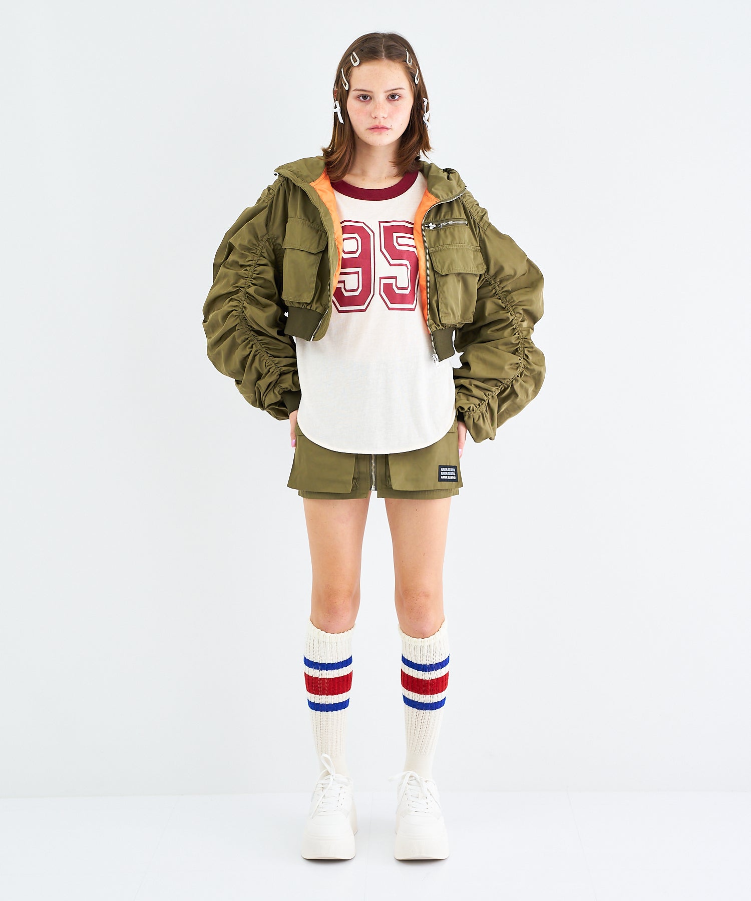Y2Kな気分のショートスカート。前の大きなポケットがアクセントのスカートは、スニーカーやロングブーツなどと合わせると、カッコ良いですね。今年はパンツの上から重ね着もありです!