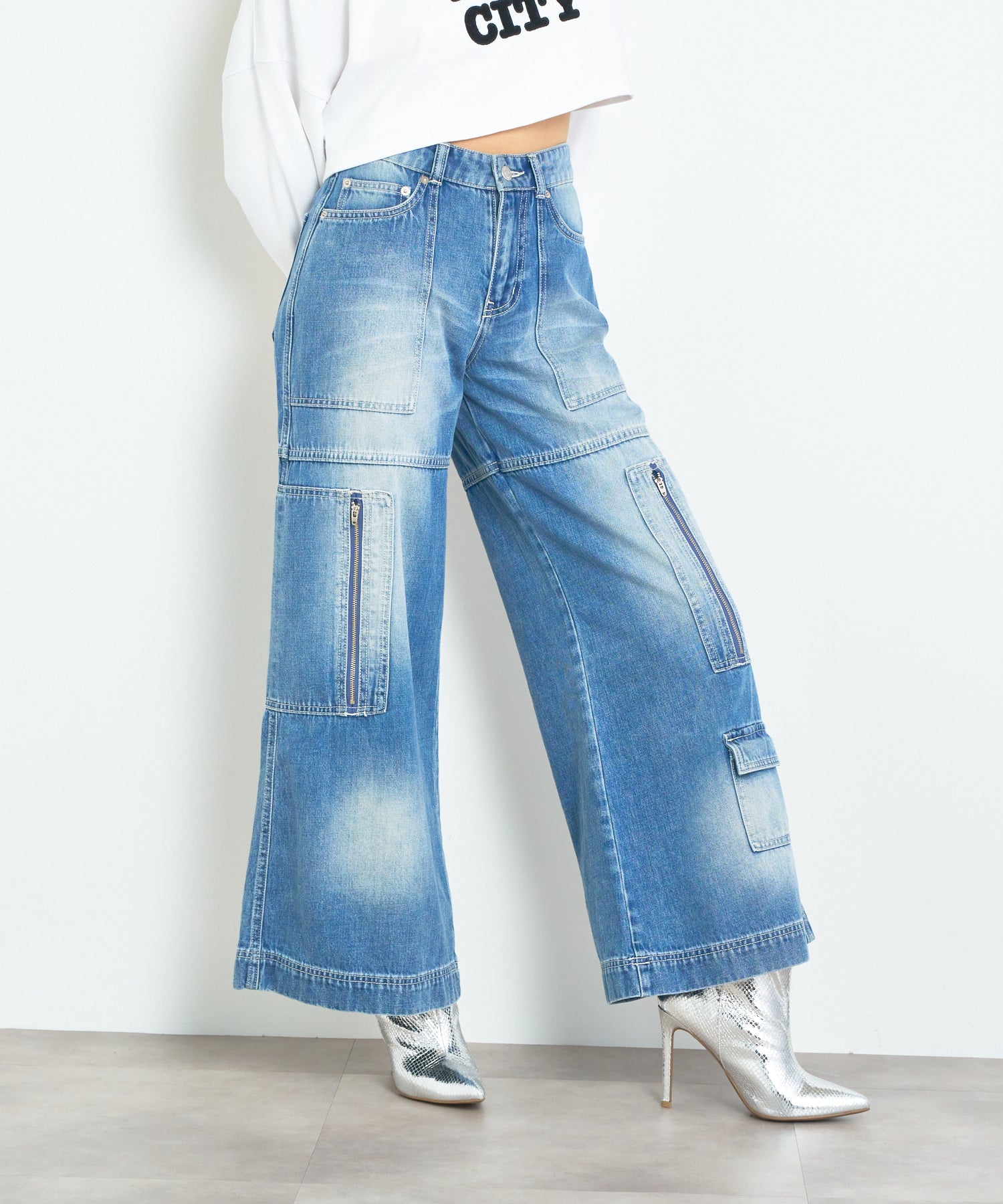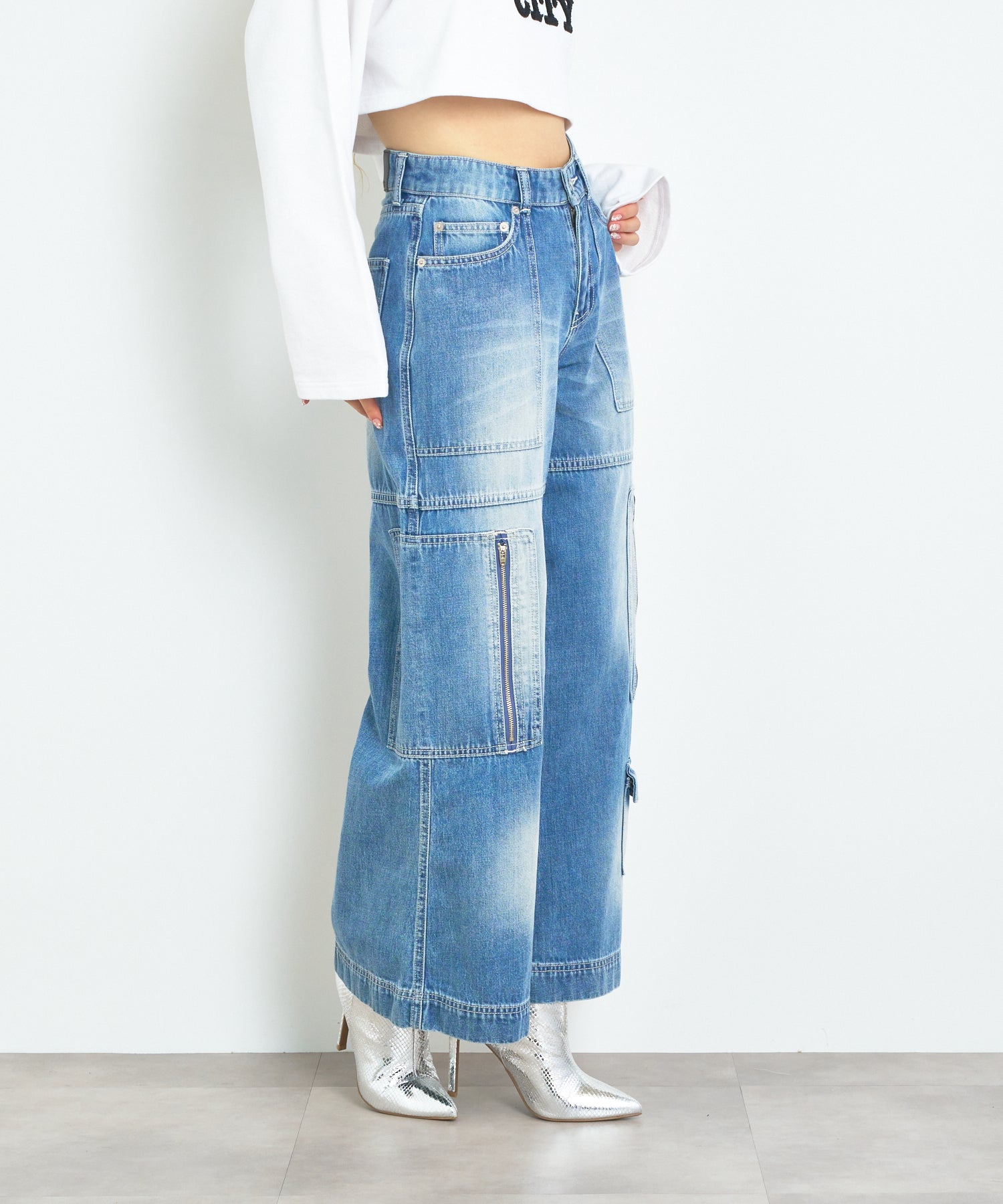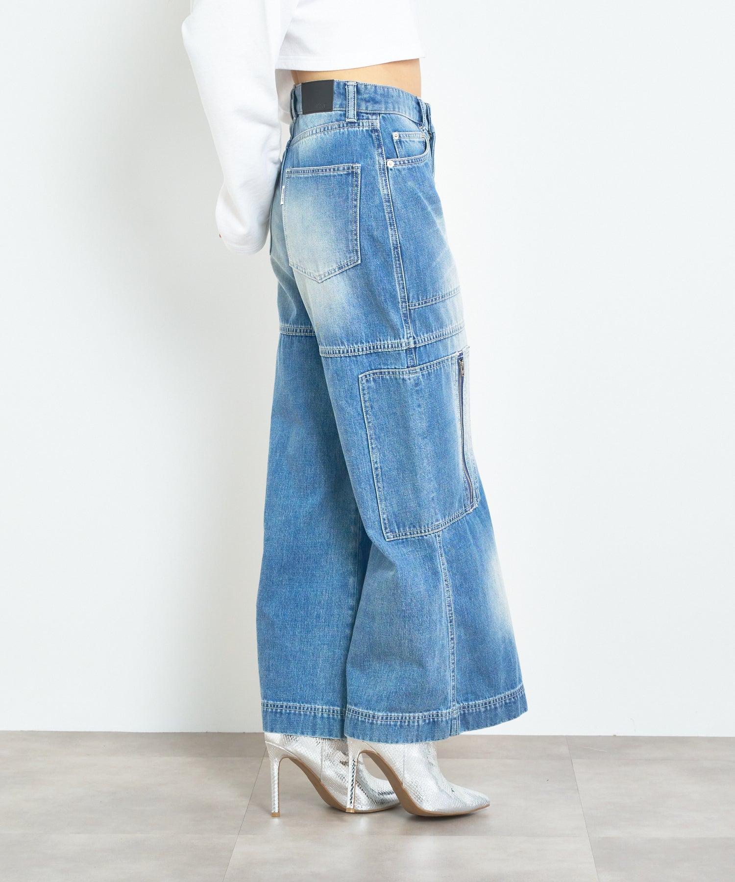大きく配置された5つのポケットがポイントのZIPワイドデニムパンツ。ユーズド感のある擦れて色が落ちた雰囲気を作るシェービング加工がクールな印象に。広がりながらズドンと落ちるバギーのシルエットは一枚持っておきたいヘビロテ確定のアイテムです!
