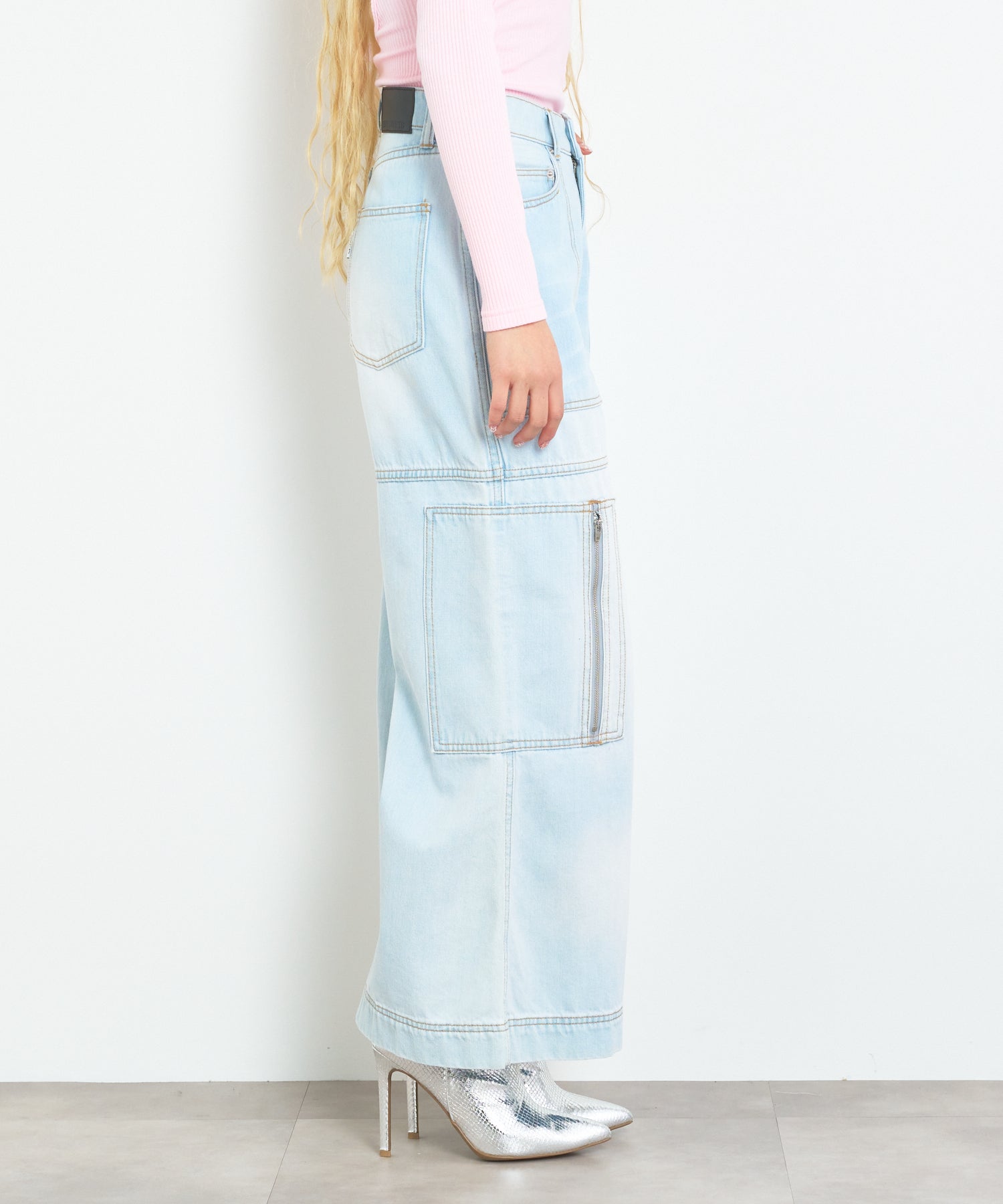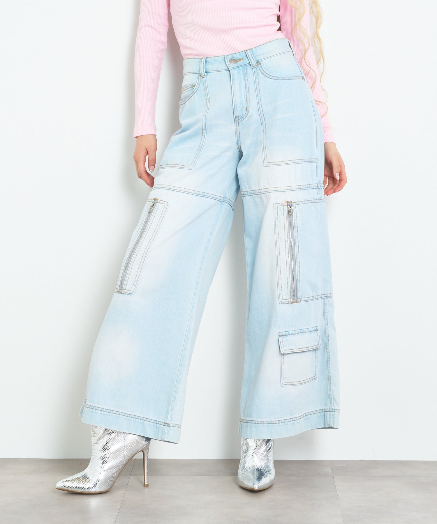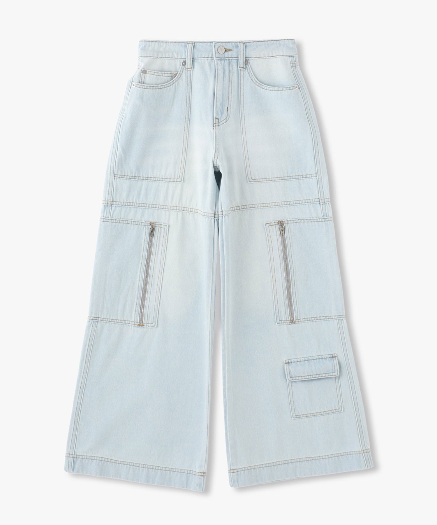 大きく配置された5つのポケットがポイントのZIPワイドデニムパンツ。ユーズド感のある擦れて色が落ちた雰囲気を作るシェービング加工がクールな印象に。広がりながらズドンと落ちるバギーのシルエットは一枚持っておきたいヘビロテ確定のアイテムです!