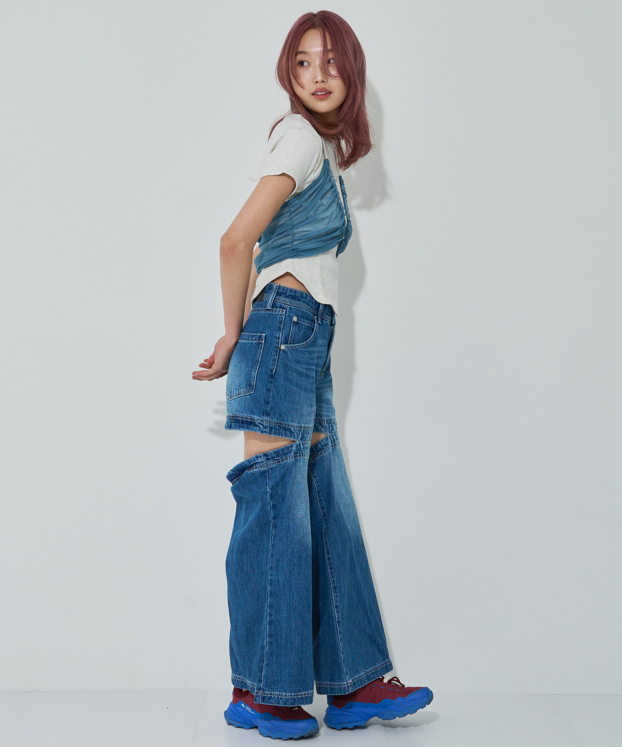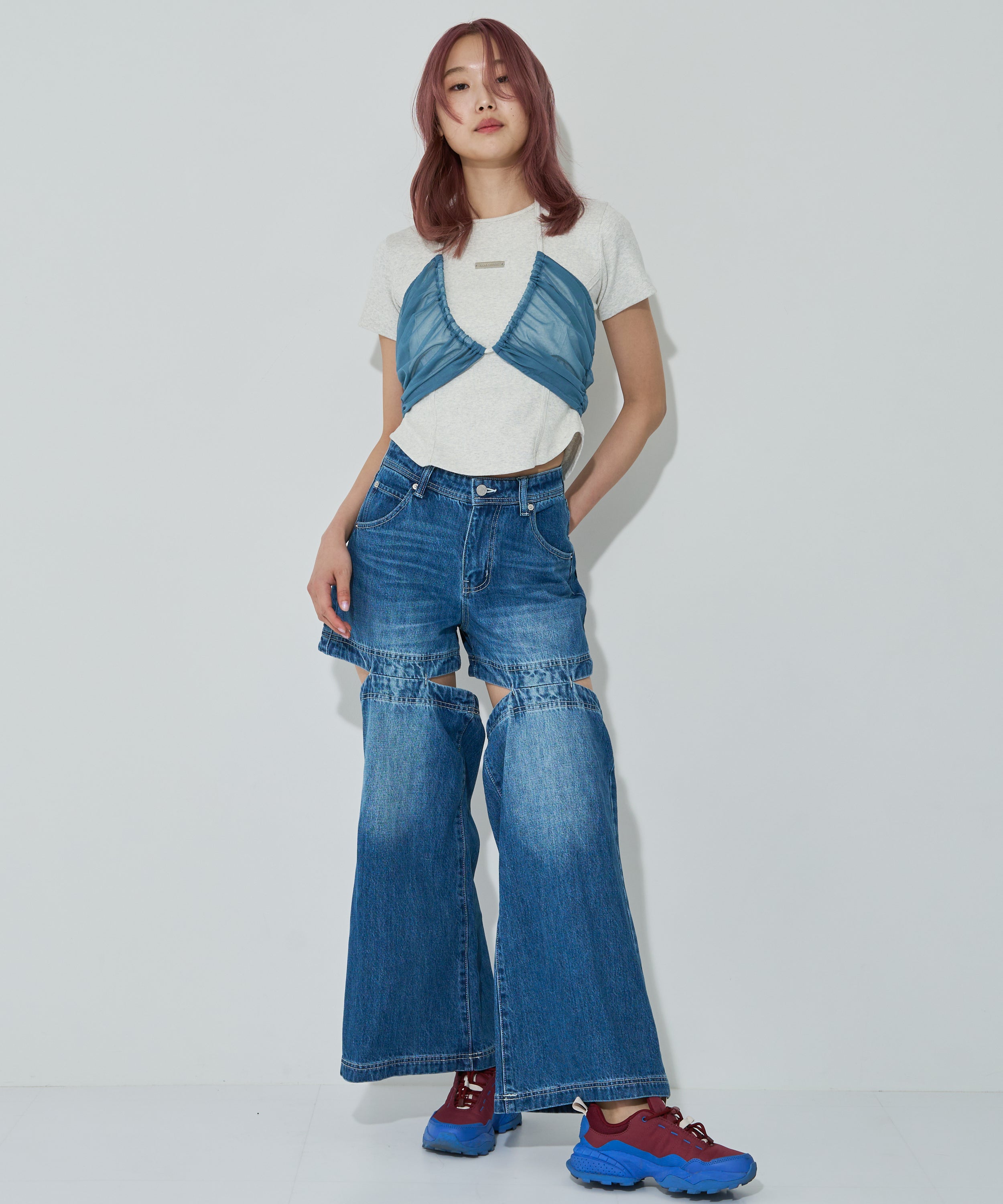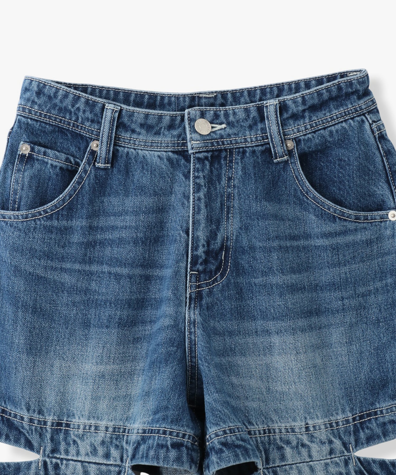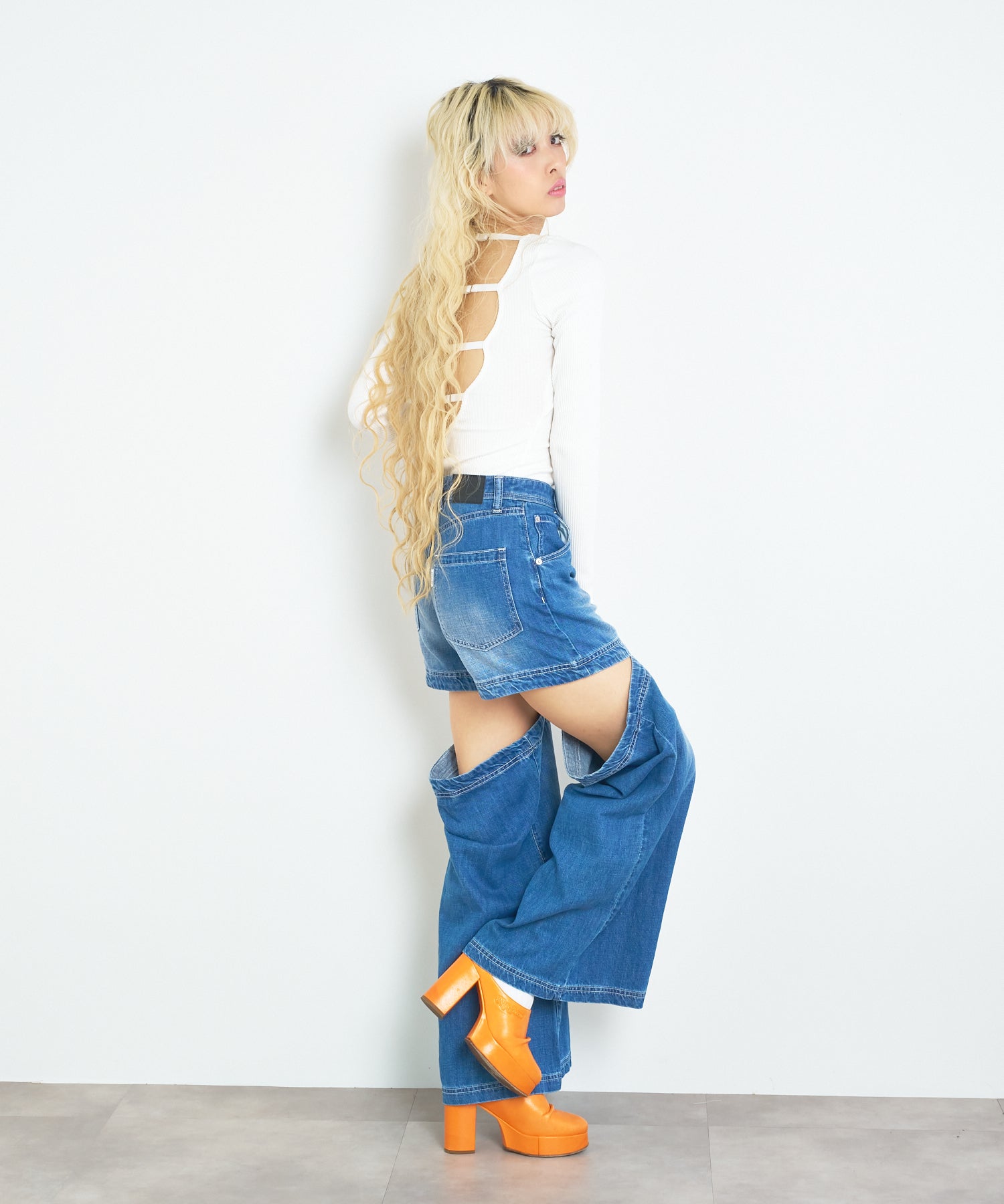肌見せが目を引くカットアウトデザインデニム。落ち感がきれいに見えるようこだわった程よい厚みのデニムがこなれ感を演出してくれます。シンプルにTシャツと合わせたり、レースタイツとあわせてガーリーに着こなしたりとどんなスタイルにも馴染むアイテムです◎