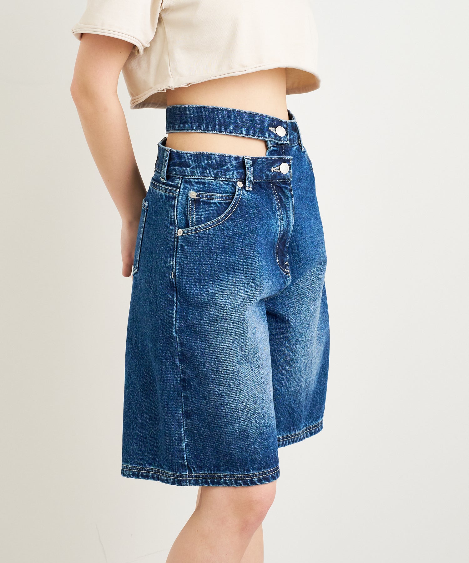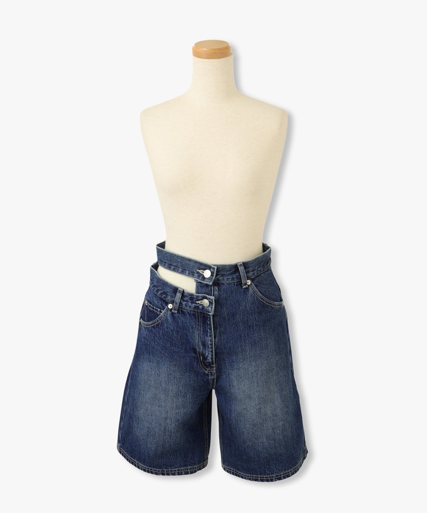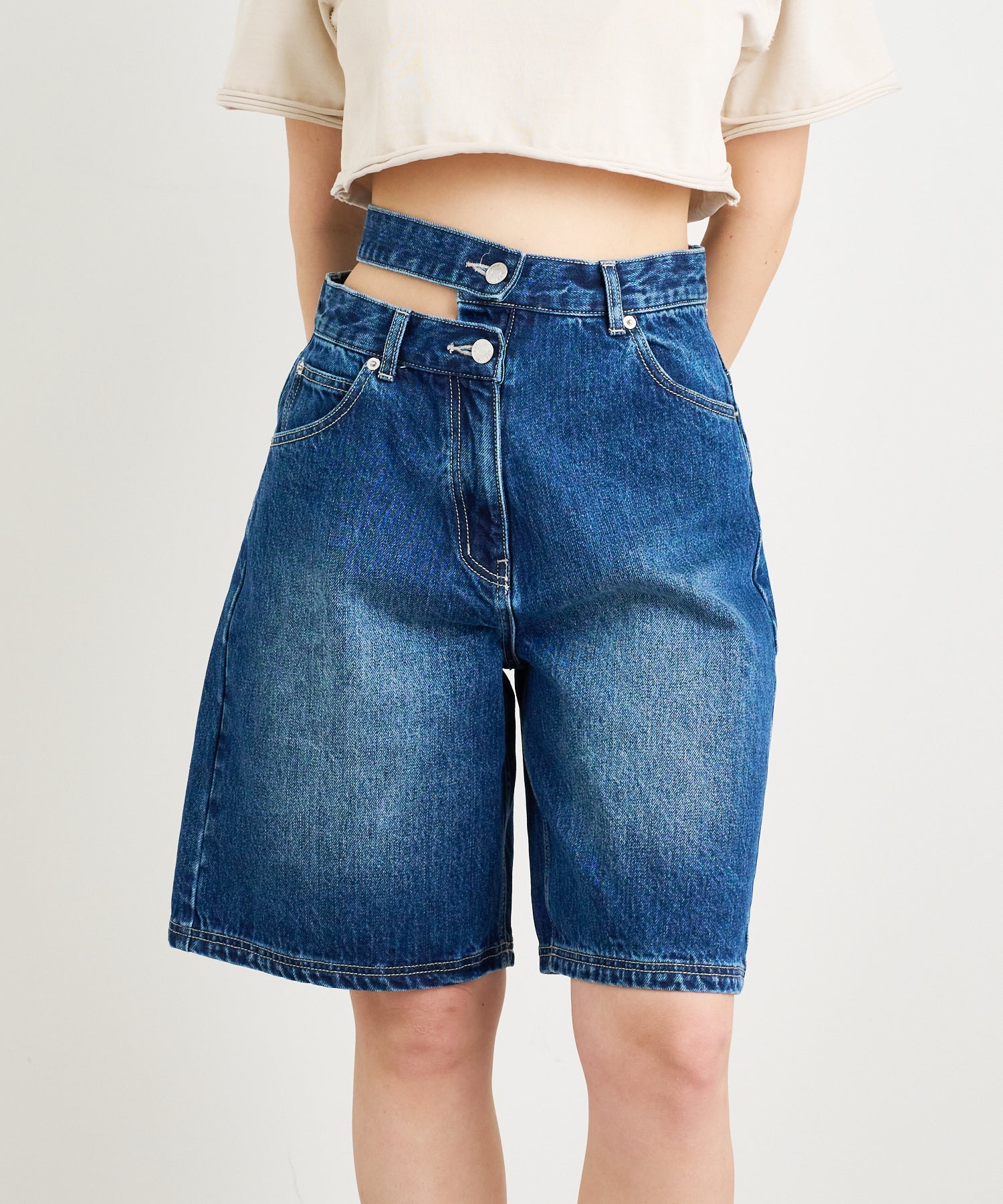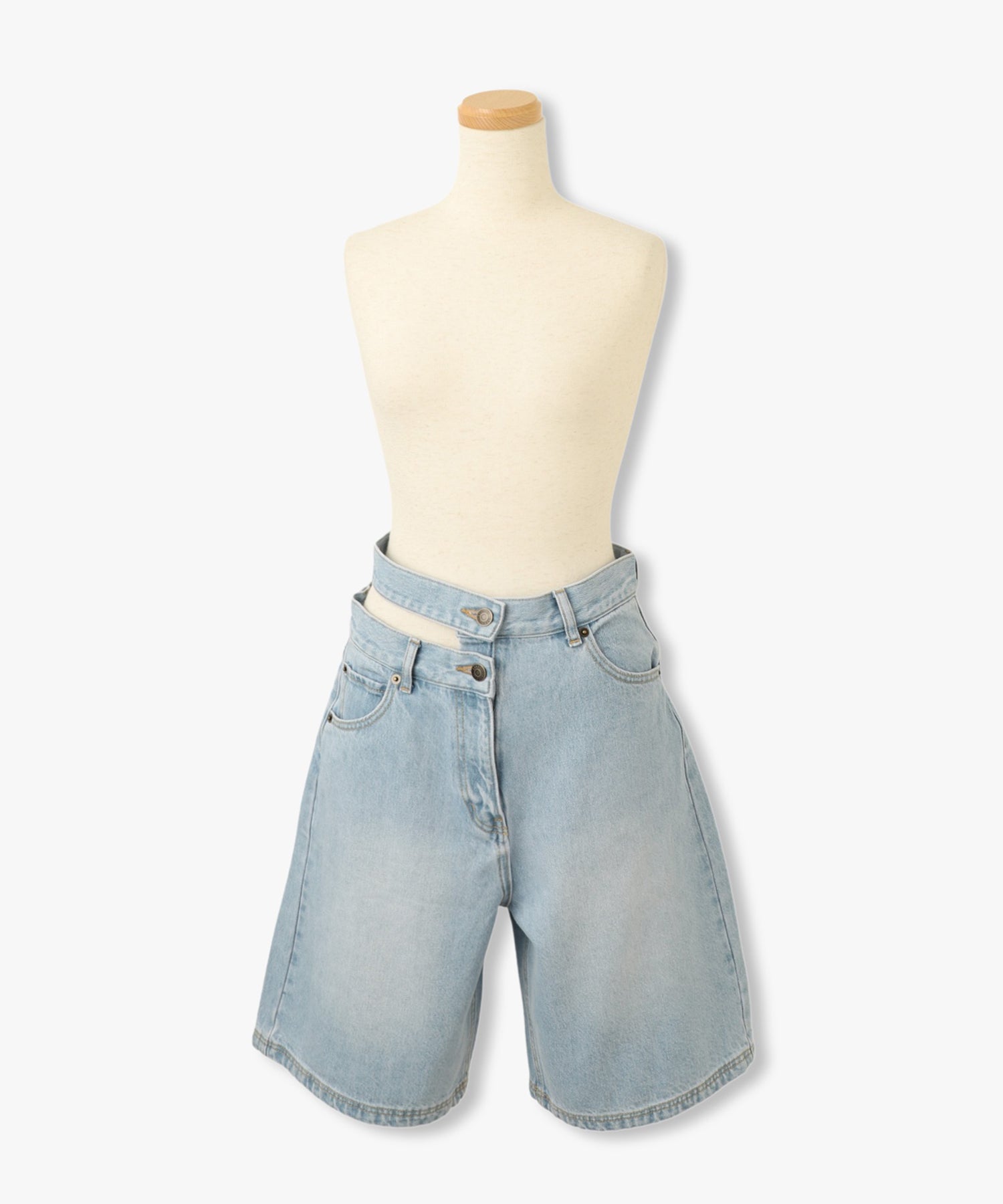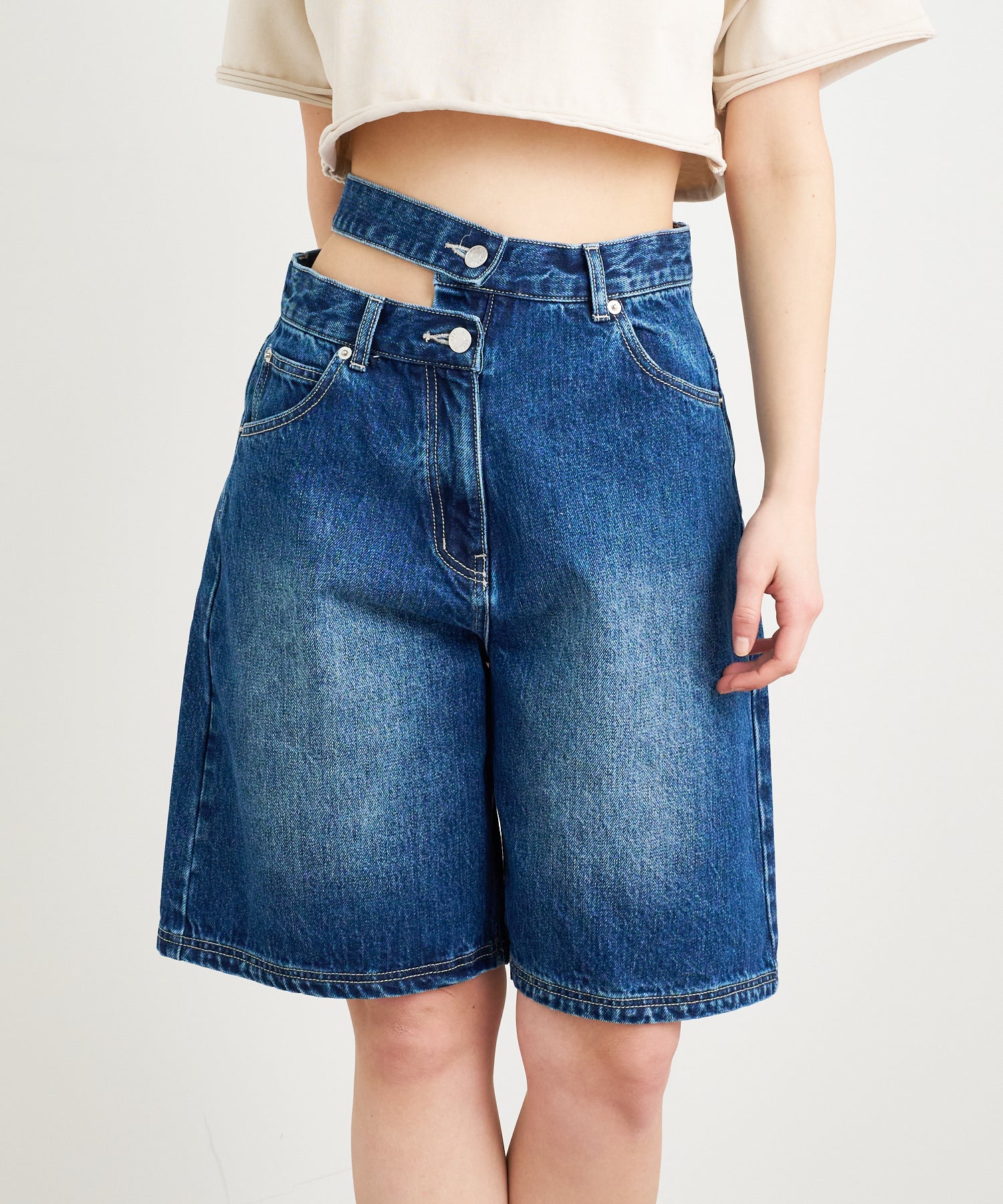 ゆったりとしたワイド巾のデニムハーフパンツ。ウエストが2段になっており、アシンメトリーなデザインがモード感溢れるデザインに!ベルトとベルトの間からチラリと見える腰元がセクシーさを表現してくれます。トップスをインしてベルトの隙間から見える服が遊び心あるスタイリングに!