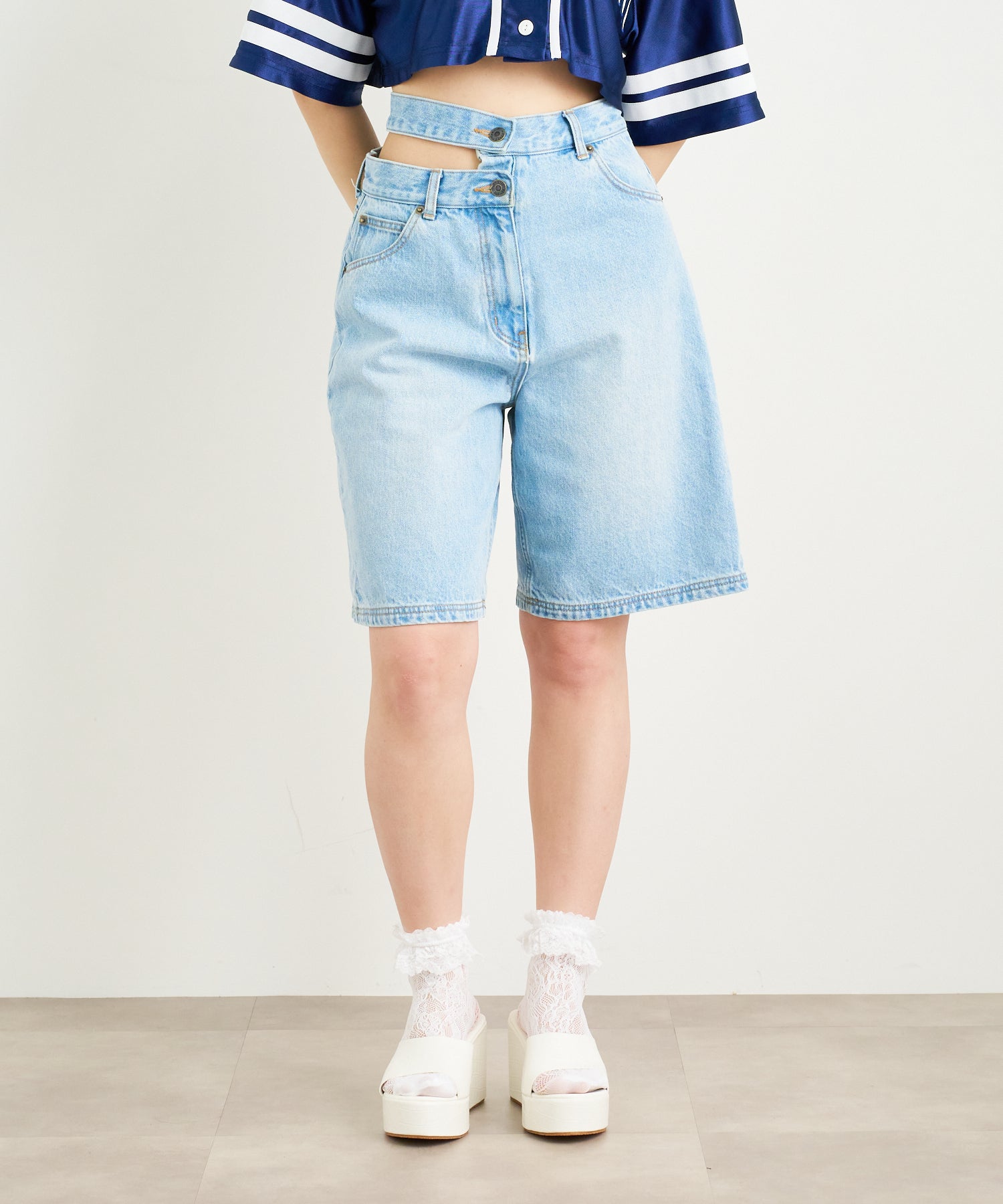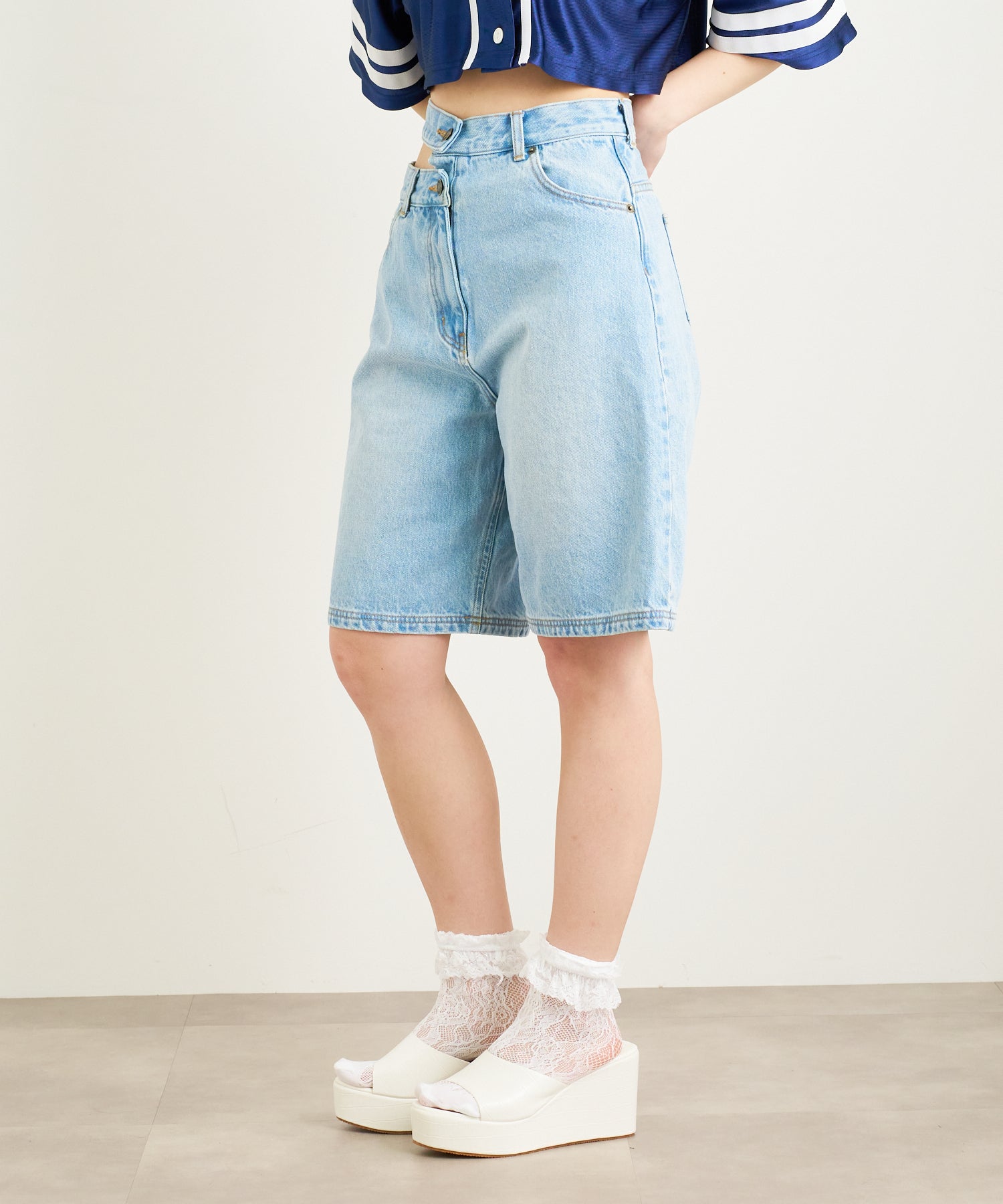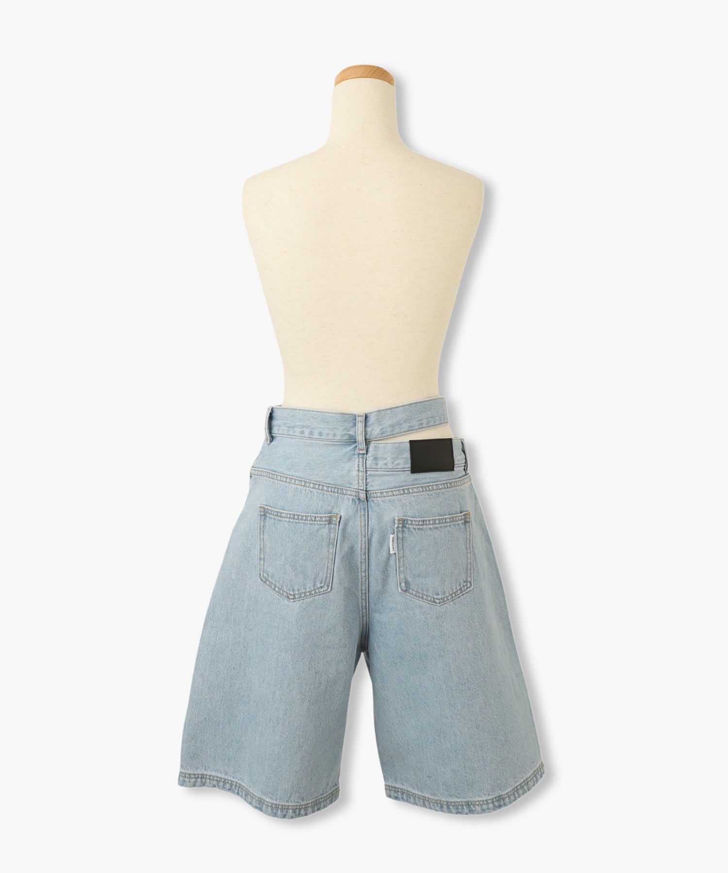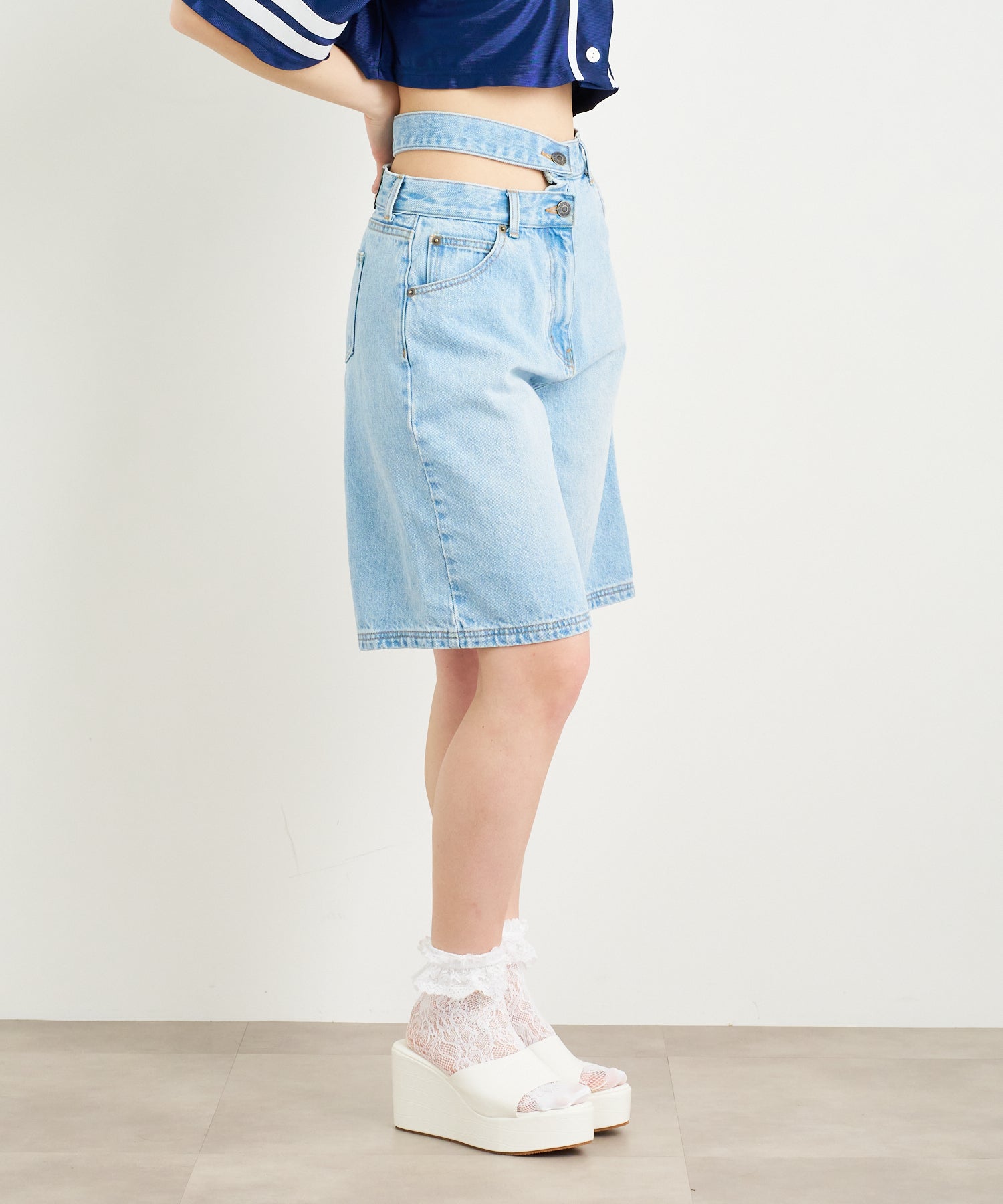 ゆったりとしたワイド巾のデニムハーフパンツ。ウエストが2段になっており、アシンメトリーなデザインがモード感溢れるデザインに!ベルトとベルトの間からチラリと見える腰元がセクシーさを表現してくれます。トップスをインしてベルトの隙間から見える服が遊び心あるスタイリングに!