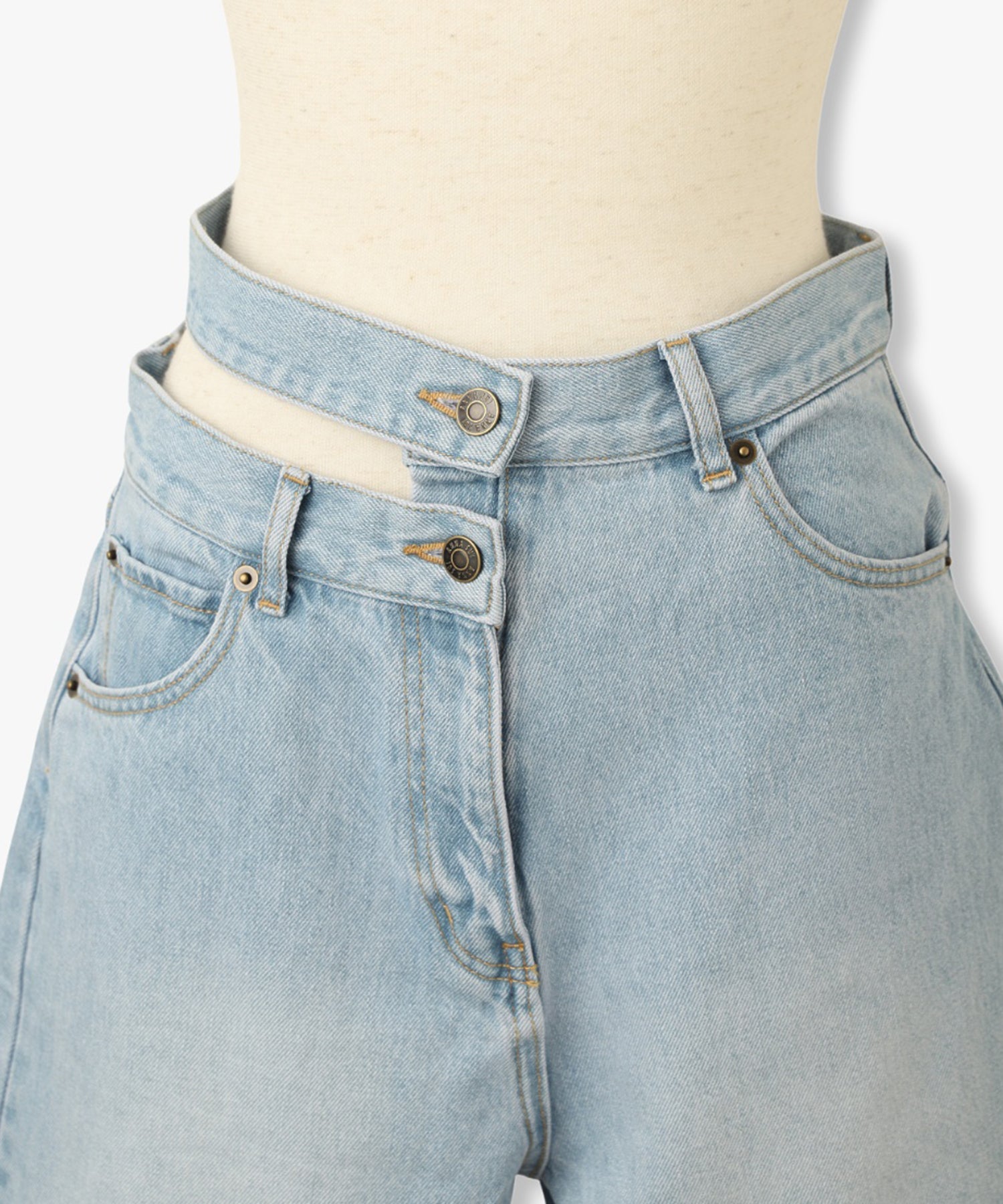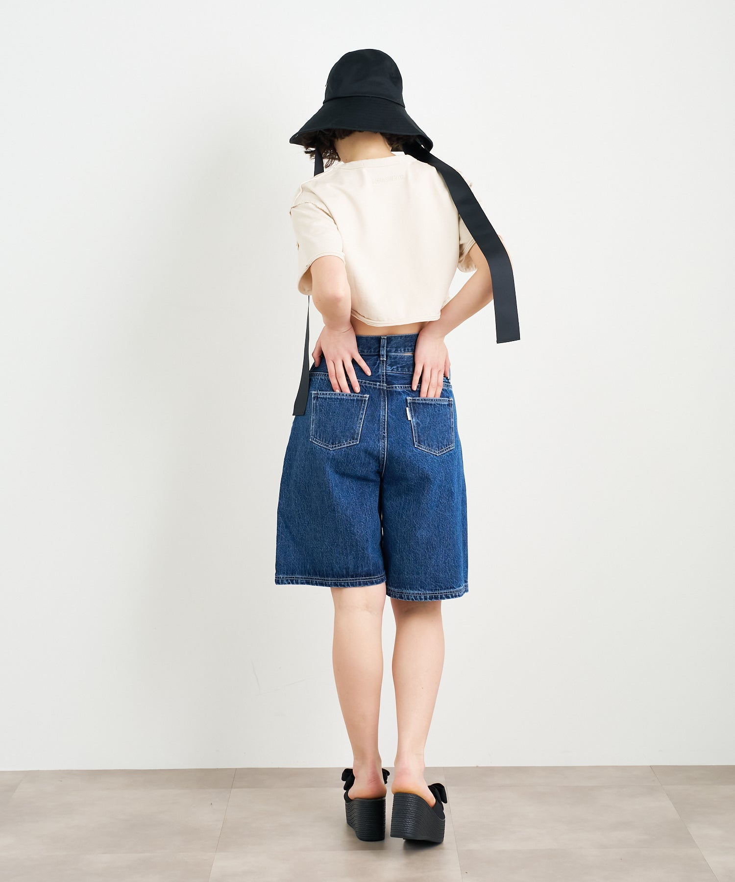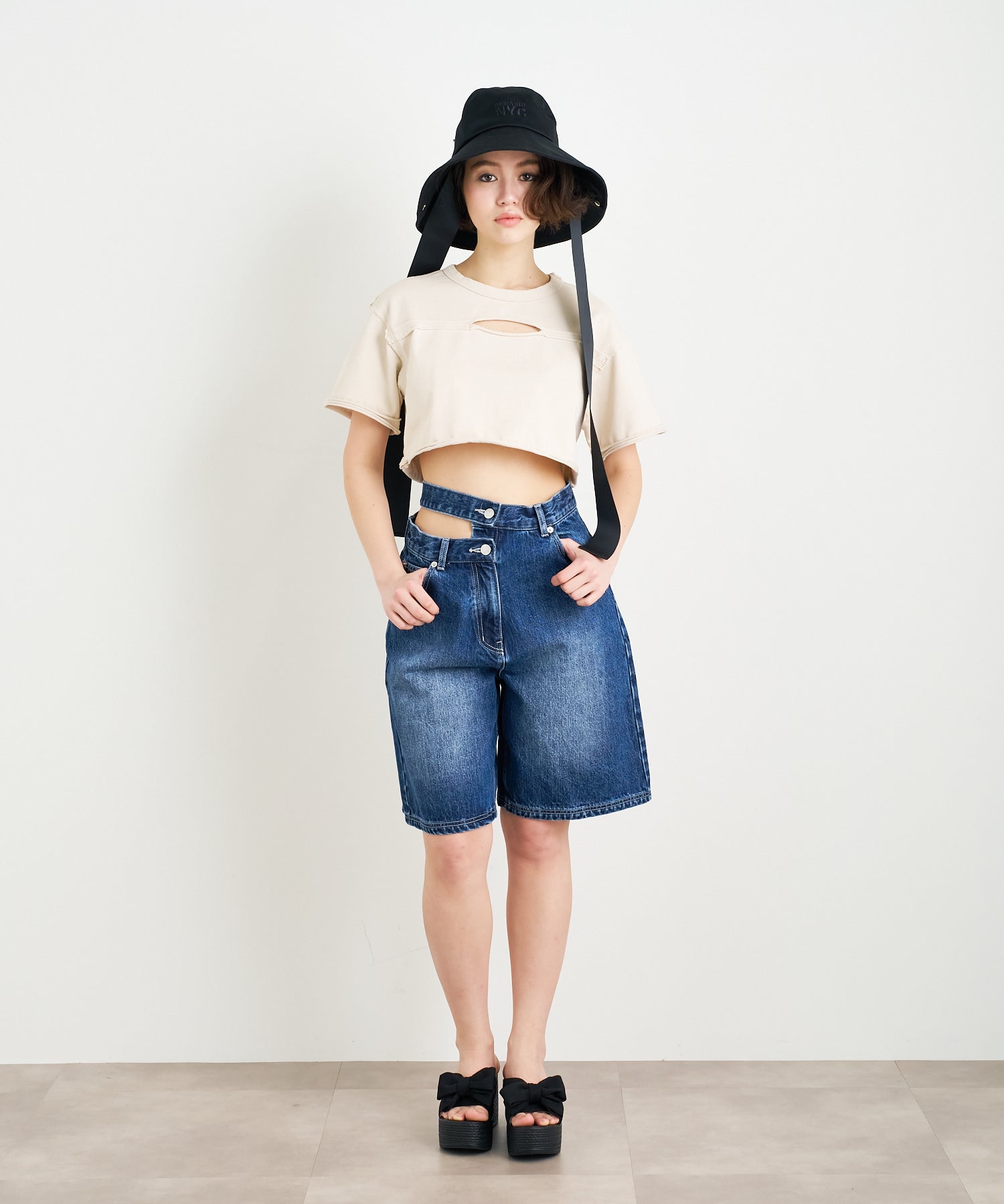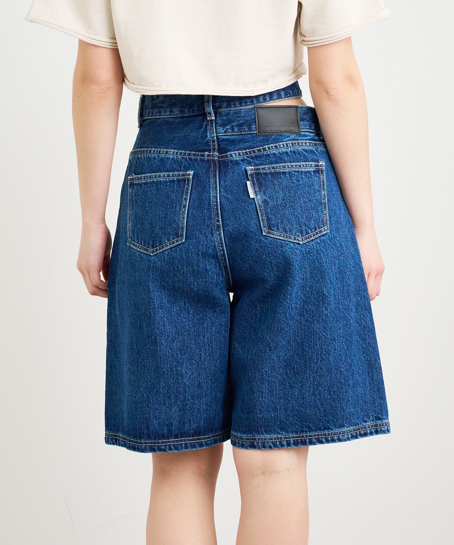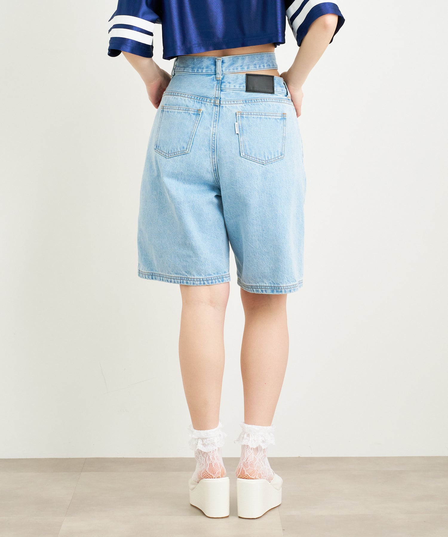 ゆったりとしたワイド巾のデニムハーフパンツ。ウエストが2段になっており、アシンメトリーなデザインがモード感溢れるデザインに!ベルトとベルトの間からチラリと見える腰元がセクシーさを表現してくれます。トップスをインしてベルトの隙間から見える服が遊び心あるスタイリングに!