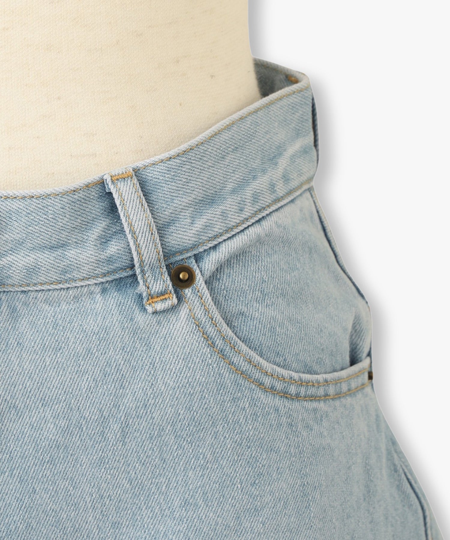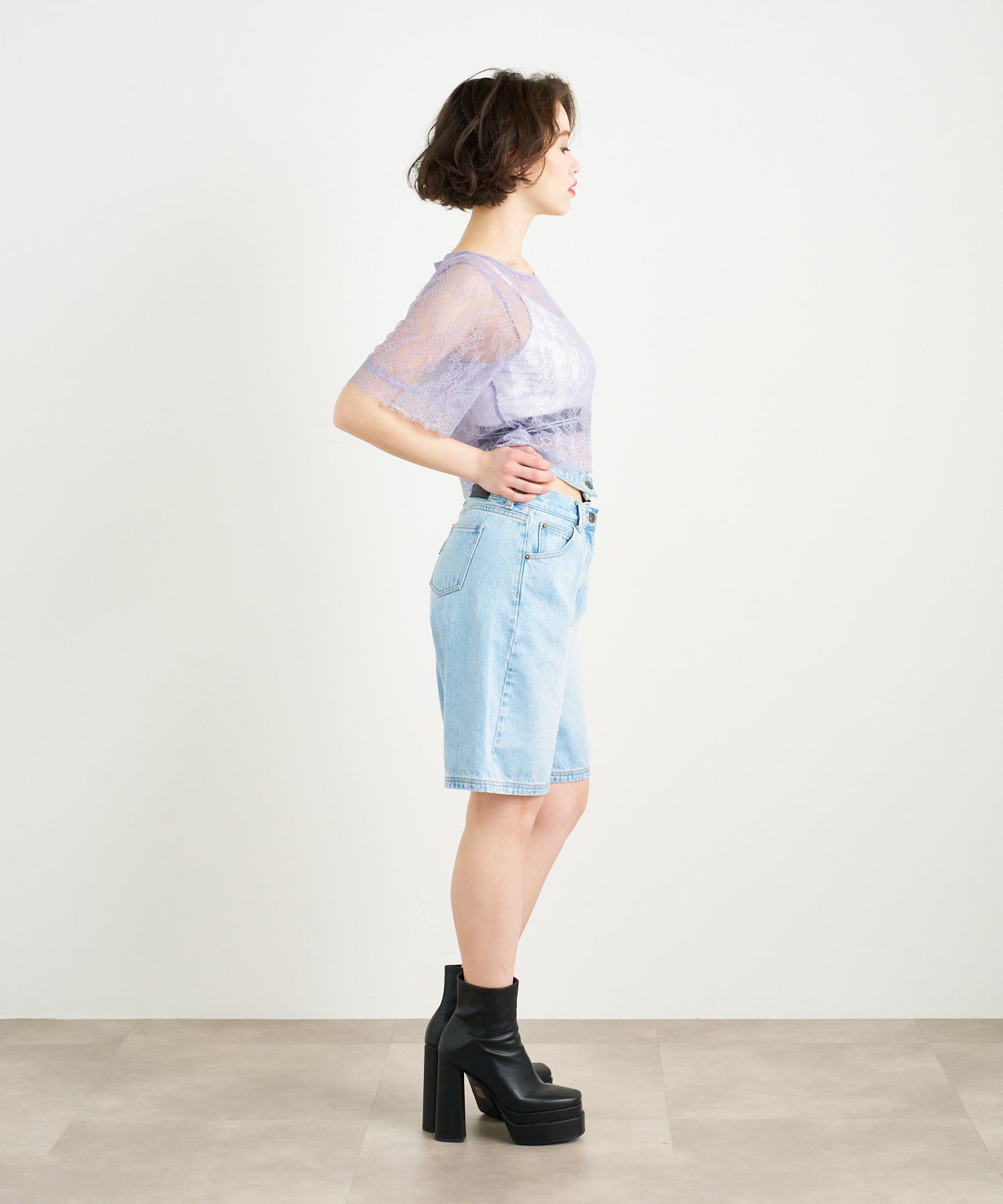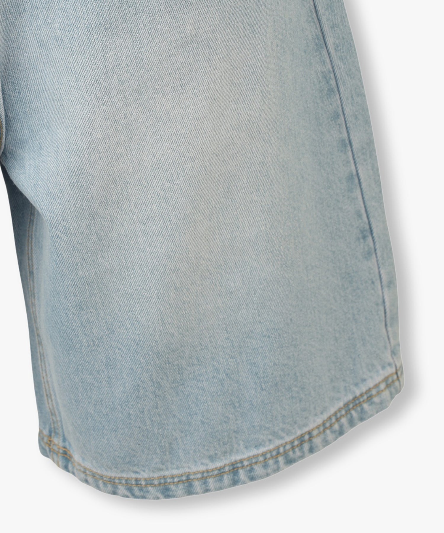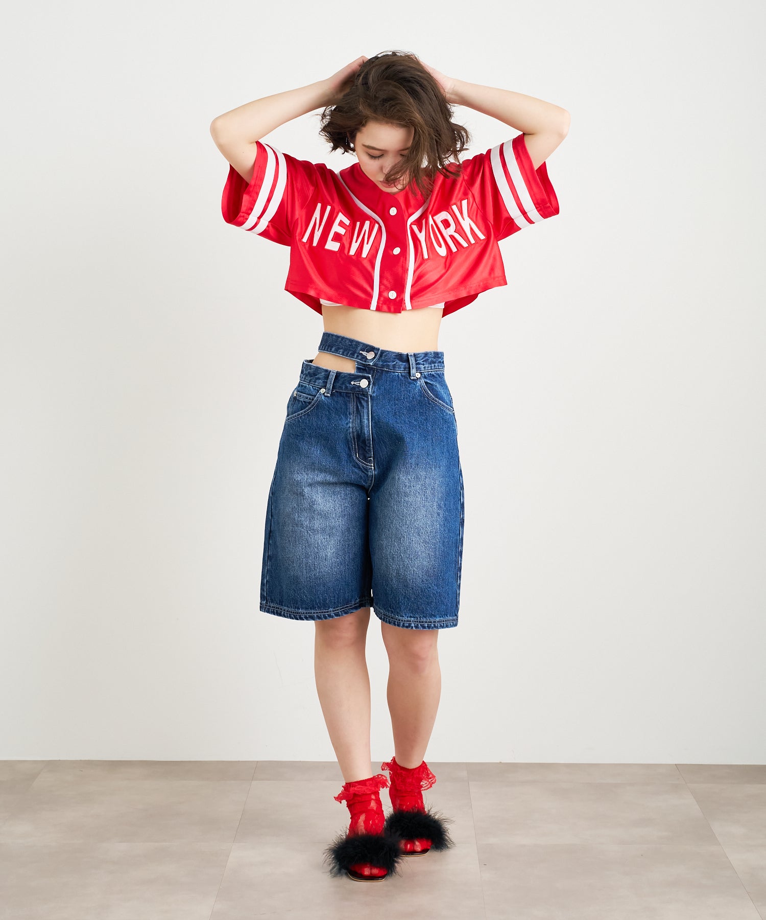 ゆったりとしたワイド巾のデニムハーフパンツ。ウエストが2段になっており、アシンメトリーなデザインがモード感溢れるデザインに!ベルトとベルトの間からチラリと見える腰元がセクシーさを表現してくれます。トップスをインしてベルトの隙間から見える服が遊び心あるスタイリングに!