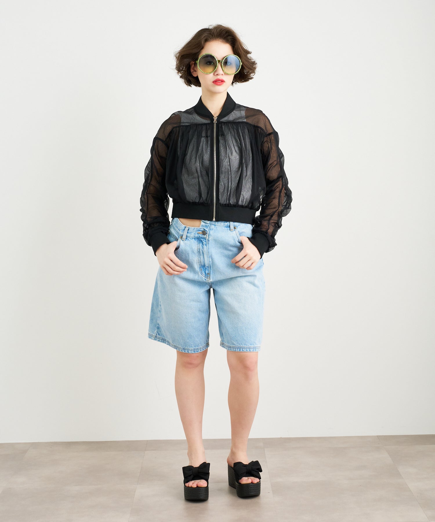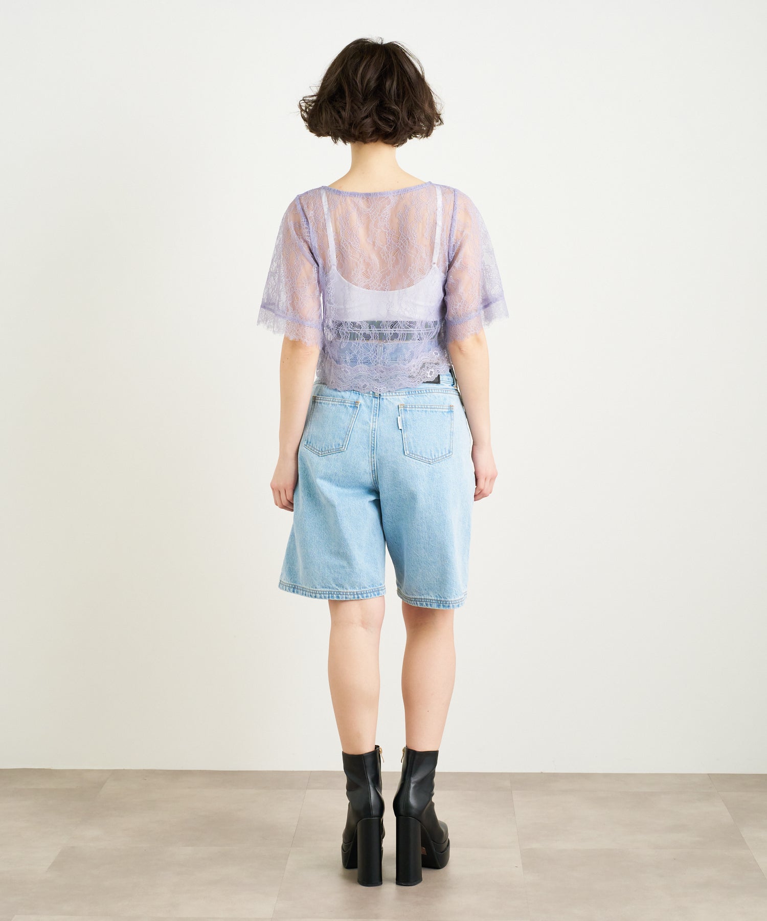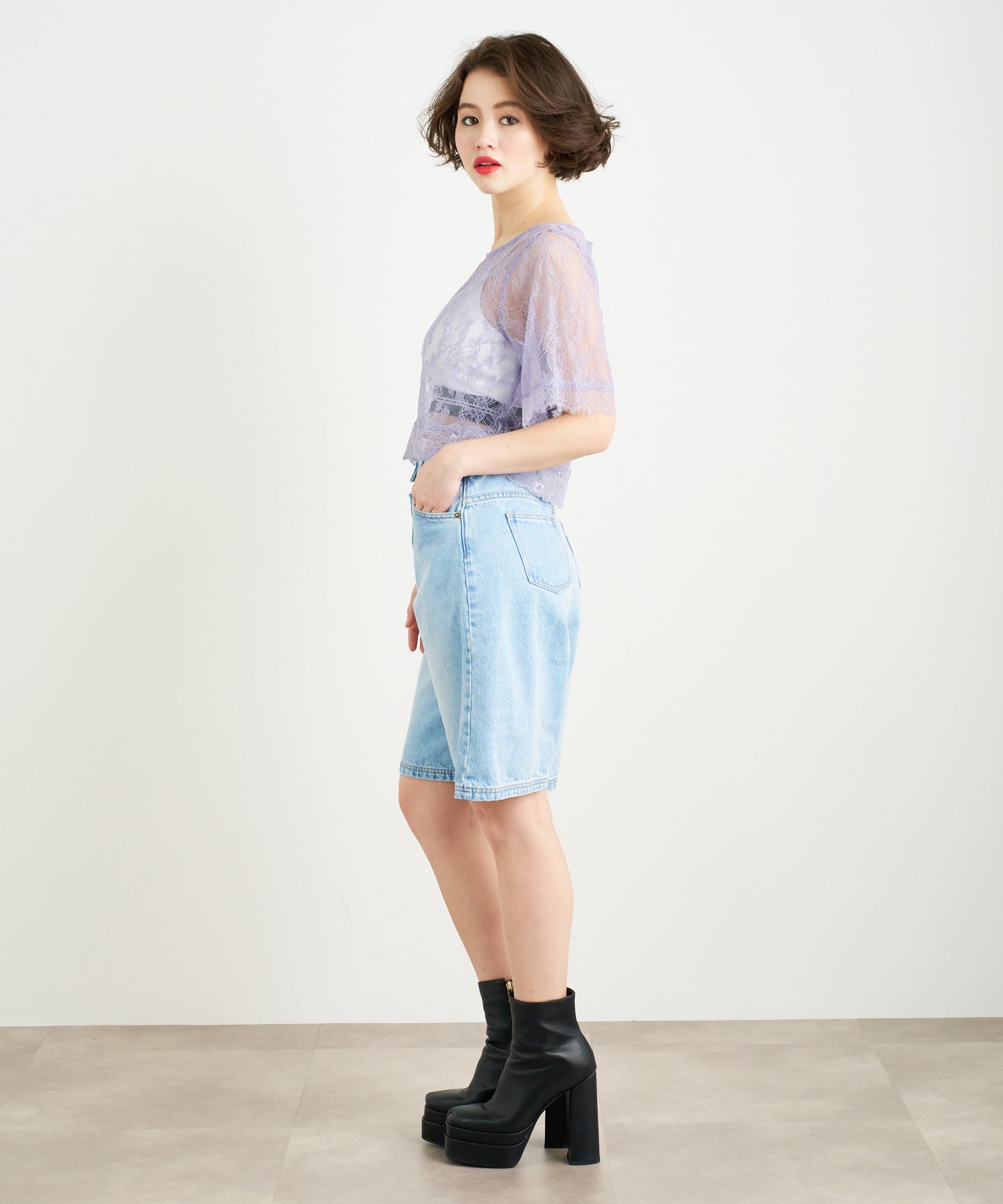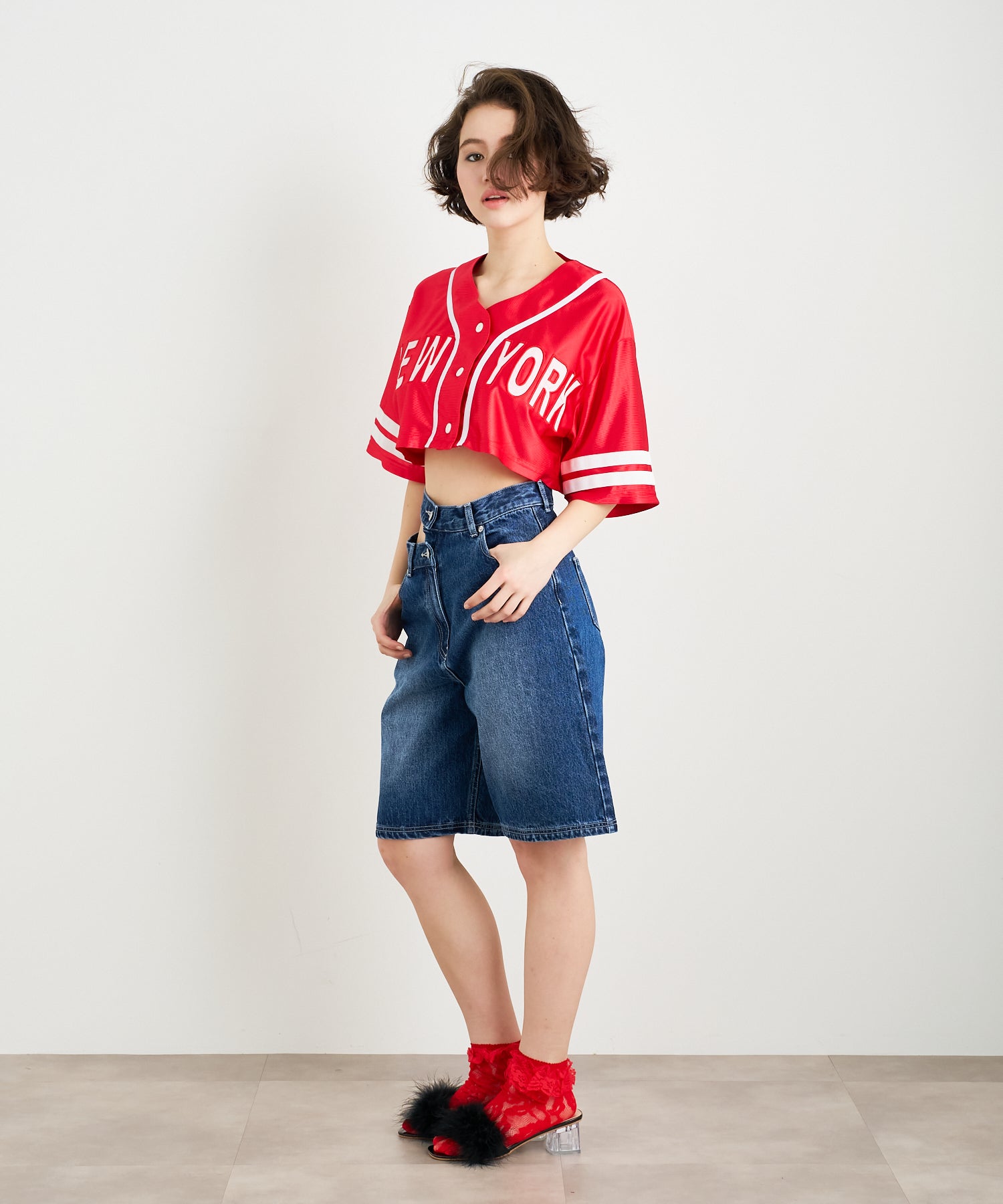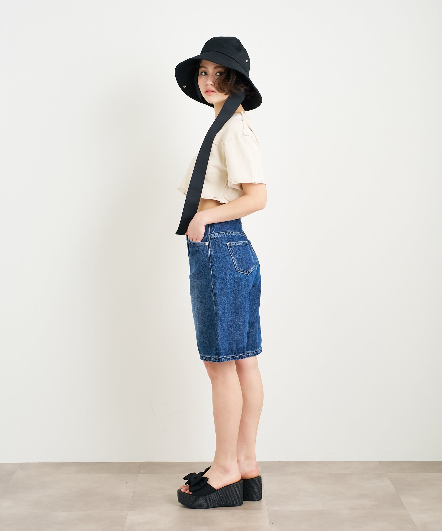 ゆったりとしたワイド巾のデニムハーフパンツ。ウエストが2段になっており、アシンメトリーなデザインがモード感溢れるデザインに!ベルトとベルトの間からチラリと見える腰元がセクシーさを表現してくれます。トップスをインしてベルトの隙間から見える服が遊び心あるスタイリングに!